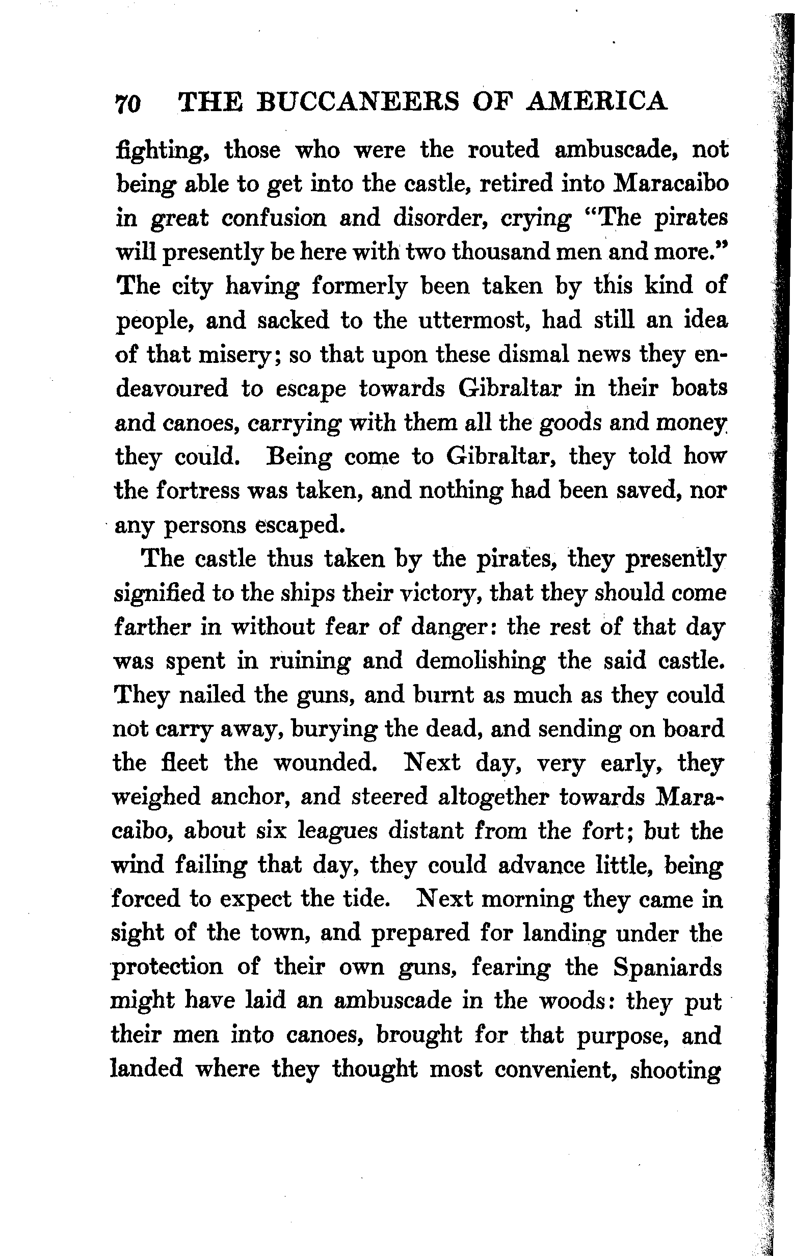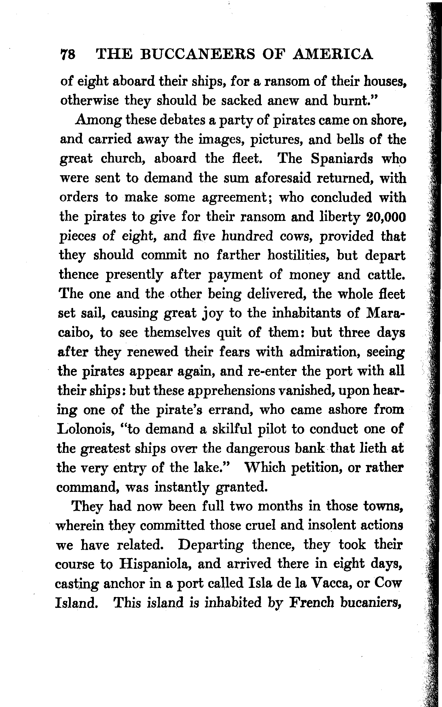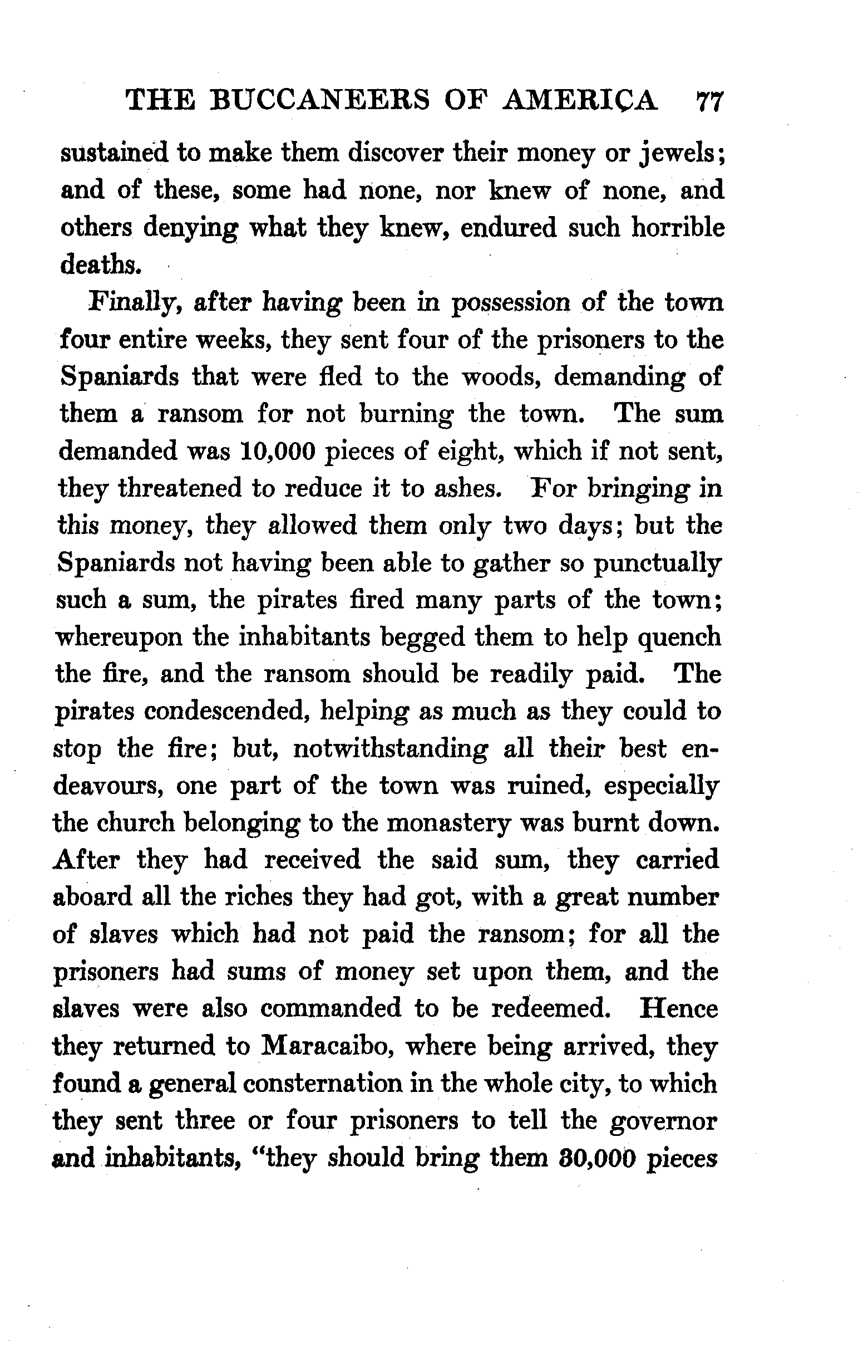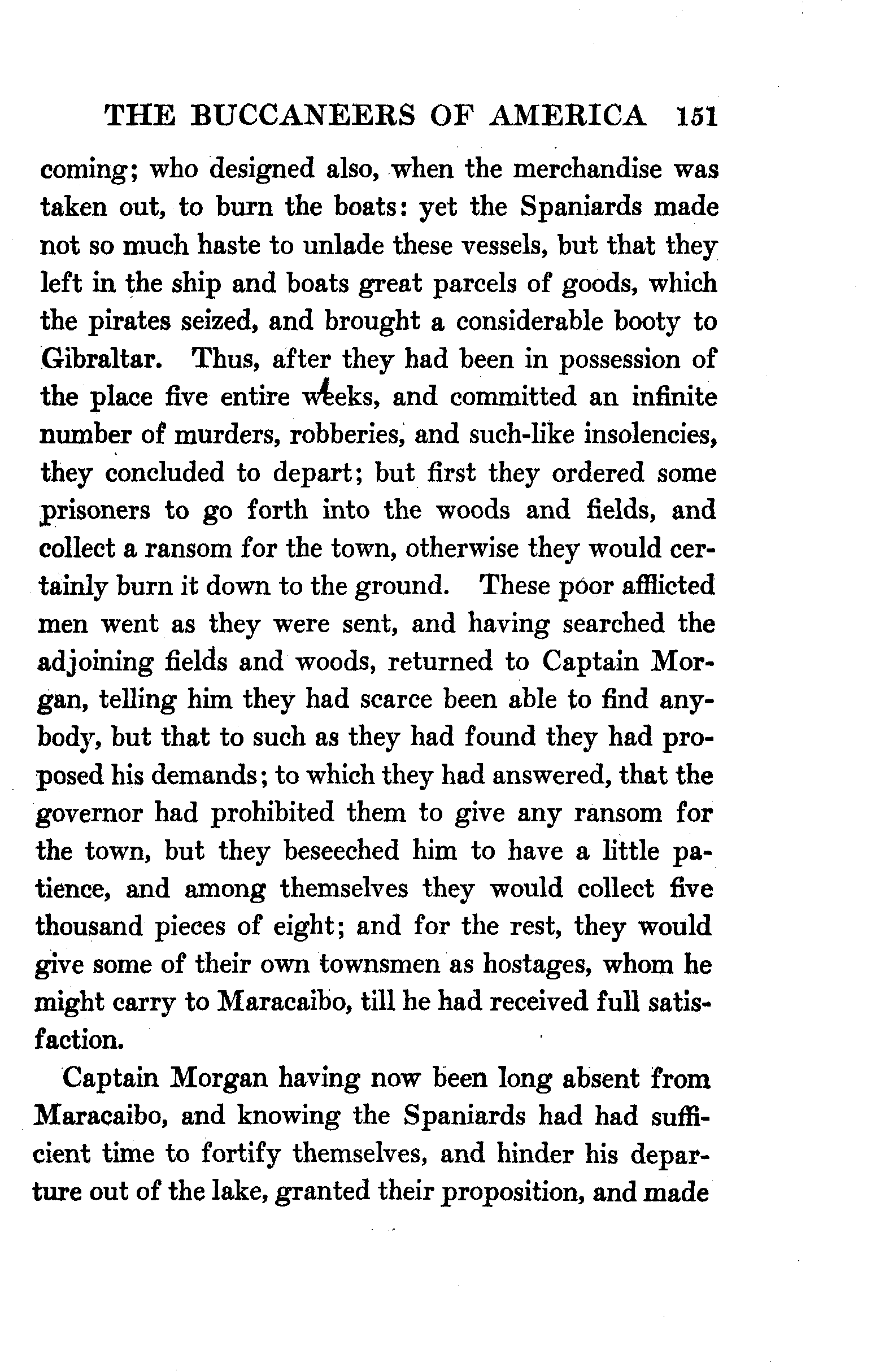 Then he sent again a messenger to the admiral, who was escaped ashore, and got into the castle, demanding of him a ransom of fire for Maracaibo; which being denied, he threatened entirely to consume and destroy it. The Spaniards considering the ill-luck they had all along[164] with those pirates, and not knowing how to get rid of them, concluded to pay the said ransom, though Don Alonso would not consent.