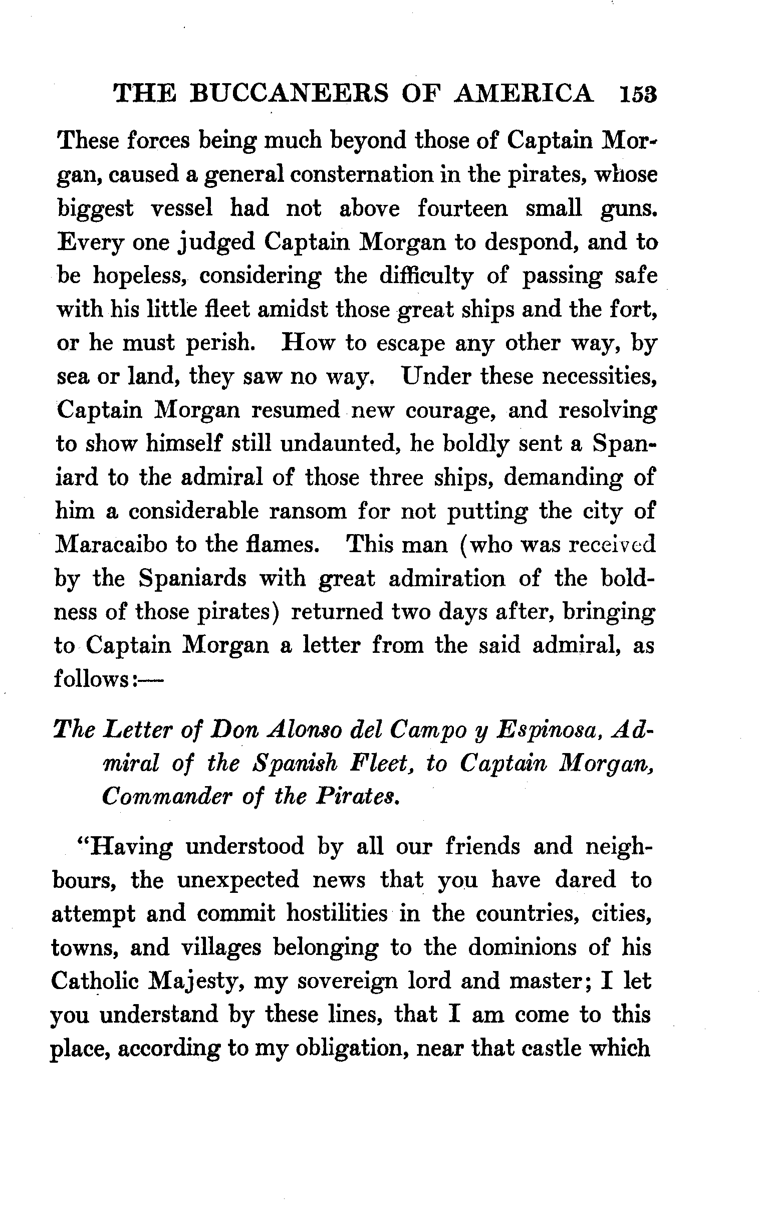 This relation could not choose but disturb the mind of Captain Morgan, who now was careful how to get away through the narrow entry of the lake: hereupon he sent his swiftest boat to view the entry, and see if things were as they had been related. Next day the boat came back, confirming what was said; assuring him, they had viewed the ships so nigh, that they had been in great danger of their shot, hereunto they added, that the biggest ship was mounted with forty guns, the second with thirty, and the smallest with twenty-four.[153] These forces being much beyond those of Captain Morgan, caused a general consternation in the pirates, whose biggest vessel had not above fourteen small guns. Every one judged Captain Morgan to despond, and to be hopeless, considering the difficulty of passing safe with his little fleet amidst those great ships and the fort, or he must perish. How to escape any other way, by sea or land, they saw no way. Under these necessities, Captain Morgan resumed new courage, and resolving to show himself still undaunted, he boldly sent a Spaniard to the admiral of those three ships, demanding of him a considerable ransom for not putting the city of Maracaibo to the flames. This man (who was received by the Spaniards with great admiration of the boldness of those pirates) returned two days after, bringing to Captain Morgan a letter from the said admiral, as follows:—