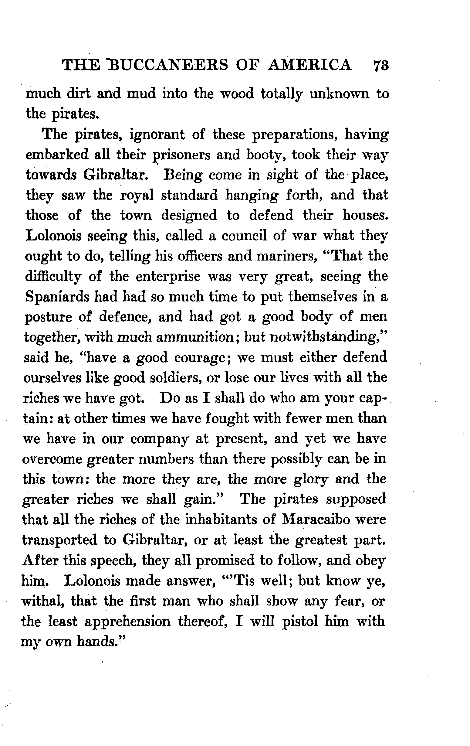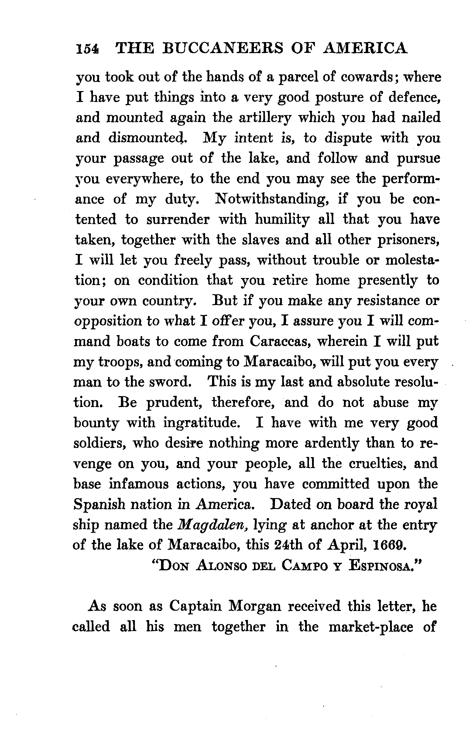 As soon as Captain Morgan received this letter, he called all his men together in the market-place of[155] Maracaibo, and after reading the contents thereof, both in French and English, asked their advice and resolution on the whole matter, and whether they had rather surrender all they had got to obtain their liberty, than fight for it.