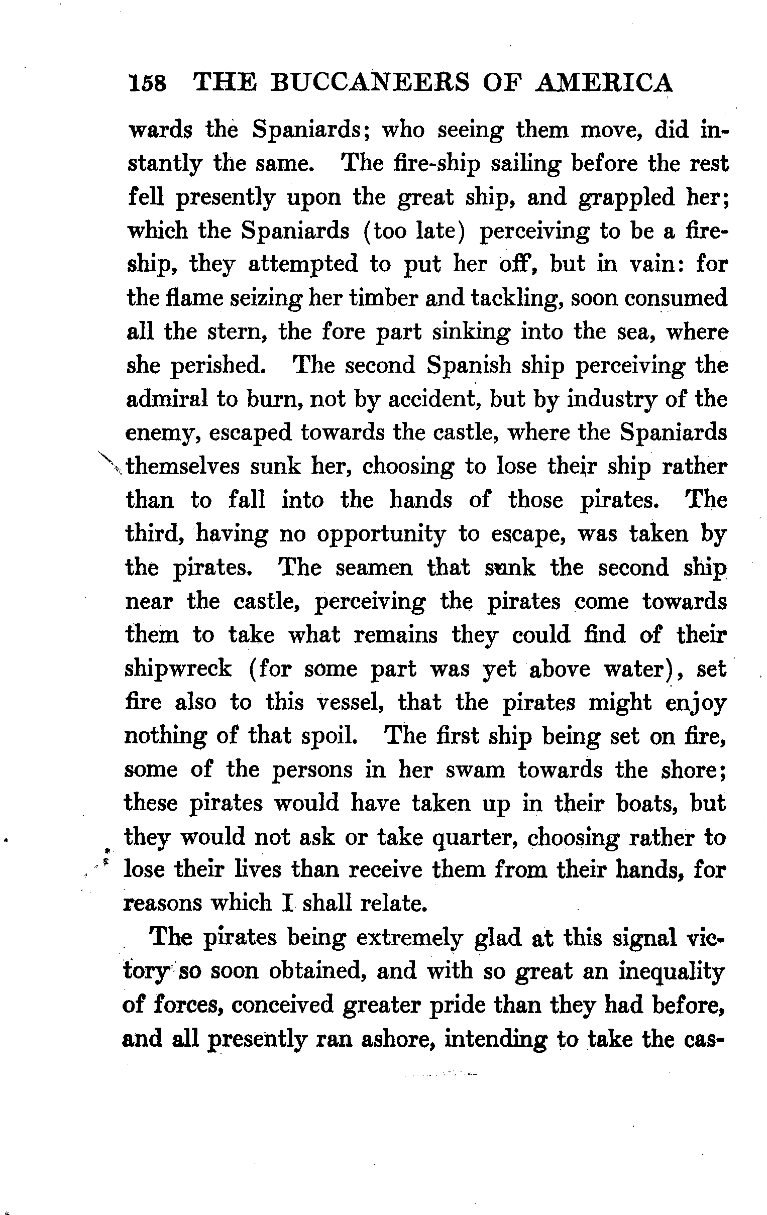 With this courageous resolution they set sail to seek the Spaniards. On April 30, 1669, they found the Spanish fleet riding at anchor in the middle of the entry of the lake. Captain Morgan, it being now late and almost dark, commanded all his vessels to an anchor, designing to fight even all night if they forced him to it. He ordered a careful watch to be kept aboard every vessel till morning, they being almost within shot, as well as within sight of the enemy. The day dawning, they weighed anchor, and sailed again, steering directly to[158]wards the Spaniards; who seeing them move, did instantly the same. The fire-ship sailing before the rest fell presently upon the great ship, and grappled her; which the Spaniards (too late) perceiving to be a fire-ship, they attempted to put her off, but in vain: for the flame seizing her timber and tackling, soon consumed all the stern, the fore part sinking into the sea, where she perished. The second Spanish ship perceiving the admiral to burn, not by accident, but by industry of the enemy, escaped towards the castle, where the Spaniards themselves sunk her, choosing to lose their ship rather than to fall into the hands of those pirates. The third, having no opportunity to escape, was taken by the pirates. The seamen that sunk the second ship near the castle, perceiving the pirates come towards them to take what remains they could find of their shipwreck (for some part was yet above water), set fire also to this vessel, that the pirates might enjoy nothing of that spoil. The first ship being set on fire, some of the persons in her swam towards the shore; these pirates would have taken up in their boats, but they would not ask or take quarter, choosing rather to lose their lives than receive them from their hands, for reasons which I shall relate.