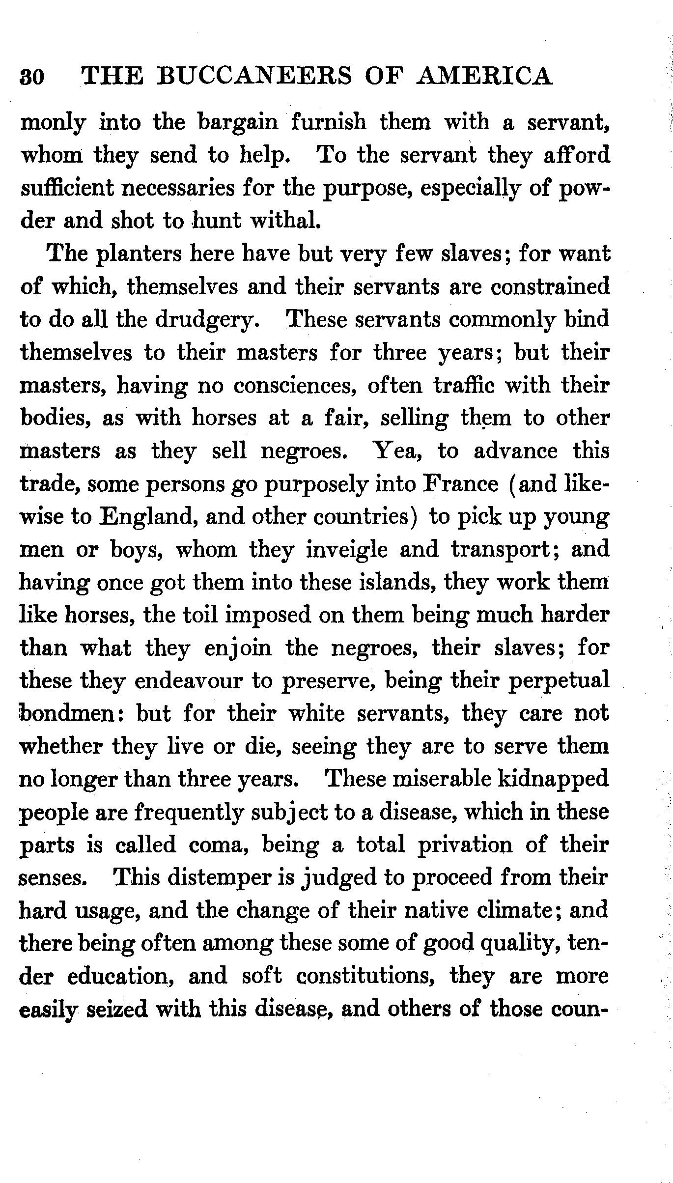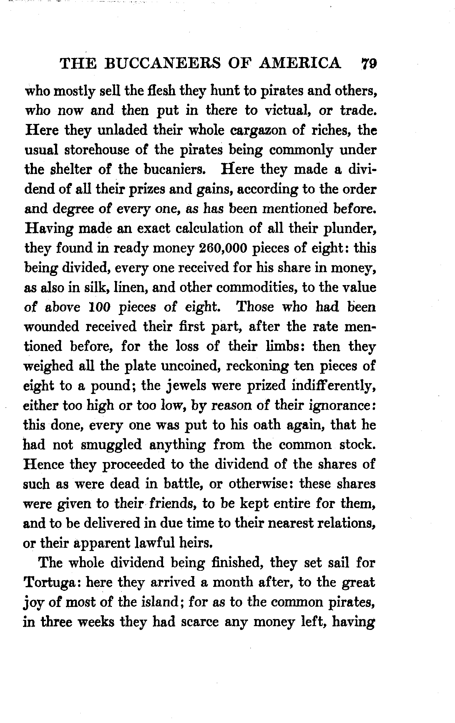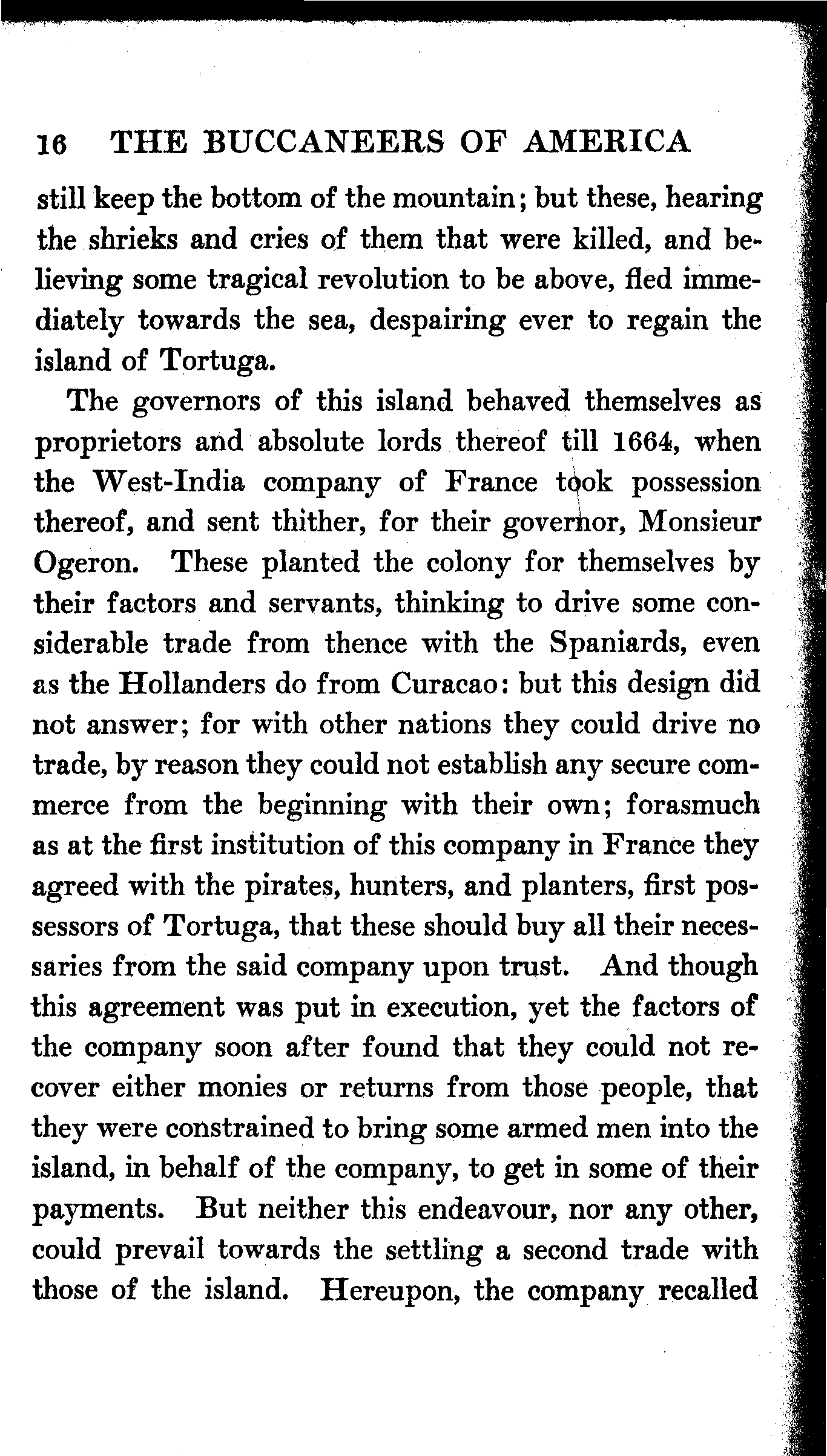 Of the author, John Esquemeling, very little is known although it is generally conceded that he was in all probability a Fleming or Hollander, a quite natural supposition as his first works were written in the Dutch language. He came to the island of Tortuga, the headquarters of the Buccaneers, in 1666 in the employ of the French West India Company. Several years later this same company, owing to unsuccessful business arrangements, recalled their representatives to France and gave their officers orders to sell the company's land and all its servants. Esquemeling then a servant of the company was sold to a stern master by whom he was treated with great cruelty. Owing to hard work, poor food and exposure he became dangerously ill, and his master seeing his weak condition and fearing to lose the money Esquemeling had cost him resold him to a surgeon.[xii] This new master treated him kindly so that Esquemeling's health was speedily restored, and after one year's service he was set at liberty upon a promise to pay his benefactor, the surgeon, 100 pieces of eight at such a time as he found himself in funds.