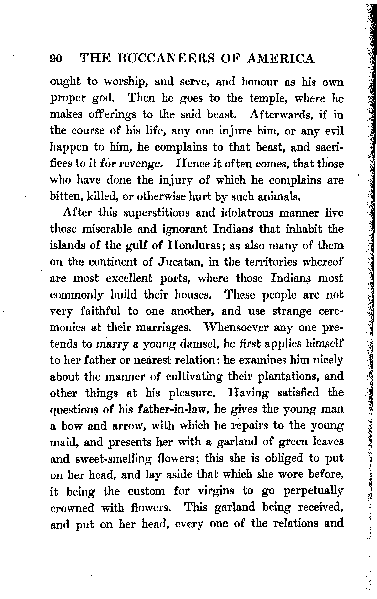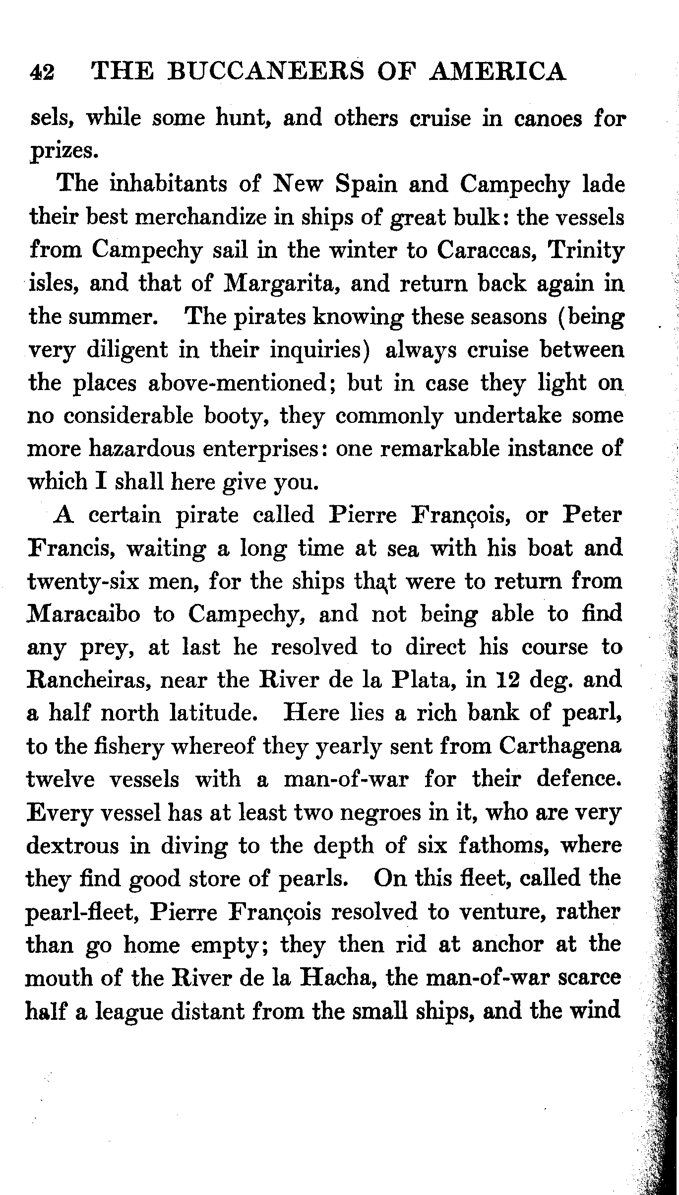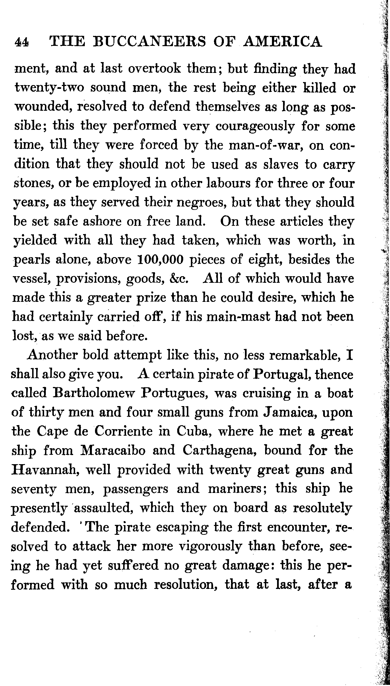Of the author, John Esquemeling, very little is known although it is generally conceded that he was in all probability a Fleming or Hollander, a quite natural supposition as his first works were written in the Dutch language. He came to the island of Tortuga, the headquarters of the Buccaneers, in 1666 in the employ of the French West India Company. Several years later this same company, owing to unsuccessful business arrangements, recalled their representatives to France and gave their officers orders to sell the company's land and all its servants. Esquemeling then a servant of the company was sold to a stern master by whom he was treated with great cruelty. Owing to hard work, poor food and exposure he became dangerously ill, and his master seeing his weak condition and fearing to lose the money Esquemeling had cost him resold him to a surgeon.[xii] This new master treated him kindly so that Esquemeling's health was speedily restored, and after one year's service he was set at liberty upon a promise to pay his benefactor, the surgeon, 100 pieces of eight at such a time as he found himself in funds.