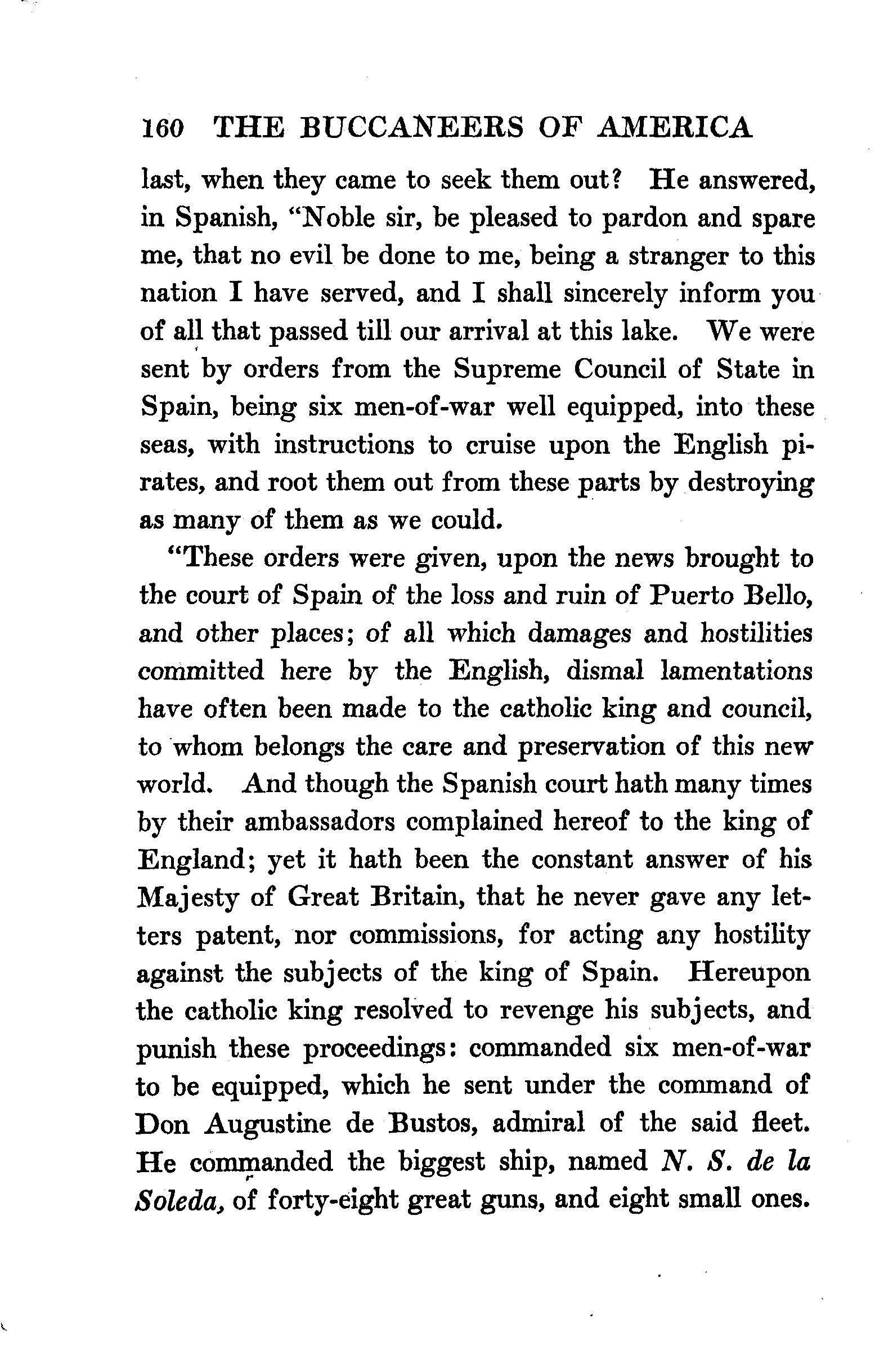 But Captain Morgan intended not to come again, busying himself next day in taking prisoners some of the men who still swam alive, hoping to get part of the riches lost in the two ships that perished. Among the rest, he took a pilot, who was a stranger, and who belonged to the lesser ship of the two, of whom he inquired several things; as, What number of people those three ships had in them? Whether they expected any more ships to come? From what port they set forth[160] last, when they came to seek them out? He answered, in Spanish, "Noble sir, be pleased to pardon and spare me, that no evil be done to me, being a stranger to this nation I have served, and I shall sincerely inform you of all that passed till our arrival at this lake. We were sent by orders from the Supreme Council of State in Spain, being six men-of-war well equipped, into these seas, with instructions to cruise upon the English pirates, and root them out from these parts by destroying as many of them as we could.