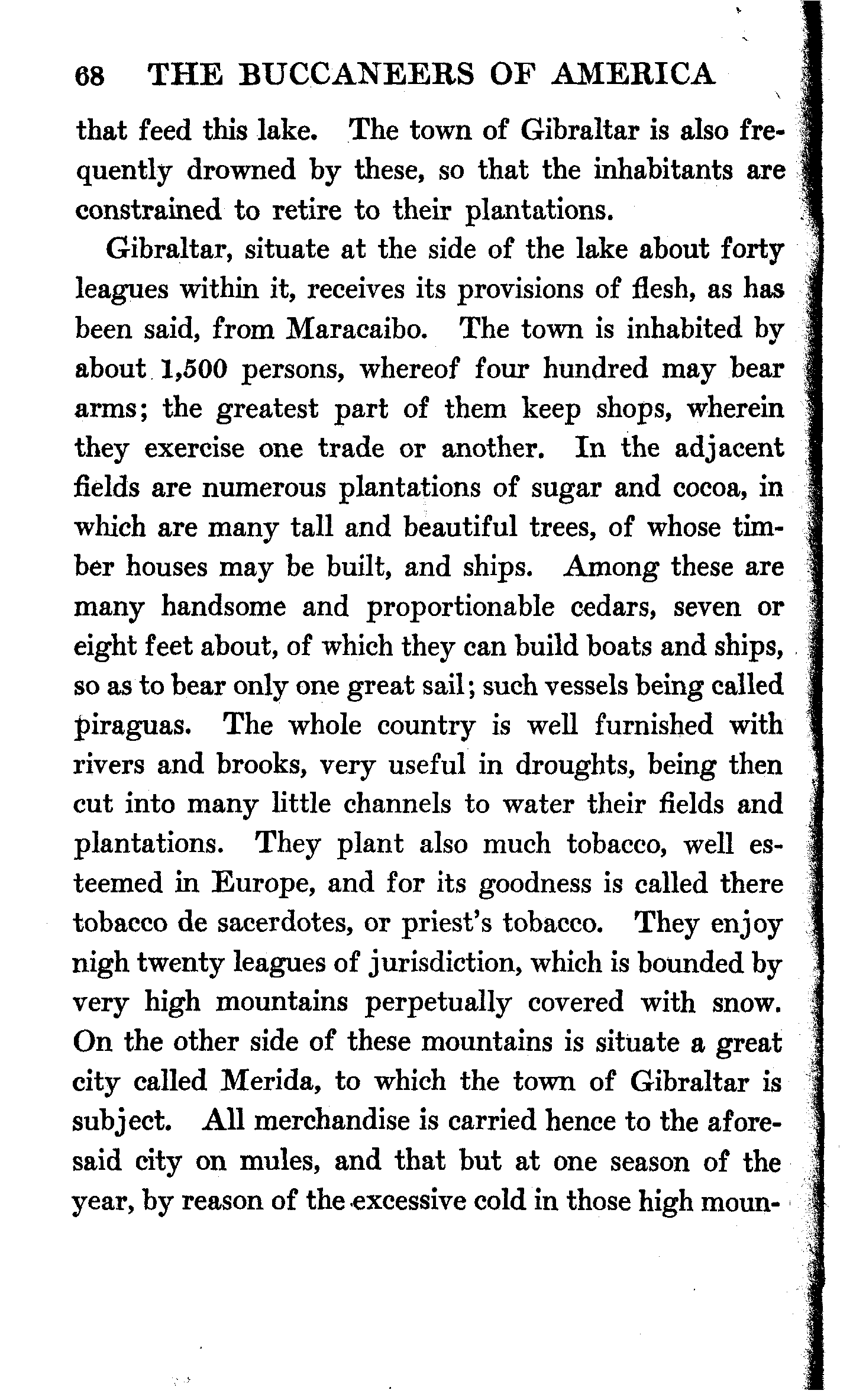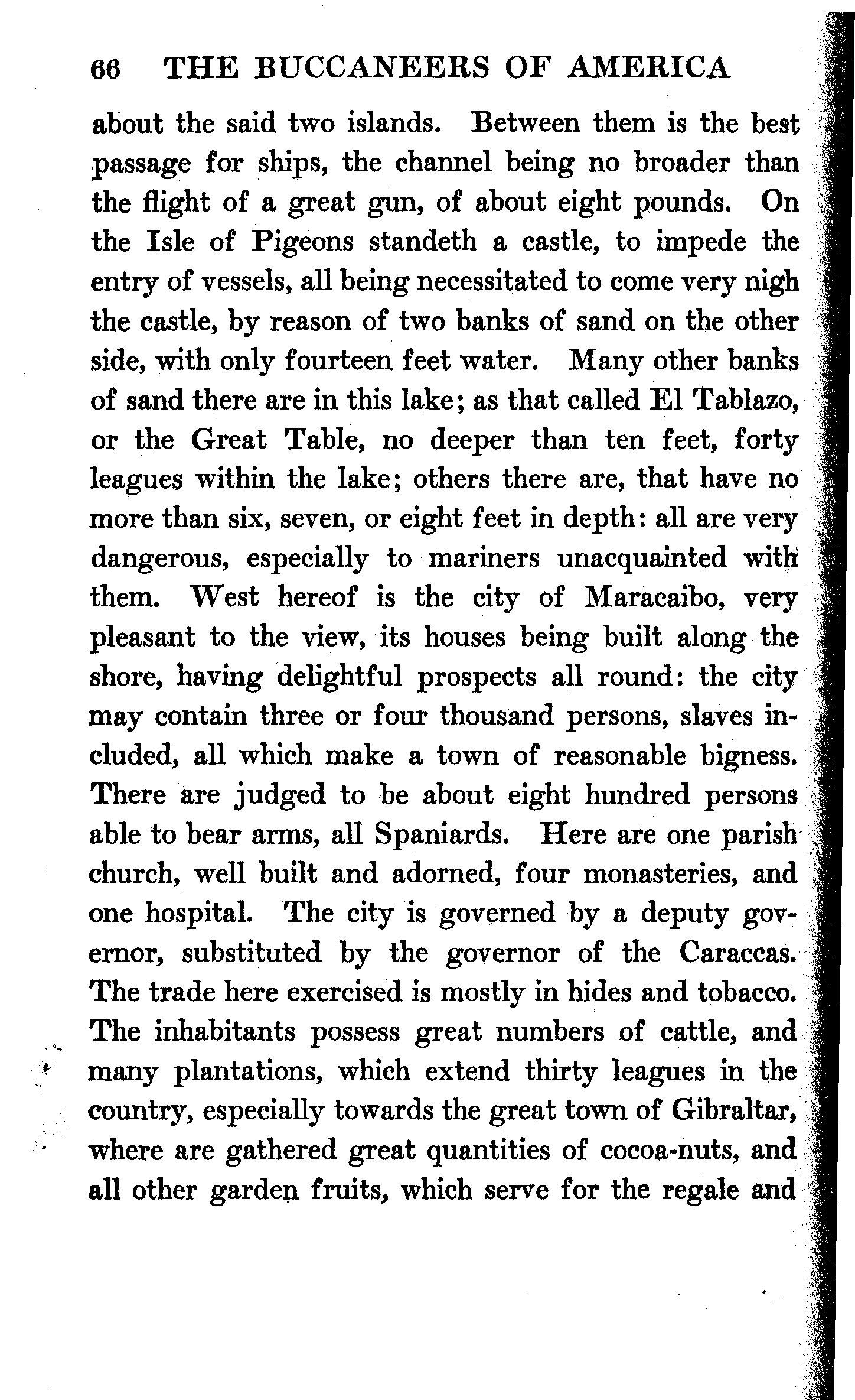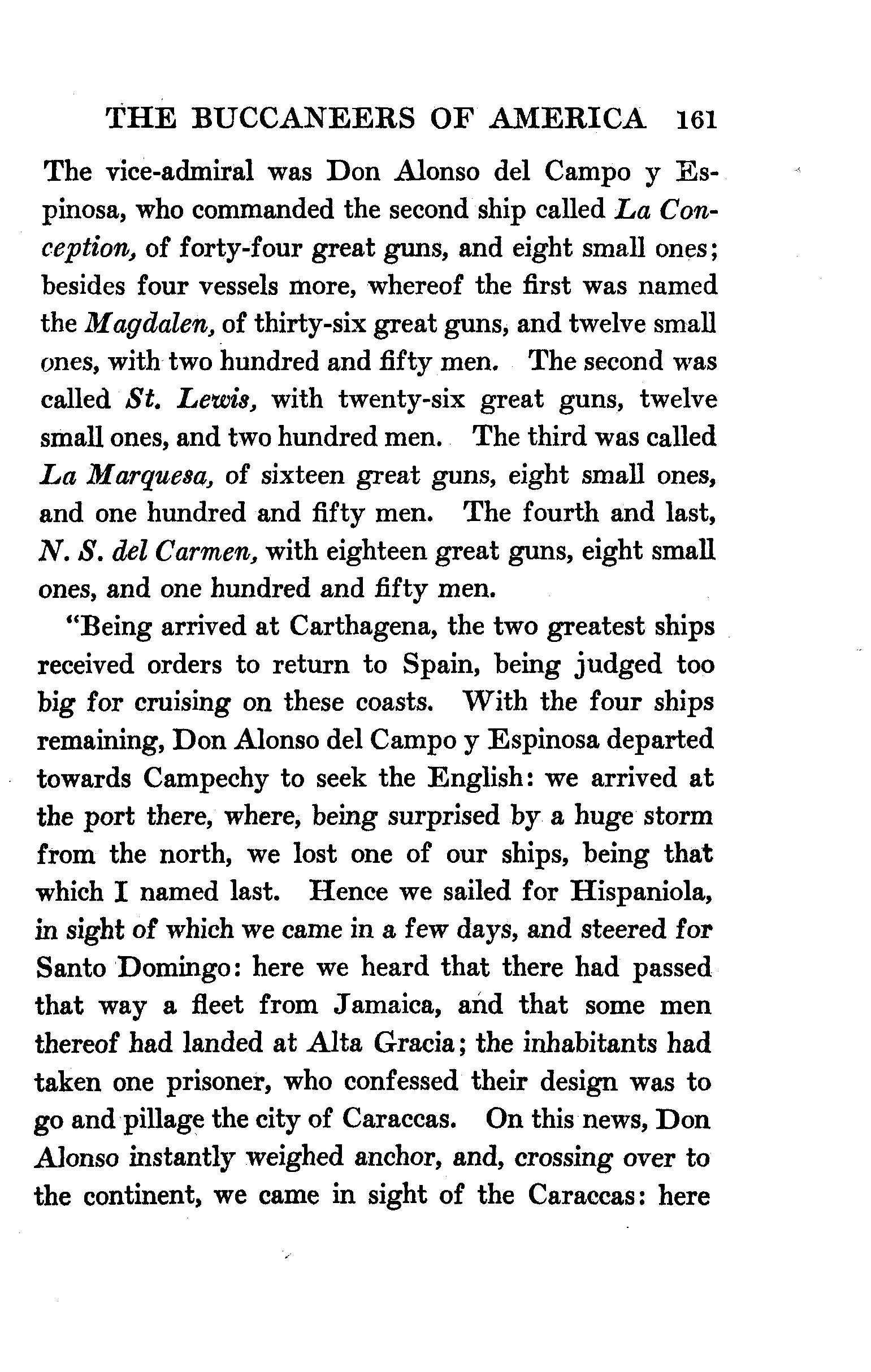 "Being arrived at Carthagena, the two greatest ships received orders to return to Spain, being judged too big for cruising on these coasts. With the four ships remaining, Don Alonso del Campo y Espinosa departed towards Campechy to seek the English: we arrived at the port there, where, being surprised by a huge storm from the north, we lost one of our ships, being that which I named last. Hence we sailed for Hispaniola, in sight of which we came in a few days, and steered for Santo Domingo: here we heard that there had passed that way a fleet from Jamaica, and that some men thereof had landed at Alta Gracia; the inhabitants had taken one prisoner, who confessed their design was to go and pillage the city of Caraccas. On this news, Don Alonso instantly weighed anchor, and, crossing over to the continent, we came in sight of the Caraccas: here[162] we found them not, but met with a boat, which certified us they were in the lake of Maracaibo, and that the fleet consisted of seven small ships, and one boat.