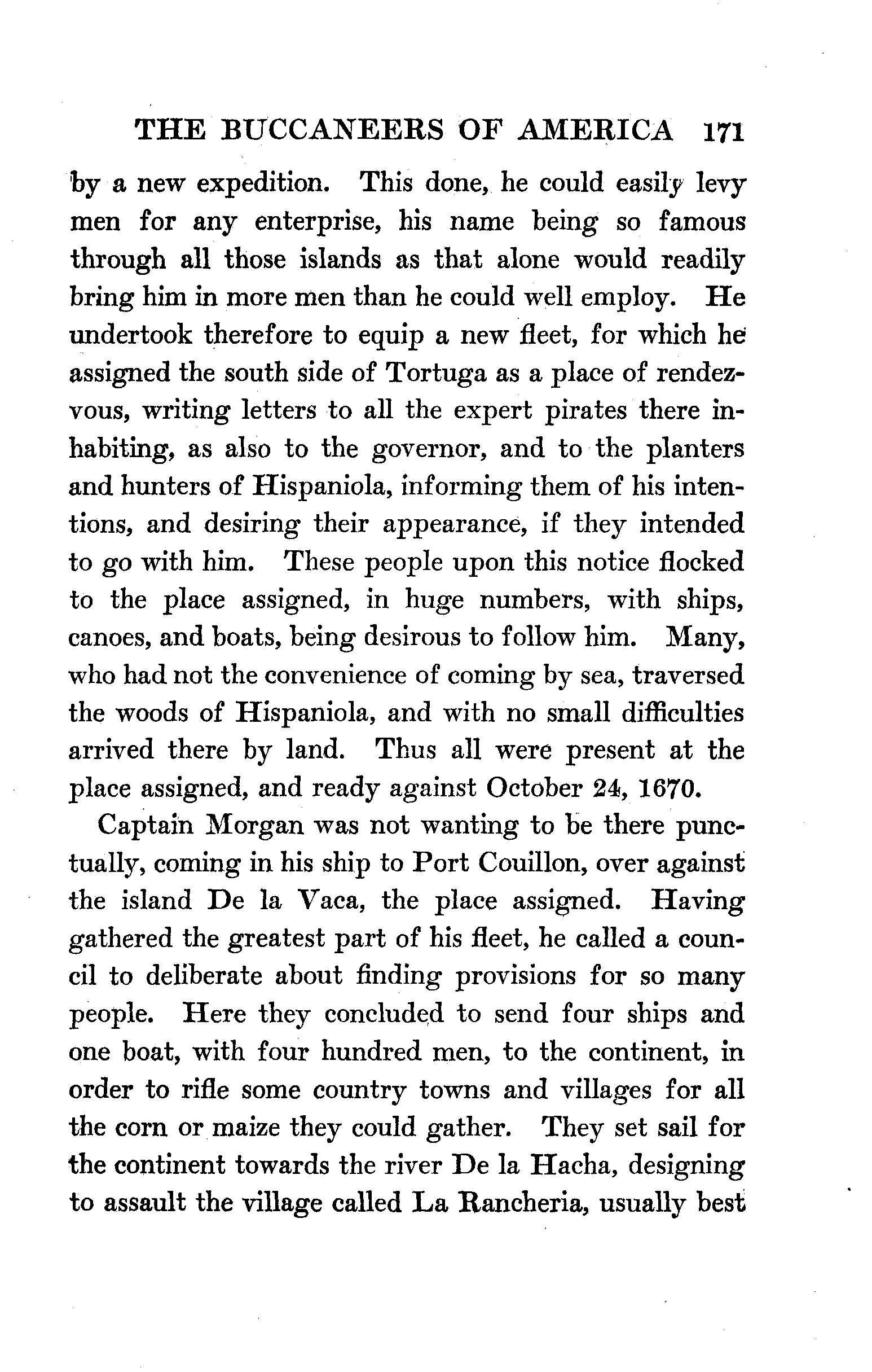 Captain Morgan, willing to follow Fortune's call, stopped the mouths of many inhabitants of Jamaica, who were creditors to his men for large sums, with the hopes and promises of greater achievements than ever,[171] by a new expedition. This done, he could easily levy men for any enterprise, his name being so famous through all those islands as that alone would readily bring him in more men than he could well employ. He undertook therefore to equip a new fleet, for which he assigned the south side of Tortuga as a place of rendezvous, writing letters to all the expert pirates there inhabiting, as also to the governor, and to the planters and hunters of Hispaniola, informing them of his intentions, and desiring their appearance, if they intended to go with him. These people upon this notice flocked to the place assigned, in huge numbers, with ships, canoes, and boats, being desirous to follow him. Many, who had not the convenience of coming by sea, traversed the woods of Hispaniola, and with no small difficulties arrived there by land. Thus all were present at the place assigned, and ready against October 24, 1670.