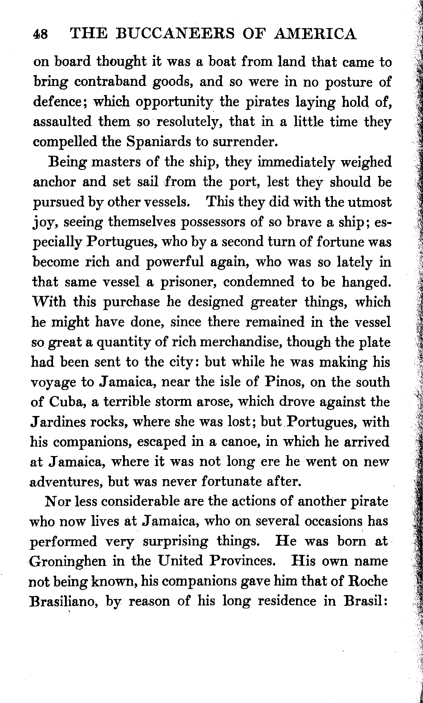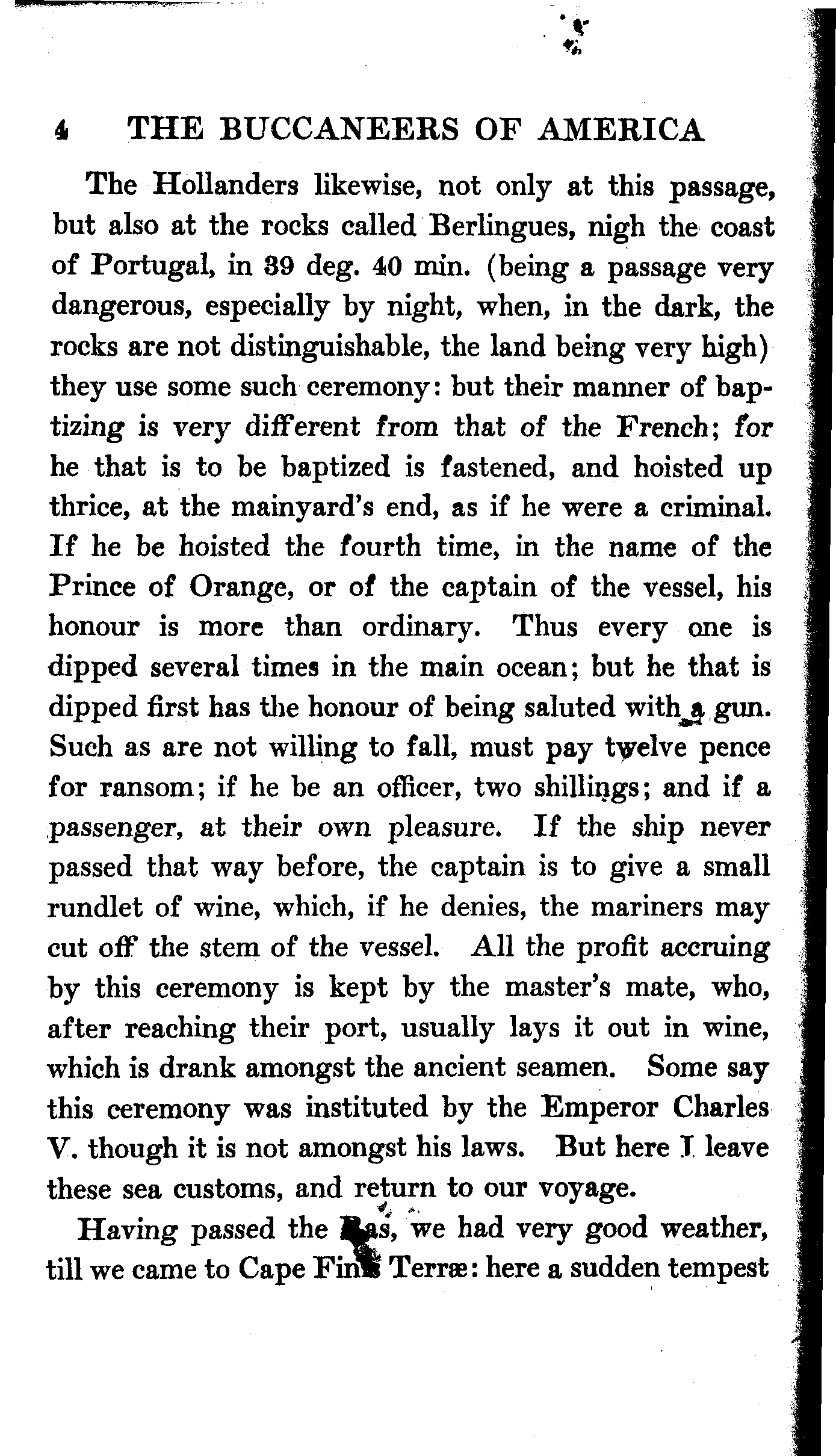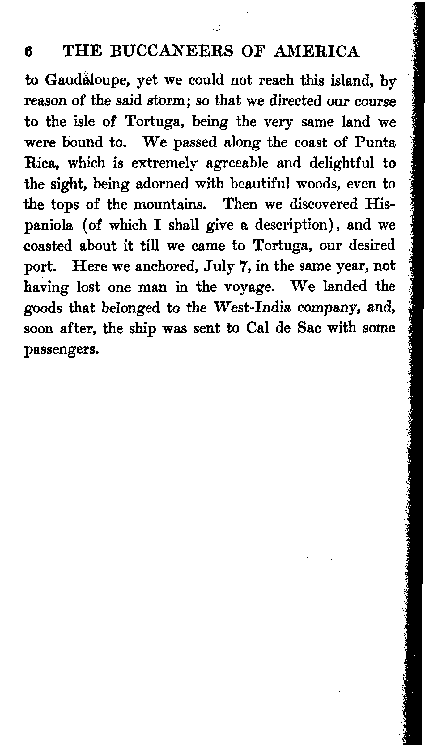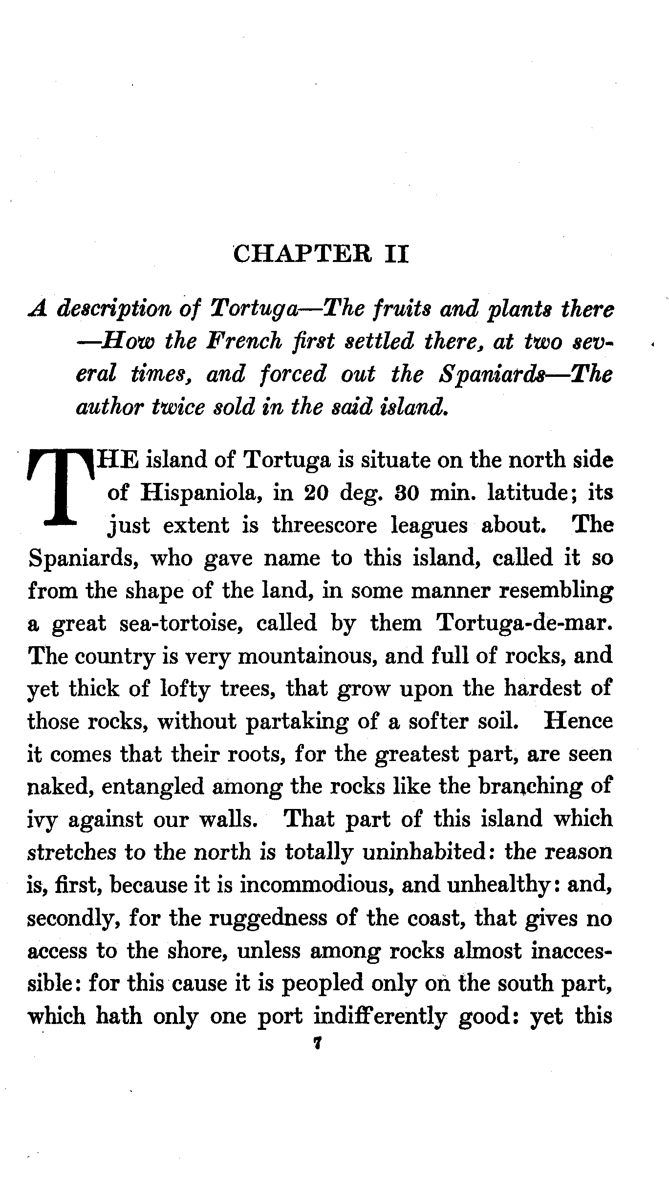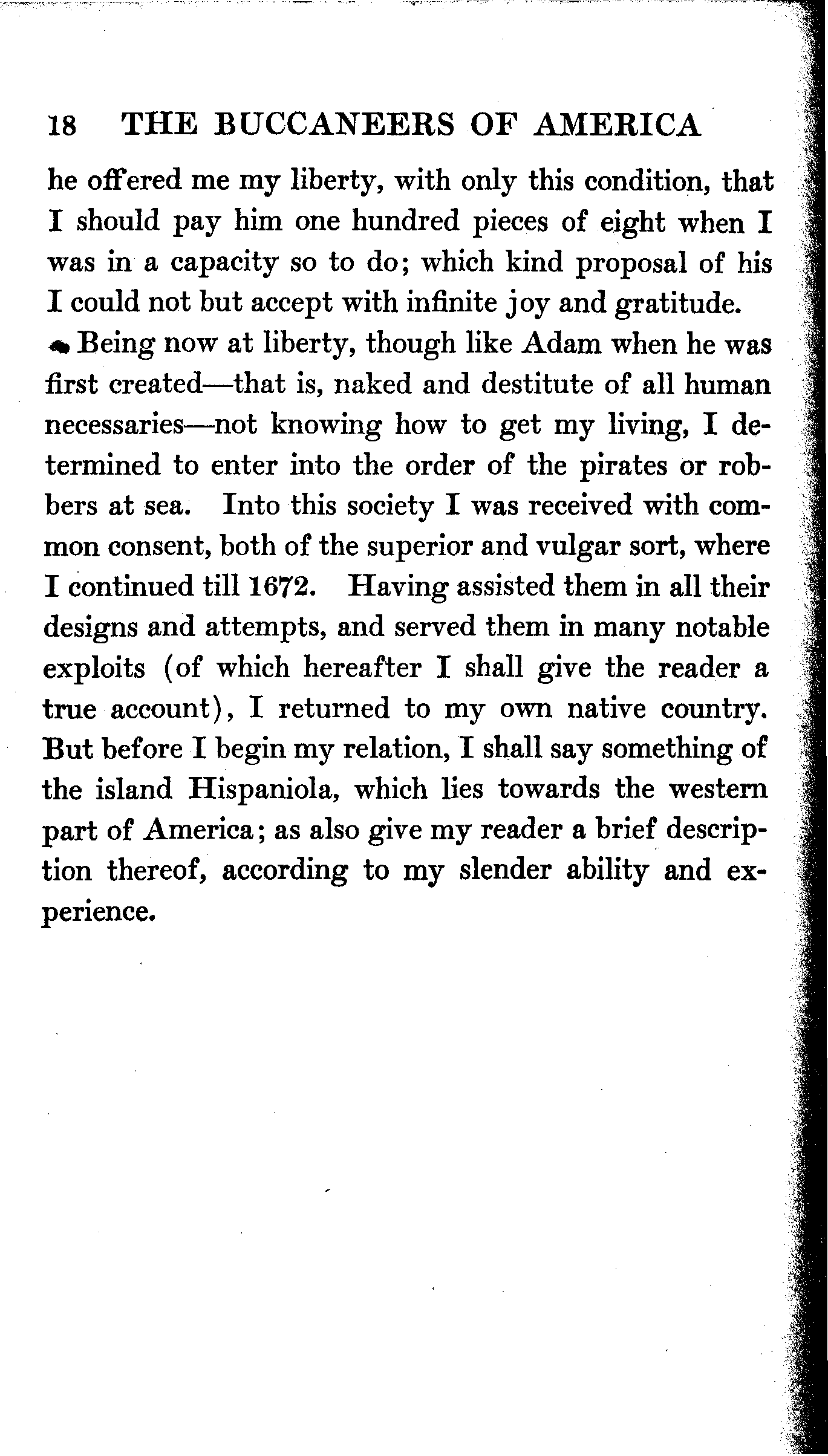 Being now at liberty, though like Adam when he was first created—that is, naked and destitute of all human necessaries—not knowing how to get my living, I determined to enter into the order of the pirates or robbers at sea. Into this society I was received with common consent, both of the superior and vulgar sort, where I continued till 1672. Having assisted them in all their designs and attempts, and served them in many notable exploits (of which hereafter I shall give the reader a true account), I returned to my own native country. But before I begin my relation, I shall say something of the island Hispaniola, which lies towards the western part of America; as also give my reader a brief description thereof, according to my slender ability and experience.[19]