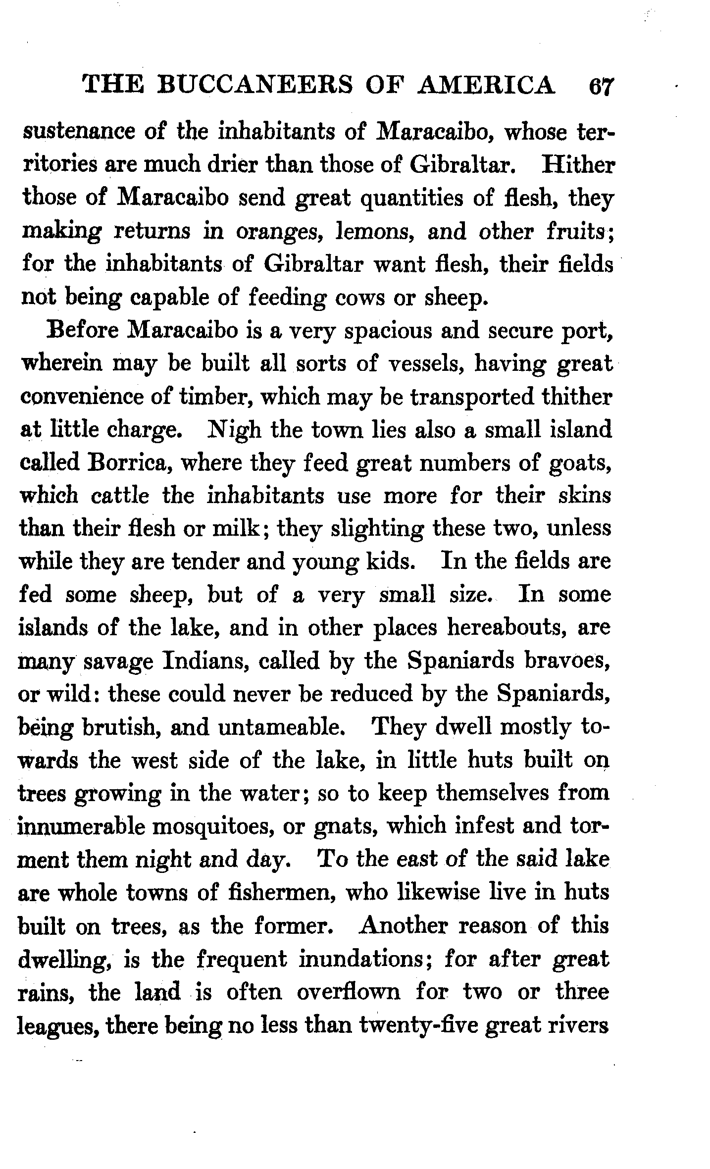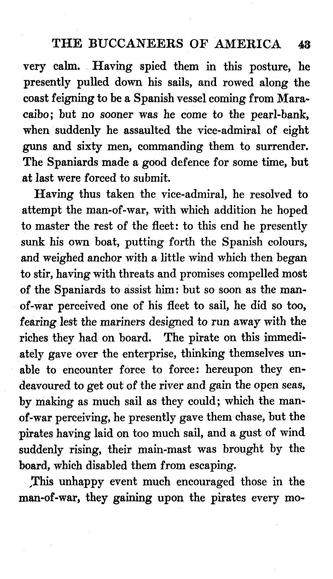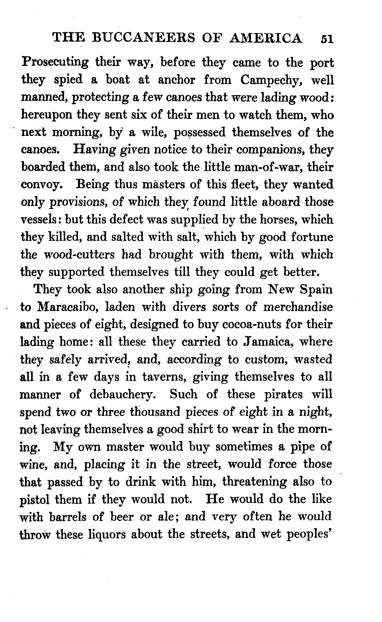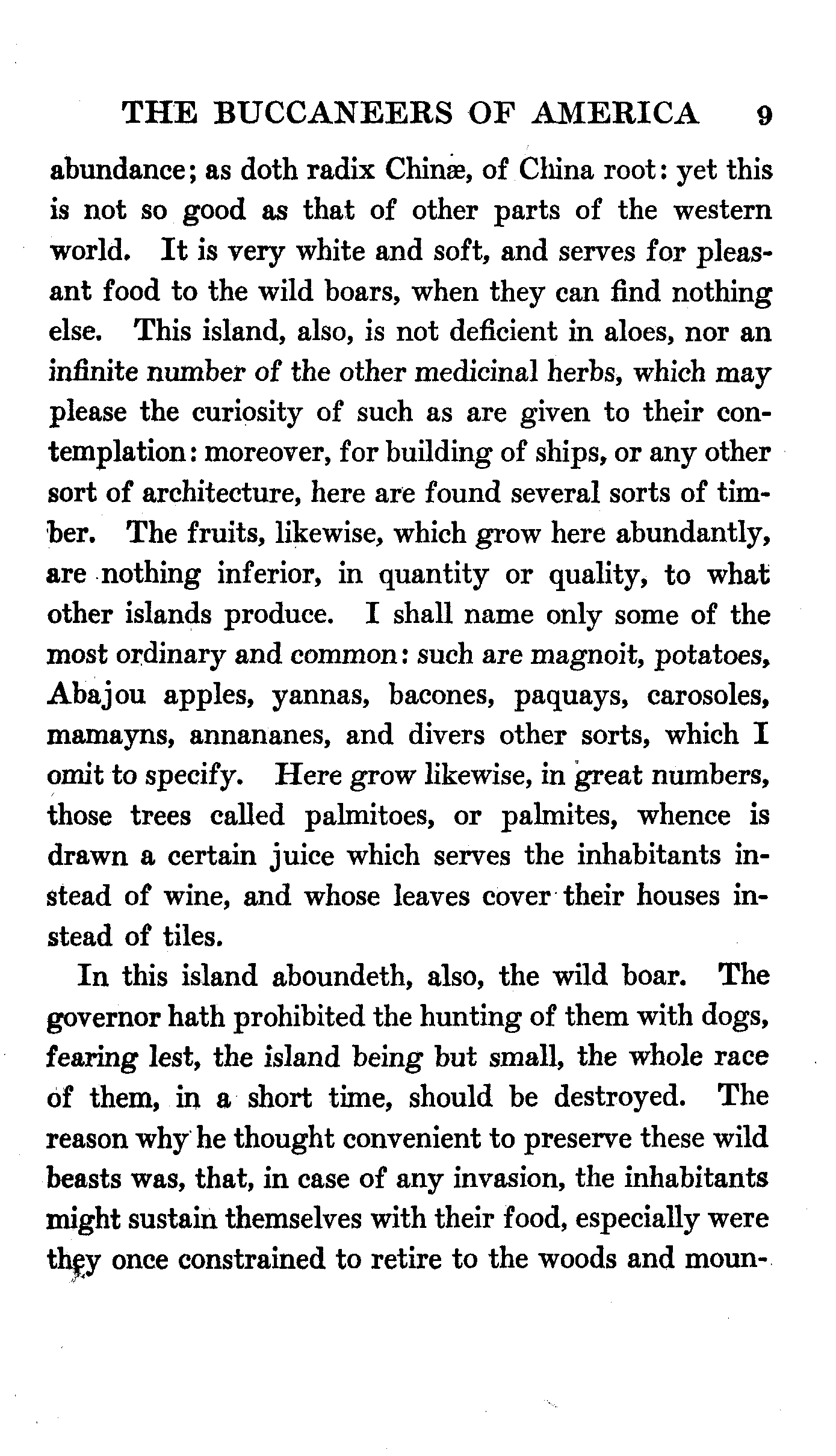 Being now at liberty, though like Adam when he was first created—that is, naked and destitute of all human necessaries—not knowing how to get my living, I determined to enter into the order of the pirates or robbers at sea. Into this society I was received with common consent, both of the superior and vulgar sort, where I continued till 1672. Having assisted them in all their designs and attempts, and served them in many notable exploits (of which hereafter I shall give the reader a true account), I returned to my own native country. But before I begin my relation, I shall say something of the island Hispaniola, which lies towards the western part of America; as also give my reader a brief description thereof, according to my slender ability and experience.[19]