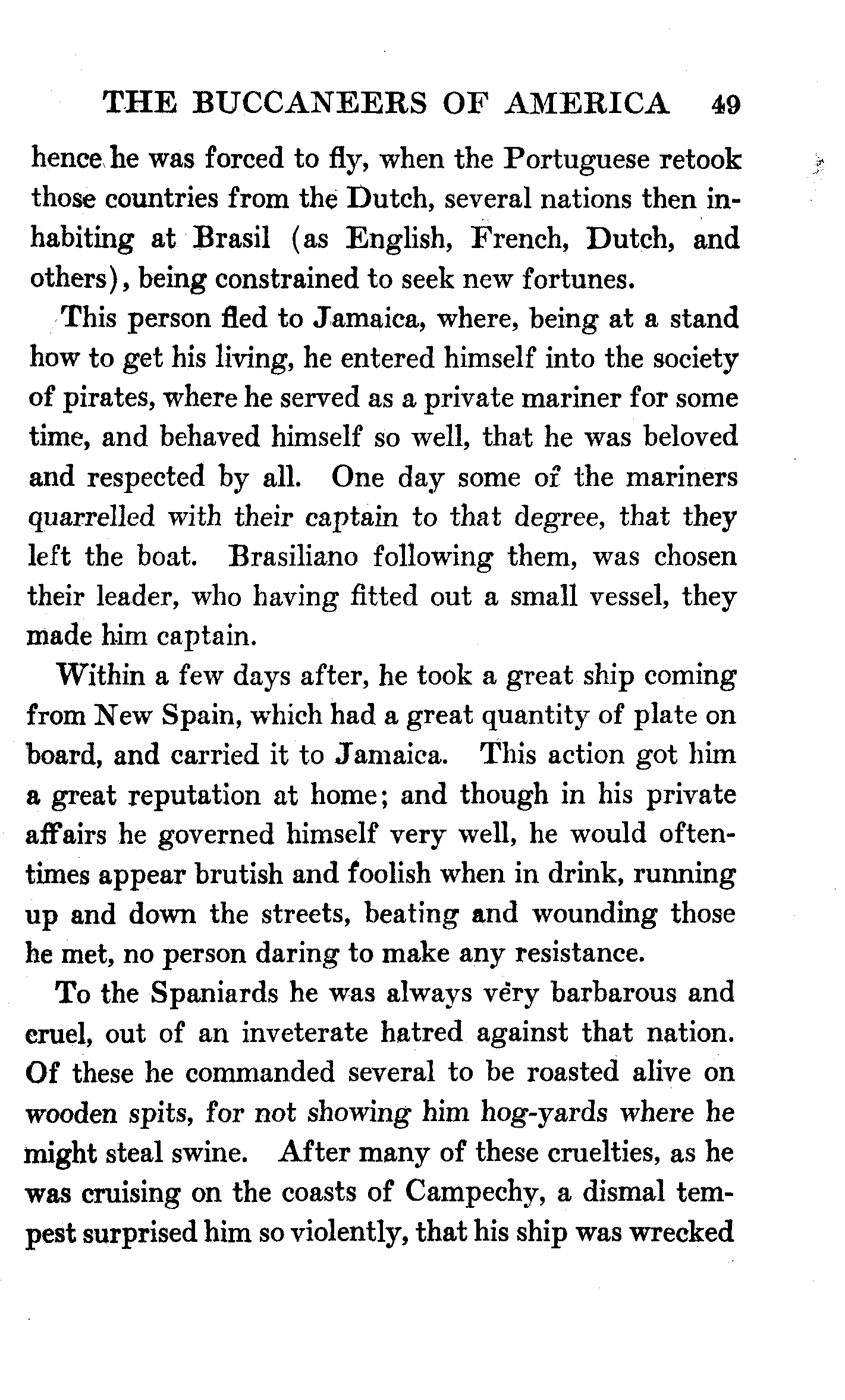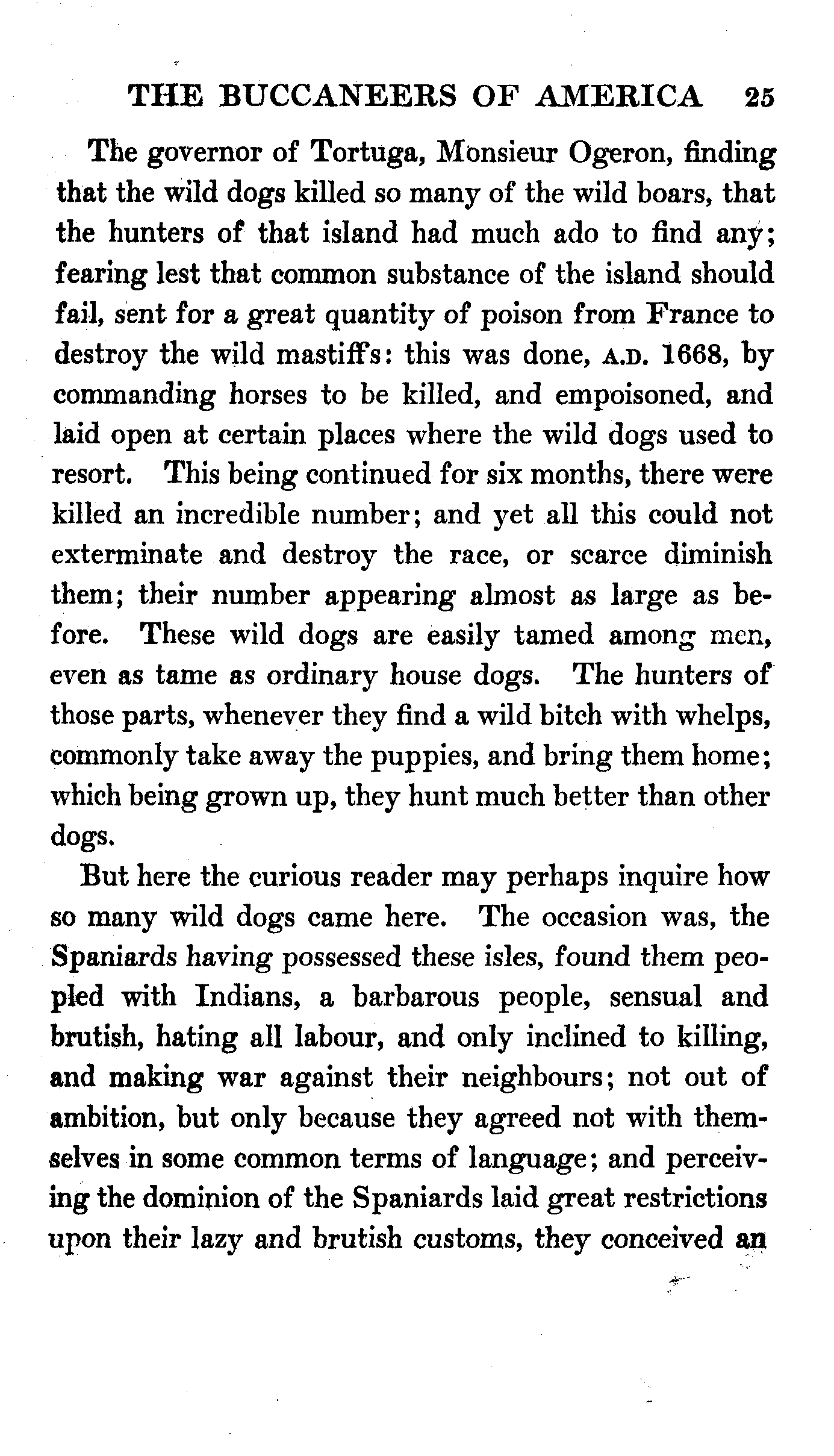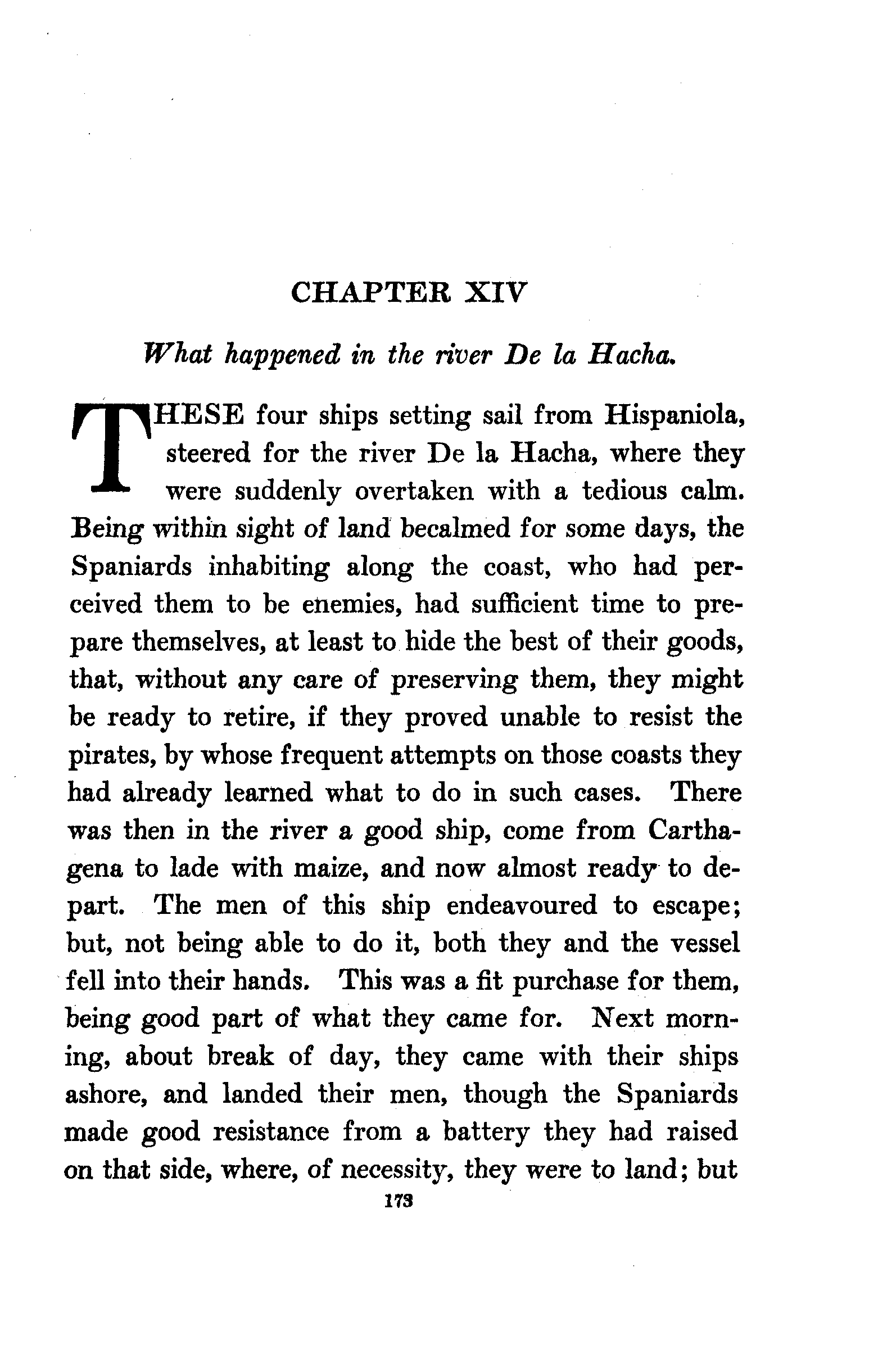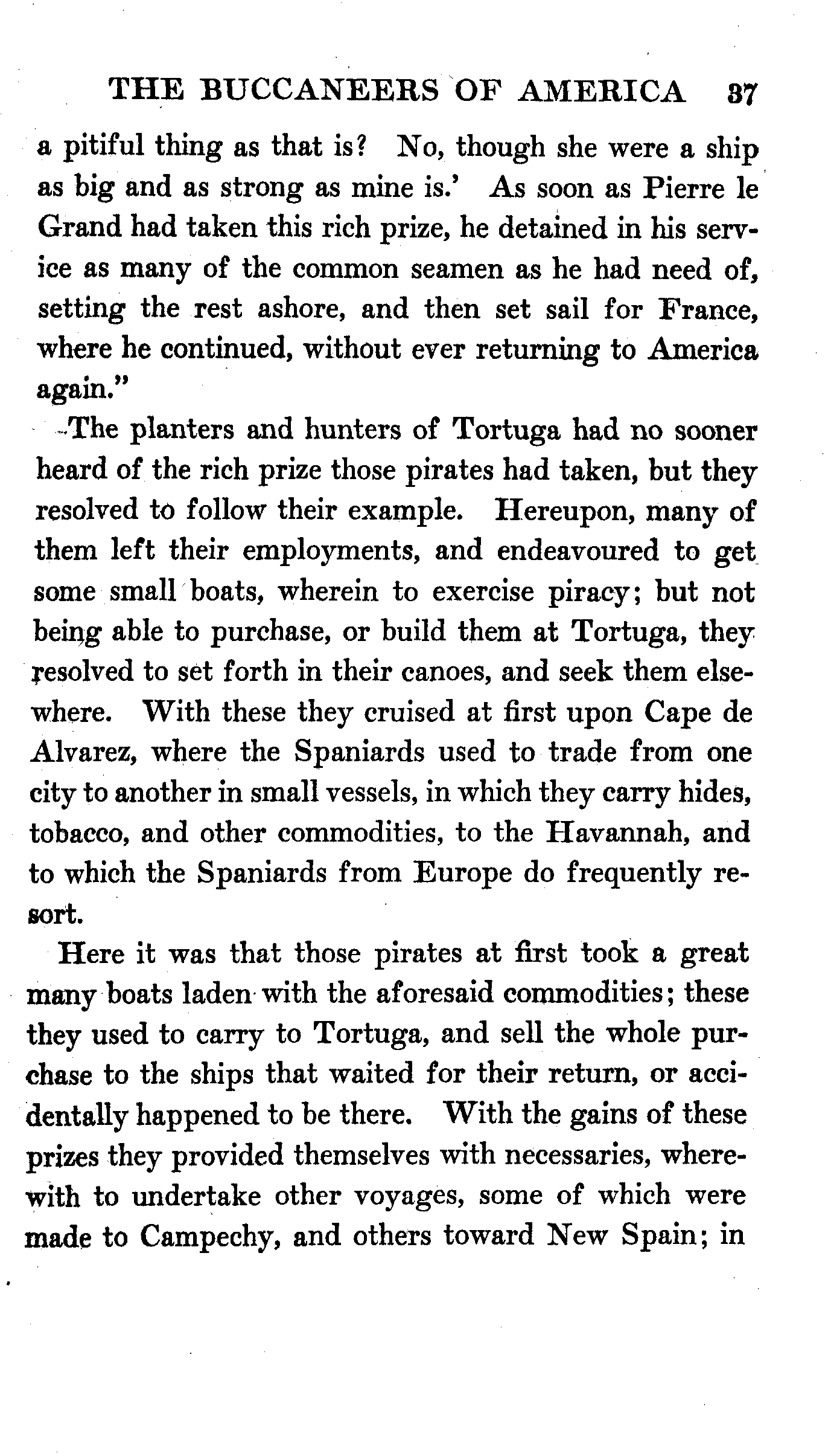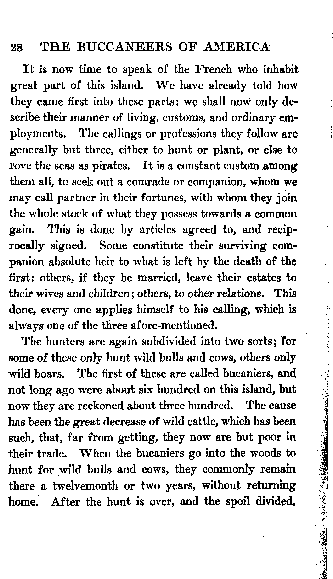 Being now at liberty, though like Adam when he was first created—that is, naked and destitute of all human necessaries—not knowing how to get my living, I determined to enter into the order of the pirates or robbers at sea. Into this society I was received with common consent, both of the superior and vulgar sort, where I continued till 1672. Having assisted them in all their designs and attempts, and served them in many notable exploits (of which hereafter I shall give the reader a true account), I returned to my own native country. But before I begin my relation, I shall say something of the island Hispaniola, which lies towards the western part of America; as also give my reader a brief description thereof, according to my slender ability and experience.[19]