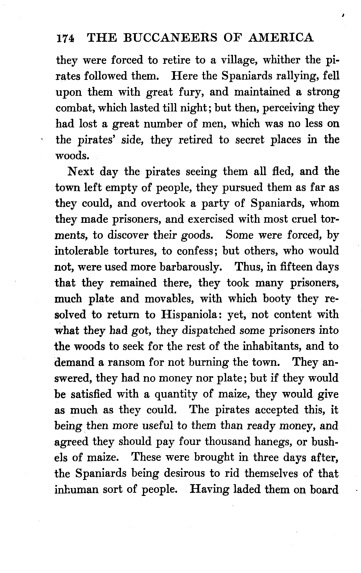 Next day the pirates seeing them all fled, and the town left empty of people, they pursued them as far as they could, and overtook a party of Spaniards, whom they made prisoners, and exercised with most cruel torments, to discover their goods. Some were forced, by intolerable tortures, to confess; but others, who would not, were used more barbarously. Thus, in fifteen days that they remained there, they took many prisoners, much plate and movables, with which booty they resolved to return to Hispaniola: yet, not content with what they had got, they dispatched some prisoners into the woods to seek for the rest of the inhabitants, and to demand a ransom for not burning the town. They answered, they had no money nor plate; but if they would be satisfied with a quantity of maize, they would give as much as they could. The pirates accepted this, it being then more useful to them than ready money, and agreed they should pay four thousand hanegs, or bushels of maize. These were brought in three days after, the Spaniards being desirous to rid themselves of that inhuman sort of people. Having laded them on board[175] with the rest of their purchase, they returned to Hispaniola, to give account to their leader, Captain Morgan, of all they had performed.