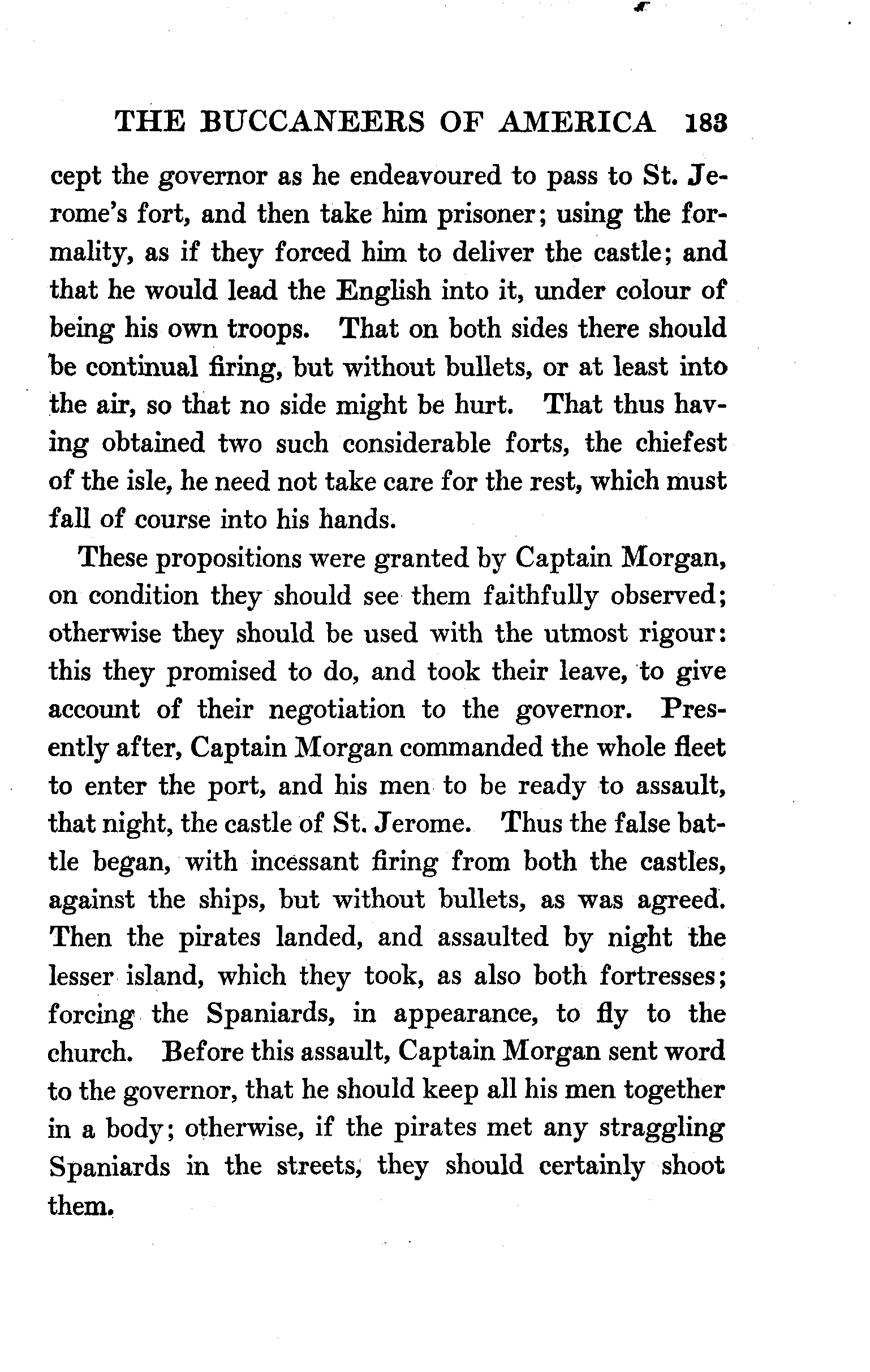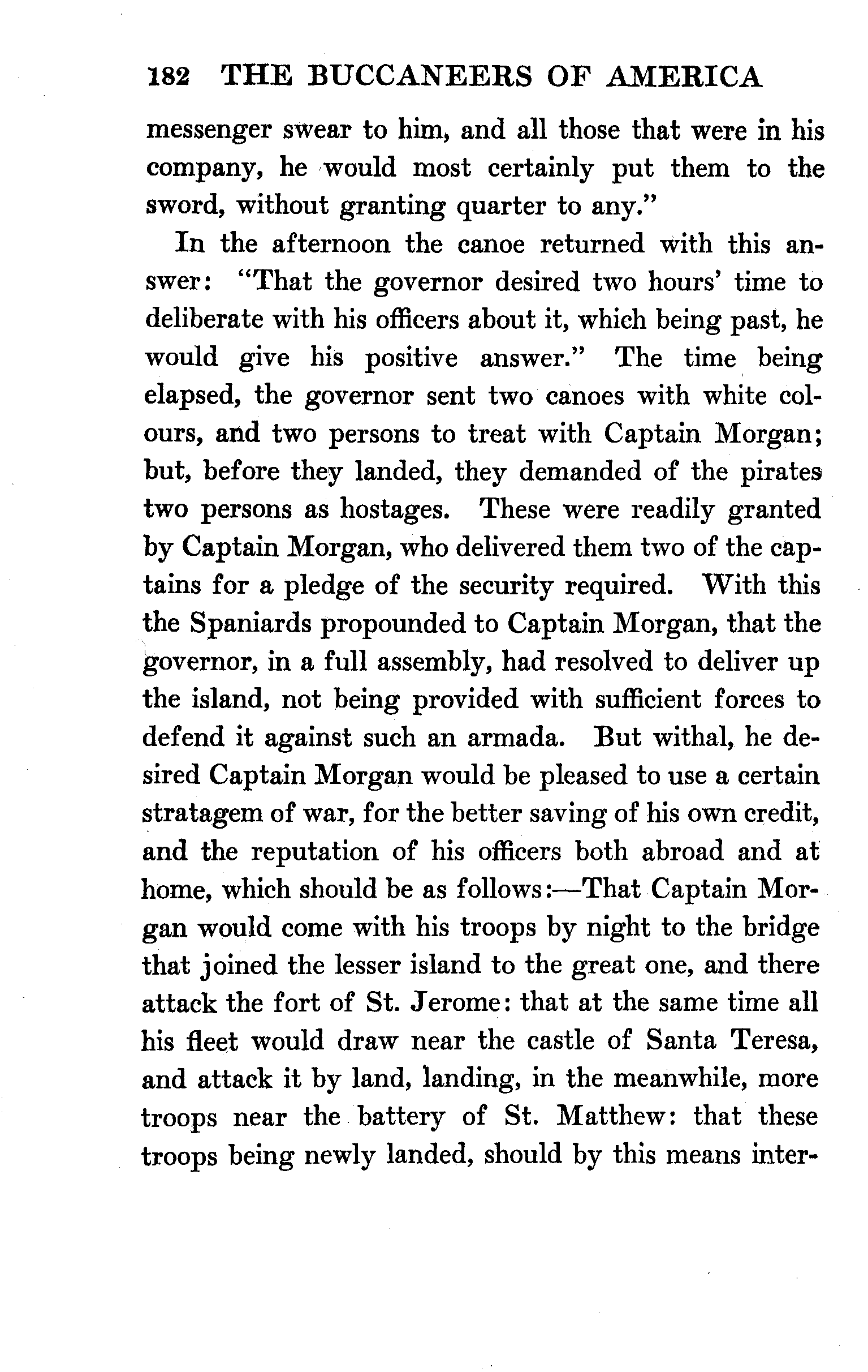 In the afternoon the canoe returned with this answer: "That the governor desired two hours' time to deliberate with his officers about it, which being past, he would give his positive answer." The time being elapsed, the governor sent two canoes with white colours, and two persons to treat with Captain Morgan; but, before they landed, they demanded of the pirates two persons as hostages. These were readily granted by Captain Morgan, who delivered them two of the captains for a pledge of the security required. With this the Spaniards propounded to Captain Morgan, that the governor, in a full assembly, had resolved to deliver up the island, not being provided with sufficient forces to defend it against such an armada. But withal, he desired Captain Morgan would be pleased to use a certain stratagem of war, for the better saving of his own credit, and the reputation of his officers both abroad and at home, which should be as follows:—That Captain Morgan would come with his troops by night to the bridge that joined the lesser island to the great one, and there attack the fort of St. Jerome: that at the same time all his fleet would draw near the castle of Santa Teresa, and attack it by land, landing, in the meanwhile, more troops near the battery of St. Matthew: that these troops being newly landed, should by this means inter[183]cept the governor as he endeavoured to pass to St. Jerome's fort, and then take him prisoner; using the formality, as if they forced him to deliver the castle; and that he would lead the English into it, under colour of being his own troops. That on both sides there should be continual firing, but without bullets, or at least into the air, so that no side might be hurt. That thus having obtained two such considerable forts, the chiefest of the isle, he need not take care for the rest, which must fall of course into his hands.