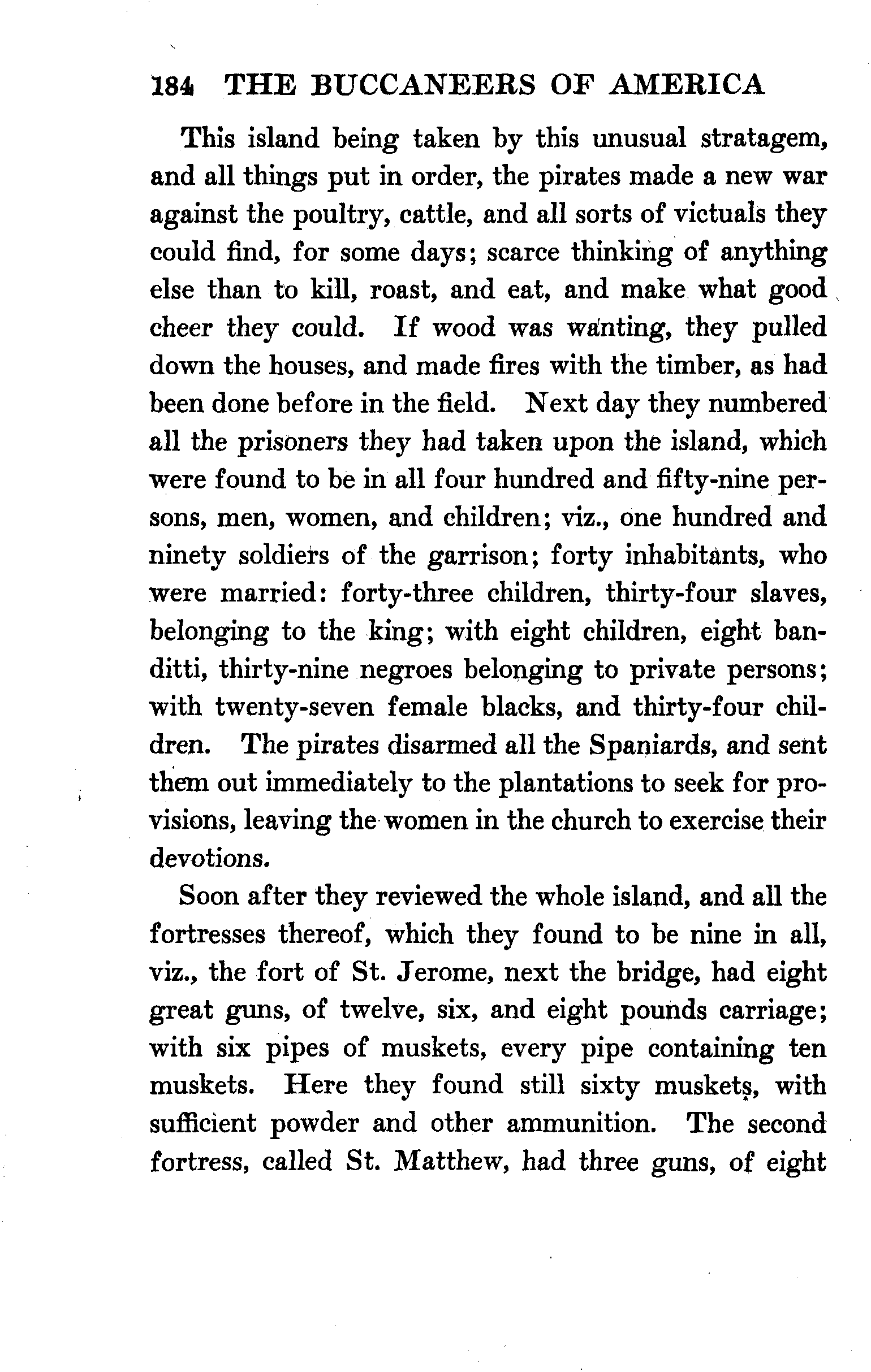 This island being taken by this unusual stratagem, and all things put in order, the pirates made a new war against the poultry, cattle, and all sorts of victuals they could find, for some days; scarce thinking of anything else than to kill, roast, and eat, and make what good cheer they could. If wood was wanting, they pulled down the houses, and made fires with the timber, as had been done before in the field. Next day they numbered all the prisoners they had taken upon the island, which were found to be in all four hundred and fifty-nine persons, men, women, and children; viz., one hundred and ninety soldiers of the garrison; forty inhabitants, who were married: forty-three children, thirty-four slaves, belonging to the king; with eight children, eight banditti, thirty-nine negroes belonging to private persons; with twenty-seven female blacks, and thirty-four children. The pirates disarmed all the Spaniards, and sent them out immediately to the plantations to seek for provisions, leaving the women in the church to exercise their devotions.