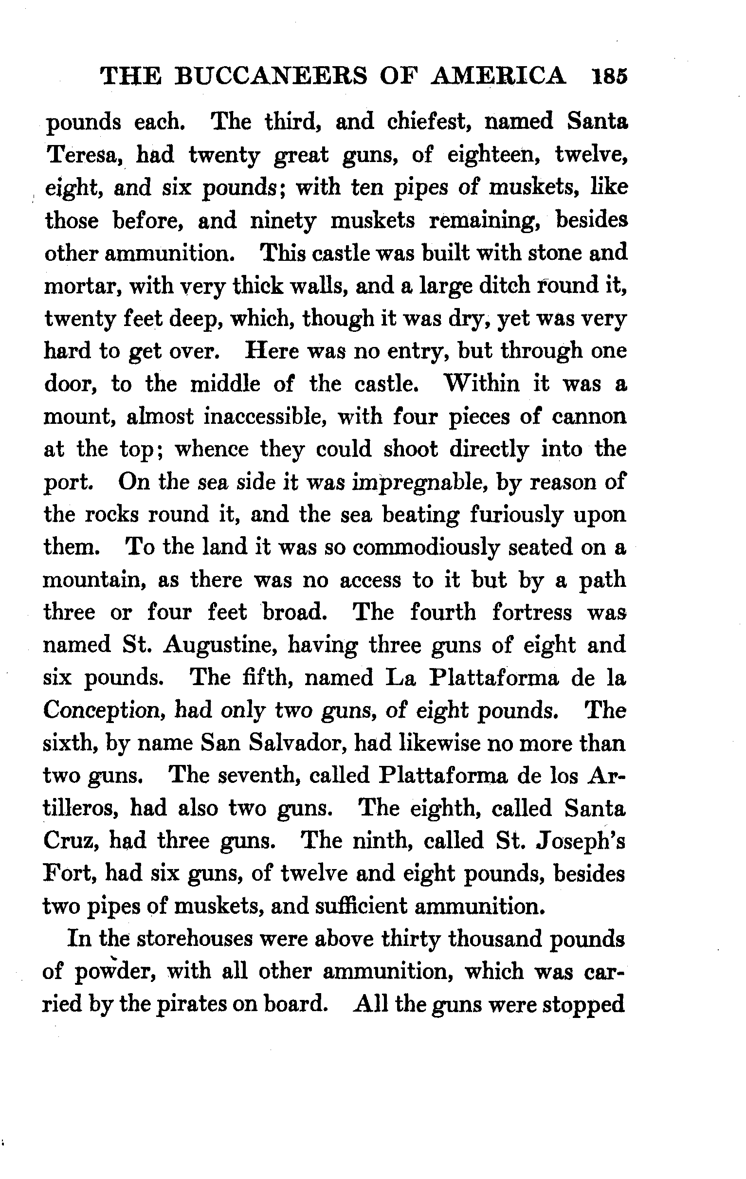 Soon after they reviewed the whole island, and all the fortresses thereof, which they found to be nine in all, viz., the fort of St. Jerome, next the bridge, had eight great guns, of twelve, six, and eight pounds carriage; with six pipes of muskets, every pipe containing ten muskets. Here they found still sixty muskets, with sufficient powder and other ammunition. The second fortress, called St. Matthew, had three guns, of eight[185] pounds each. The third, and chiefest, named Santa Teresa, had twenty great guns, of eighteen, twelve, eight, and six pounds; with ten pipes of muskets, like those before, and ninety muskets remaining, besides other ammunition. This castle was built with stone and mortar, with very thick walls, and a large ditch round it, twenty feet deep, which, though it was dry, yet was very hard to get over. Here was no entry, but through one door, to the middle of the castle. Within it was a mount, almost inaccessible, with four pieces of cannon at the top; whence they could shoot directly into the port. On the sea side it was impregnable, by reason of the rocks round it, and the sea beating furiously upon them. To the land it was so commodiously seated on a mountain, as there was no access to it but by a path three or four feet broad. The fourth fortress was named St. Augustine, having three guns of eight and six pounds. The fifth, named La Plattaforma de la Conception, had only two guns, of eight pounds. The sixth, by name San Salvador, had likewise no more than two guns. The seventh, called Plattaforma de los Artilleros, had also two guns. The eighth, called Santa Cruz, had three guns. The ninth, called St. Joseph's Fort, had six guns, of twelve and eight pounds, besides two pipes of muskets, and sufficient ammunition.