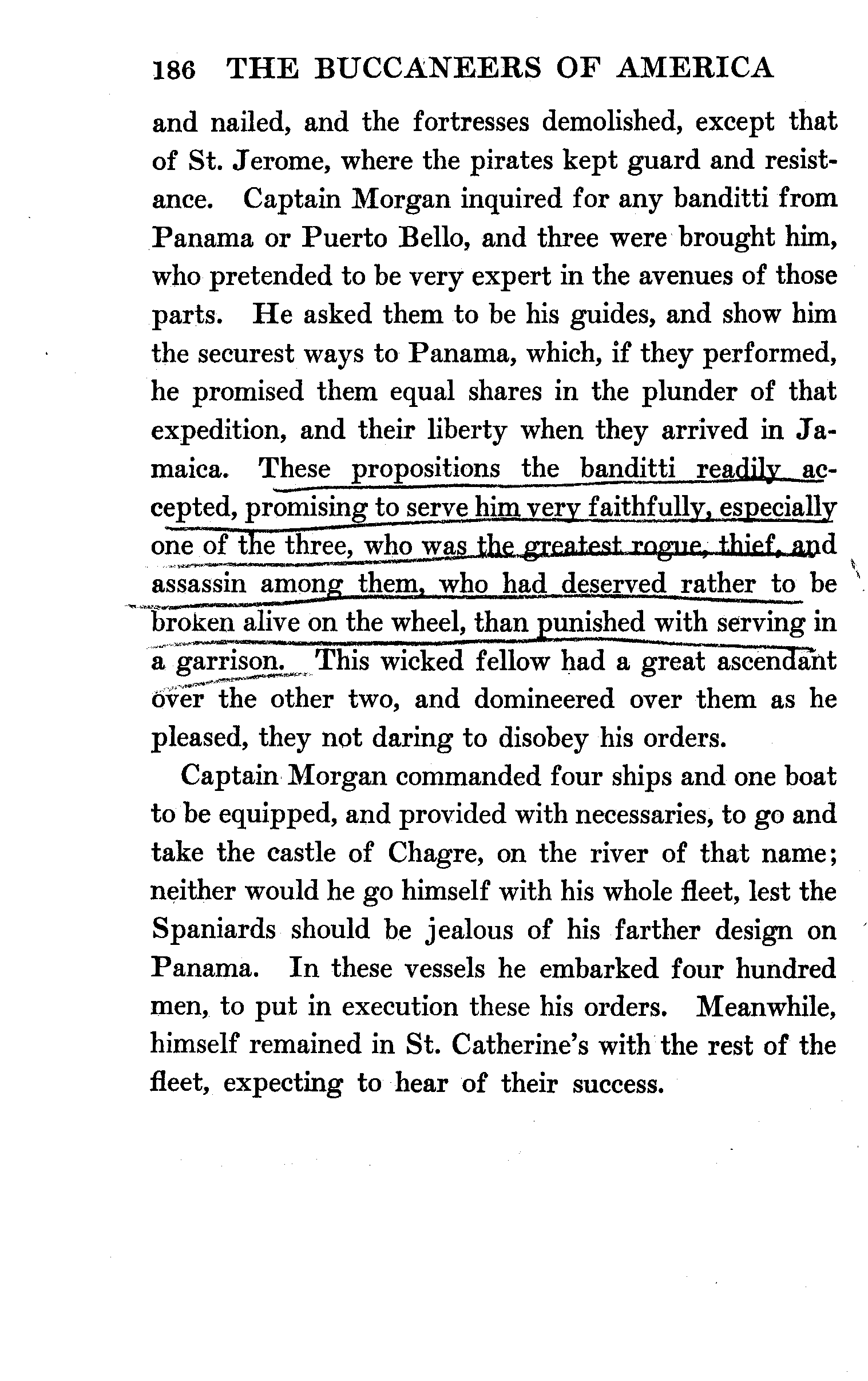 In the storehouses were above thirty thousand pounds of powder, with all other ammunition, which was carried by the pirates on board. All the guns were stopped[186] and nailed, and the fortresses demolished, except that of St. Jerome, where the pirates kept guard and resistance. Captain Morgan inquired for any banditti from Panama or Puerto Bello, and three were brought him, who pretended to be very expert in the avenues of those parts. He asked them to be his guides, and show him the securest ways to Panama, which, if they performed, he promised them equal shares in the plunder of that expedition, and their liberty when they arrived in Jamaica. These propositions the banditti readily accepted, promising to serve him very faithfully, especially one of the three, who was the greatest rogue, thief, and assassin among them, who had deserved rather to be broken alive on the wheel, than punished with serving in a garrison. This wicked fellow had a great ascendant over the other two, and domineered over them as he pleased, they not daring to disobey his orders.