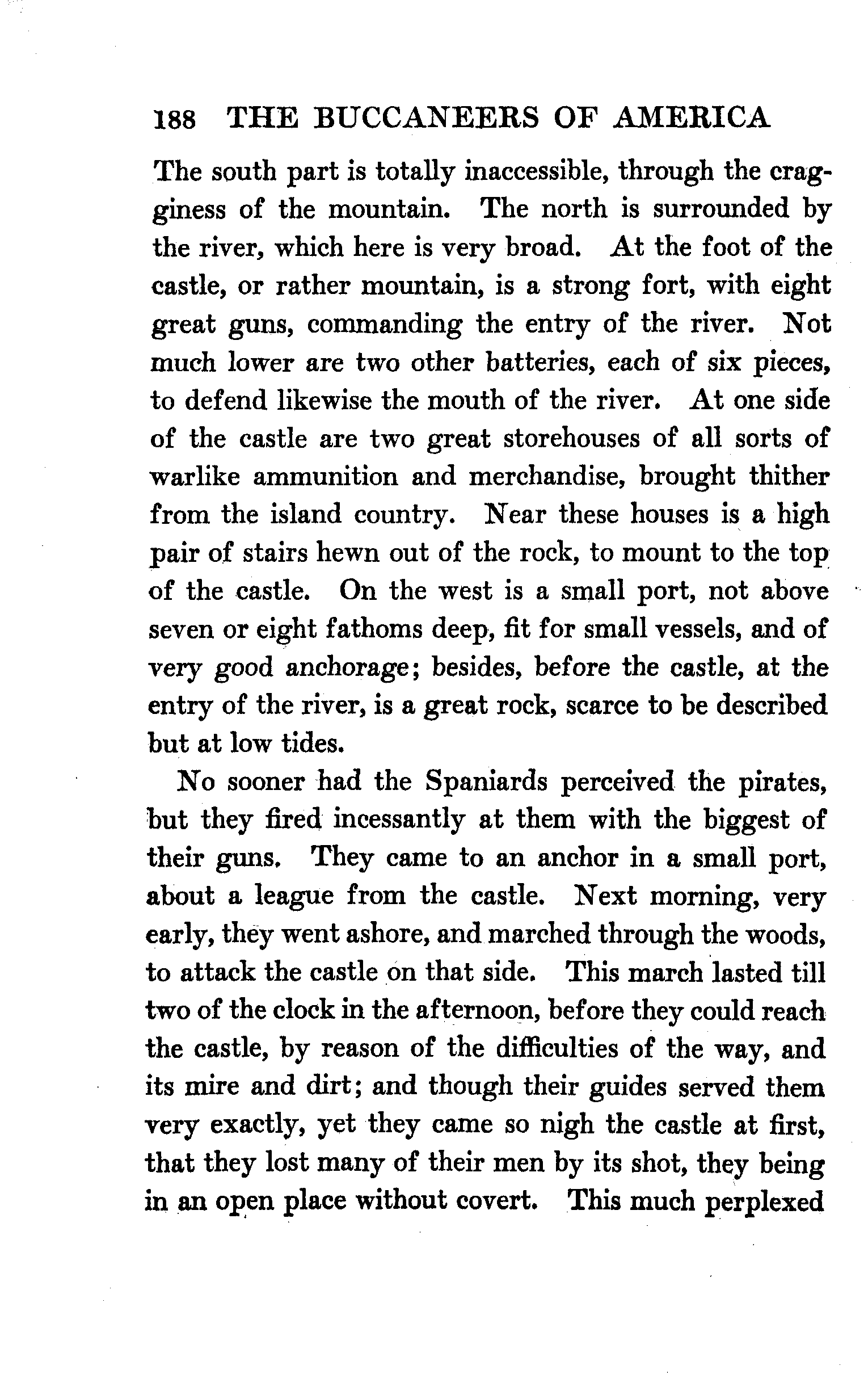 No sooner had the Spaniards perceived the pirates, but they fired incessantly at them with the biggest of their guns. They came to an anchor in a small port, about a league from the castle. Next morning, very early, they went ashore, and marched through the woods, to attack the castle on that side. This march lasted till two of the clock in the afternoon, before they could reach the castle, by reason of the difficulties of the way, and its mire and dirt; and though their guides served them very exactly, yet they came so nigh the castle at first, that they lost many of their men by its shot, they being in an open place without covert. This much perplexed[189] the pirates, not knowing what course to take; for on that side, of necessity, they must make the assault: and being uncovered from head to foot, they could not advance one step without danger: besides that, the castle, both for its situation and strength, made them much doubt of success. But to give it over they dared not, lest they should be reproached by their companions.