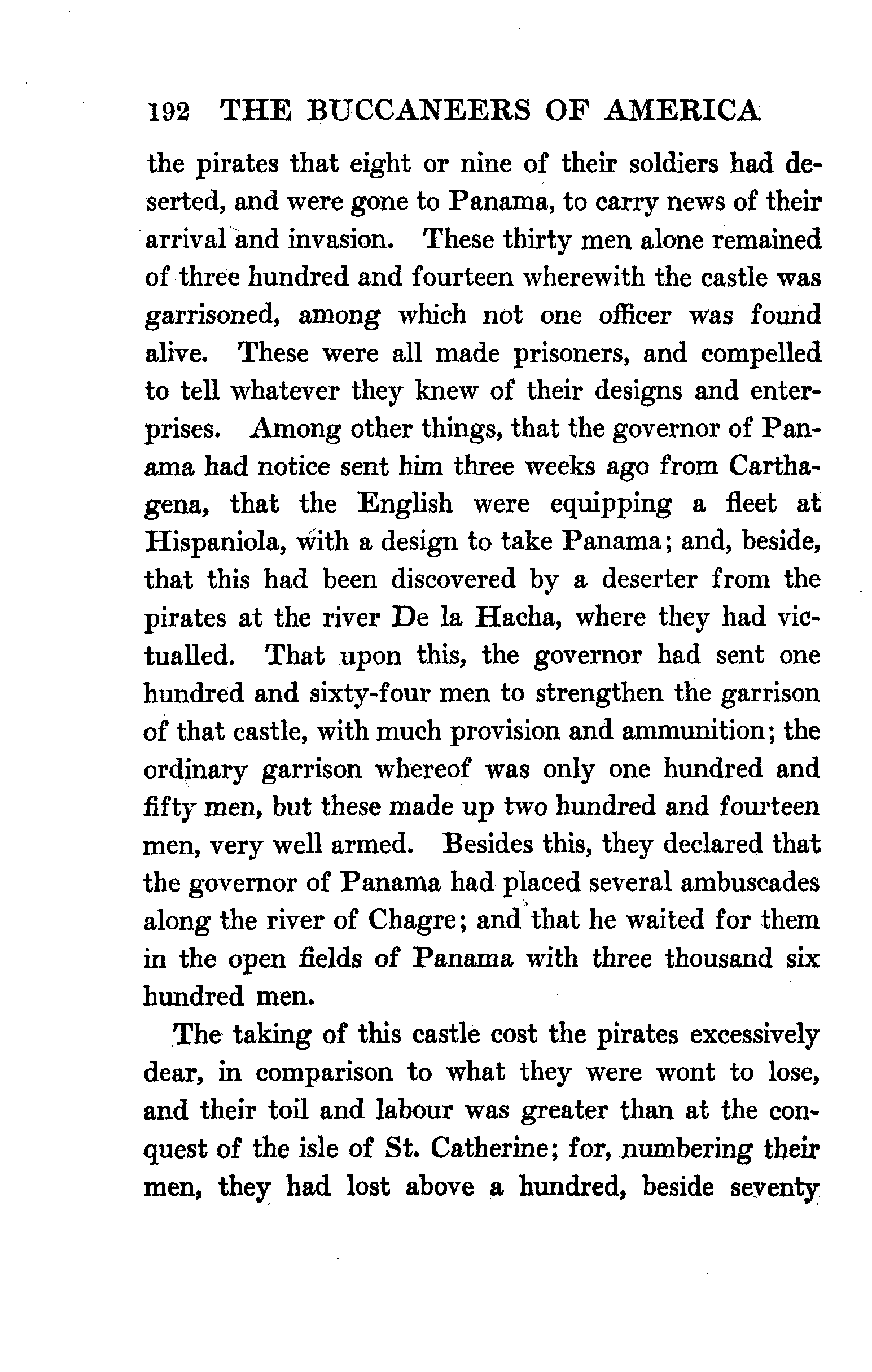 The governor being dead, and the corps du gard surrendering, they found remaining in it alive thirty men, whereof scarce ten were not wounded: these informed[192] the pirates that eight or nine of their soldiers had deserted, and were gone to Panama, to carry news of their arrival and invasion. These thirty men alone remained of three hundred and fourteen wherewith the castle was garrisoned, among which not one officer was found alive. These were all made prisoners, and compelled to tell whatever they knew of their designs and enterprises. Among other things, that the governor of Panama had notice sent him three weeks ago from Carthagena, that the English were equipping a fleet at Hispaniola, with a design to take Panama; and, beside, that this had been discovered by a deserter from the pirates at the river De la Hacha, where they had victualled. That upon this, the governor had sent one hundred and sixty-four men to strengthen the garrison of that castle, with much provision and ammunition; the ordinary garrison whereof was only one hundred and fifty men, but these made up two hundred and fourteen men, very well armed. Besides this, they declared that the governor of Panama had placed several ambuscades along the river of Chagre; and that he waited for them in the open fields of Panama with three thousand six hundred men.