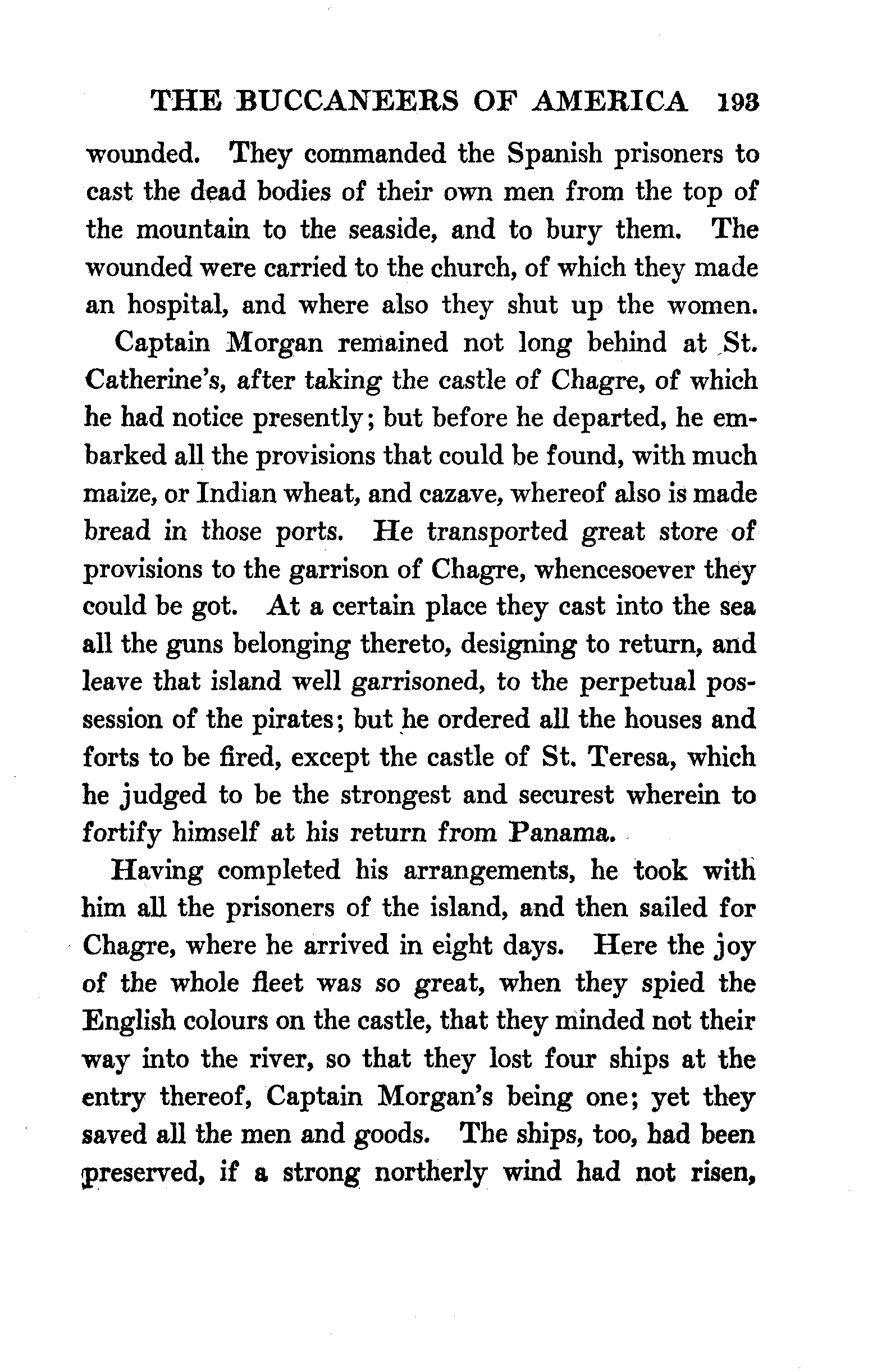 Having completed his arrangements, he took with him all the prisoners of the island, and then sailed for Chagre, where he arrived in eight days. Here the joy of the whole fleet was so great, when they spied the English colours on the castle, that they minded not their way into the river, so that they lost four ships at the entry thereof, Captain Morgan's being one; yet they saved all the men and goods. The ships, too, had been preserved, if a strong northerly wind had not risen,[194] which cast them on the rock at the entry of the river.