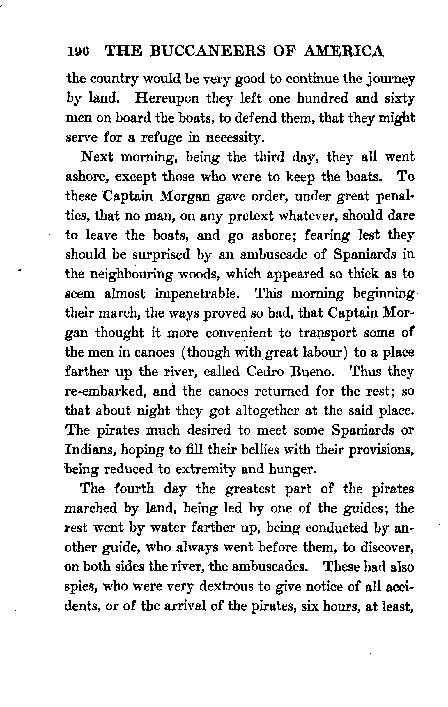 Next morning, being the third day, they all went ashore, except those who were to keep the boats. To these Captain Morgan gave order, under great penalties, that no man, on any pretext whatever, should dare to leave the boats, and go ashore; fearing lest they should be surprised by an ambuscade of Spaniards in the neighbouring woods, which appeared so thick as to seem almost impenetrable. This morning beginning their march, the ways proved so bad, that Captain Morgan thought it more convenient to transport some of the men in canoes (though with great labour) to a place farther up the river, called Cedro Bueno. Thus they re-embarked, and the canoes returned for the rest; so that about night they got altogether at the said place. The pirates much desired to meet some Spaniards or Indians, hoping to fill their bellies with their provisions, being reduced to extremity and hunger.