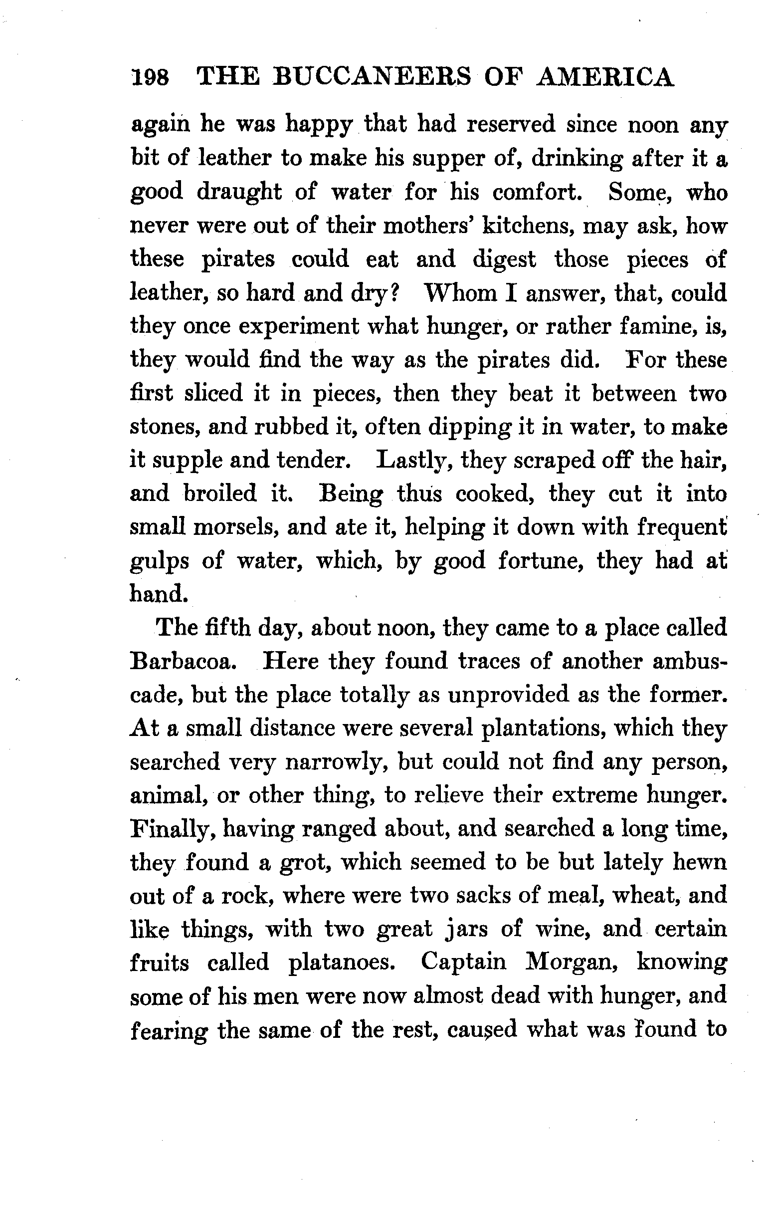 The fifth day, about noon, they came to a place called Barbacoa. Here they found traces of another ambuscade, but the place totally as unprovided as the former. At a small distance were several plantations, which they searched very narrowly, but could not find any person, animal, or other thing, to relieve their extreme hunger. Finally, having ranged about, and searched a long time, they found a grot, which seemed to be but lately hewn out of a rock, where were two sacks of meal, wheat, and like things, with two great jars of wine, and certain fruits called platanoes. Captain Morgan, knowing some of his men were now almost dead with hunger, and fearing the same of the rest, caused what was found to[199] be distributed among them who were in greatest necessity. Having refreshed themselves with these victuals, they marched anew with greater courage than ever. Such as were weak were put into the canoes, and those commanded to land that were in them before. Thus they prosecuted their journey till late at night; when coming to a plantation, they took up their rest, but without eating anything; for the Spaniards, as before, had swept away all manner of provisions.