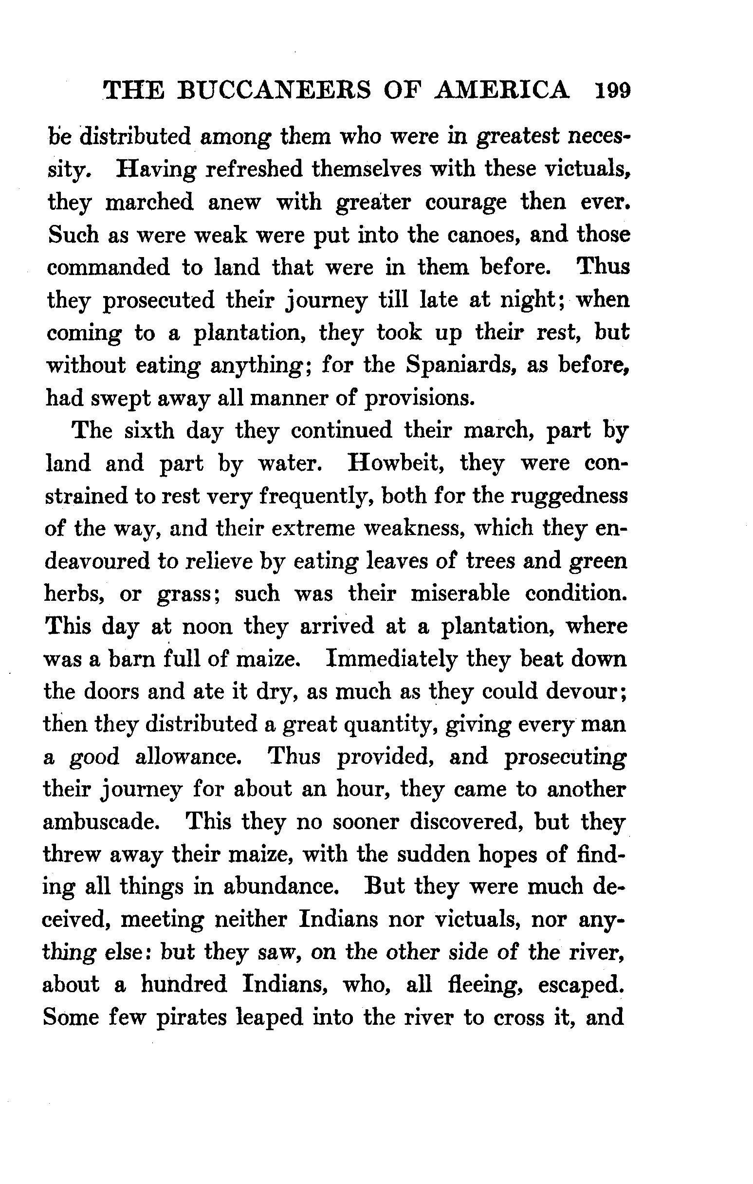 The sixth day they continued their march, part by land and part by water. Howbeit, they were constrained to rest very frequently, both for the ruggedness of the way, and their extreme weakness, which they endeavoured to relieve by eating leaves of trees and green herbs, or grass; such was their miserable condition. This day at noon they arrived at a plantation, where was a barn full of maize. Immediately they beat down the doors and ate it dry, as much as they could devour; then they distributed a great quantity, giving every man a good allowance. Thus provided, and prosecuting their journey for about an hour, they came to another ambuscade. This they no sooner discovered, but they threw away their maize, with the sudden hopes of finding all things in abundance. But they were much deceived, meeting neither Indians nor victuals, nor anything else: but they saw, on the other side of the river, about a hundred Indians, who, all fleeing, escaped. Some few pirates leaped into the river to cross it, and[200] try to take any of the Indians, but in vain: for, being much more nimble than the pirates, they not only baffled them, but killed two or three with their arrows; hooting at them, and crying, "Ha, perros! a la savana, a la savana."—"Ha, ye dogs! go to the plain, go to the plain."