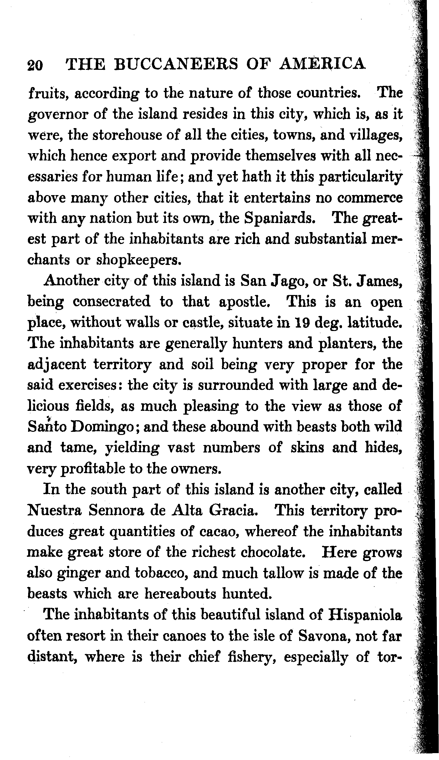 The chief city and metropolis hereof is Santo Domingo; being dedicated to St. Dominic, from whom it derives its name. It is situate towards the south, and affords a most excellent prospect; the country round about being embellished with innumerable rich plantations, as also verdant meadows and fruitful gardens; all which produce plenty and variety of excellent pleasant[20] fruits, according to the nature of those countries. The governor of the island resides in this city, which is, as it were, the storehouse of all the cities, towns, and villages, which hence export and provide themselves with all necessaries for human life; and yet hath it this particularity above many other cities, that it entertains no commerce with any nation but its own, the Spaniards. The greatest part of the inhabitants are rich and substantial merchants or shopkeepers.
