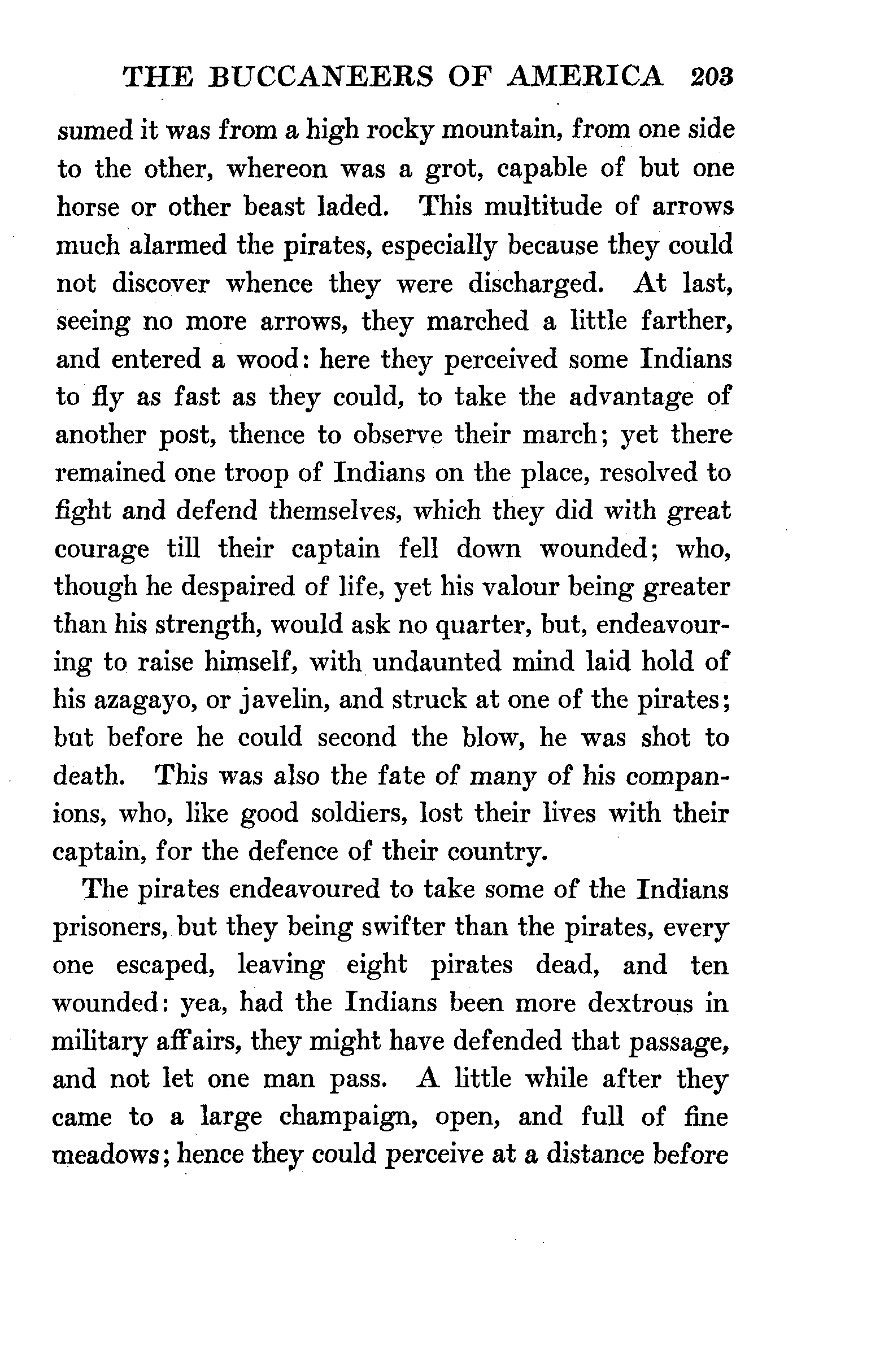 The eighth day in the morning Captain Morgan sent two hundred men before the body of his army, to discover the way to Panama, and any ambuscades therein: the path being so narrow, that only ten or twelve persons could march abreast, and often not so many. After ten hours' march they came to a place called Quebrada Obscura: here, all on a sudden, three or four thousand arrows were shot at them, they not perceiving whence they came, or who shot them: though they pre[203]sumed it was from a high rocky mountain, from one side to the other, whereon was a grot, capable of but one horse or other beast laded. This multitude of arrows much alarmed the pirates, especially because they could not discover whence they were discharged. At last, seeing no more arrows, they marched a little farther, and entered a wood: here they perceived some Indians to fly as fast as they could, to take the advantage of another post, thence to observe their march; yet there remained one troop of Indians on the place, resolved to fight and defend themselves, which they did with great courage till their captain fell down wounded; who, though he despaired of life, yet his valour being greater than his strength, would ask no quarter, but, endeavouring to raise himself, with undaunted mind laid hold of his azagayo, or javelin, and struck at one of the pirates; but before he could second the blow, he was shot to death. This was also the fate of many of his companions, who, like good soldiers, lost their lives with their captain, for the defence of their country.