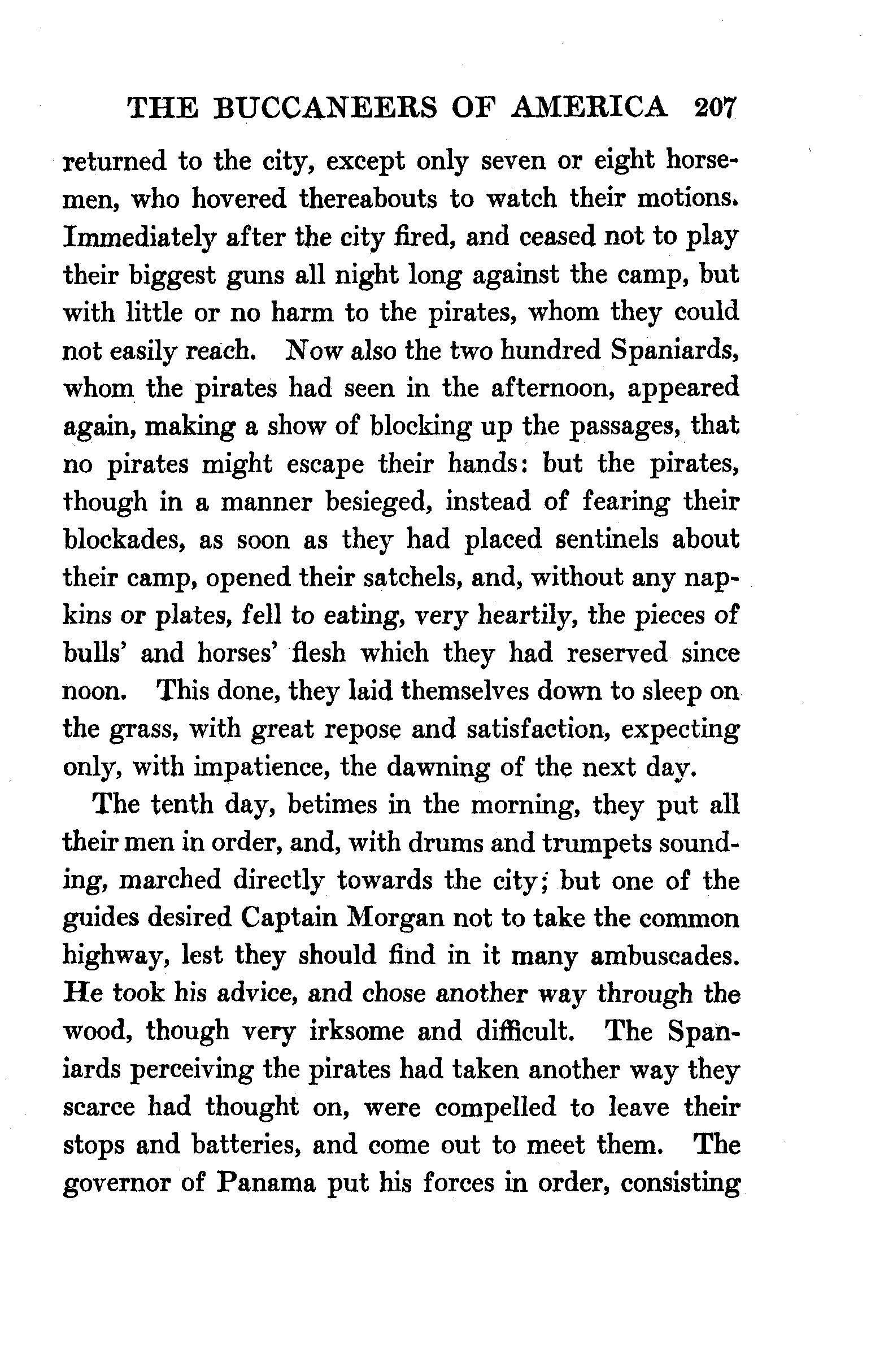 Having satisfied their hunger, Captain Morgan ordered them to continue the march. Here, again, he sent before the main body fifty men to take some prisoners, if they could; for he was much concerned, that in nine days he could not meet one person to inform him of the condition and forces of the Spaniards. About evening they discovered about two hundred Spaniards, who hallooed to the pirates, but they understood not what they said. A little while after they came in sight of the highest steeple of Panama: this they no sooner discovered but they showed signs of extreme joy, casting up their hats into the air, leaping and shouting, just as if they had already obtained the victory, and accomplished their designs. All their trumpets sounded, and drums beat, in token of this alacrity of their minds: thus they pitched their camp for that night, with general content of the whole army, waiting with impatience for the morning, when they intended to attack the city. This evening appeared fifty horse, who came out of the city, on the noise of the drums and trumpets, to observe, as it was thought, their motions: they came almost within musket-shot of the army, with a trumpet that sounded marvellously well. Those on horseback hallooed aloud to the pirates, and threatened them, saying, "Perros! nos veremos," that is, "Ye dogs! we shall meet ye." Having made this menace, they[207] returned to the city, except only seven or eight horsemen, who hovered thereabouts to watch their motions. Immediately after the city fired, and ceased not to play their biggest guns all night long against the camp, but with little or no harm to the pirates, whom they could not easily reach. Now also the two hundred Spaniards, whom the pirates had seen in the afternoon, appeared again, making a show of blocking up the passages, that no pirates might escape their hands: but the pirates, though in a manner besieged, instead of fearing their blockades, as soon as they had placed sentinels about their camp, opened their satchels, and, without any napkins or plates, fell to eating, very heartily, the pieces of bulls' and horses' flesh which they had reserved since noon. This done, they laid themselves down to sleep on the grass, with great repose and satisfaction, expecting only, with impatience, the dawning of the next day.