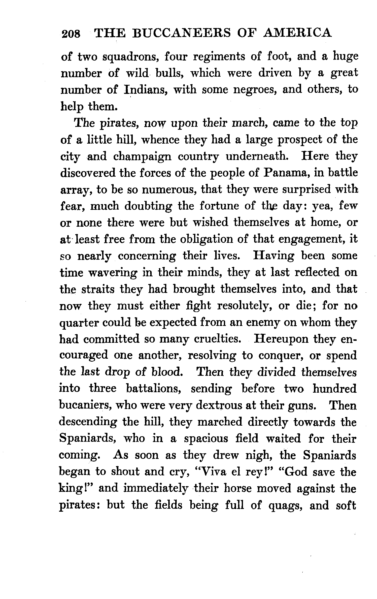 The pirates, now upon their march, came to the top of a little hill, whence they had a large prospect of the city and champaign country underneath. Here they discovered the forces of the people of Panama, in battle array, to be so numerous, that they were surprised with fear, much doubting the fortune of the day: yea, few or none there were but wished themselves at home, or at least free from the obligation of that engagement, it so nearly concerning their lives. Having been some time wavering in their minds, they at last reflected on the straits they had brought themselves into, and that now they must either fight resolutely, or die; for no quarter could be expected from an enemy on whom they had committed so many cruelties. Hereupon they encouraged one another, resolving to conquer, or spend the last drop of blood. Then they divided themselves into three battalions, sending before two hundred bucaniers, who were very dextrous at their guns. Then descending the hill, they marched directly towards the Spaniards, who in a spacious field waited for their coming. As soon as they drew nigh, the Spaniards began to shout and cry, "Viva el rey!" "God save the king!" and immediately their horse moved against the pirates: but the fields being full of quags, and soft[209] underfoot, they could not wheel about as they desired. The two hundred bucaniers, who went before, each putting one knee to the ground, began the battle briskly, with a full volley of shot: the Spaniards defended themselves courageously, doing all they could to disorder the pirates. Their foot endeavoured to second the horse, but were constrained by the pirates to leave them. Finding themselves baffled, they attempted to drive the bulls against them behind, to put them into disorder; but the wild cattle ran away, frighted with the noise of the battle; only some few broke through the English companies, and only tore the colours in pieces, while the bucaniers shot every one of them dead.