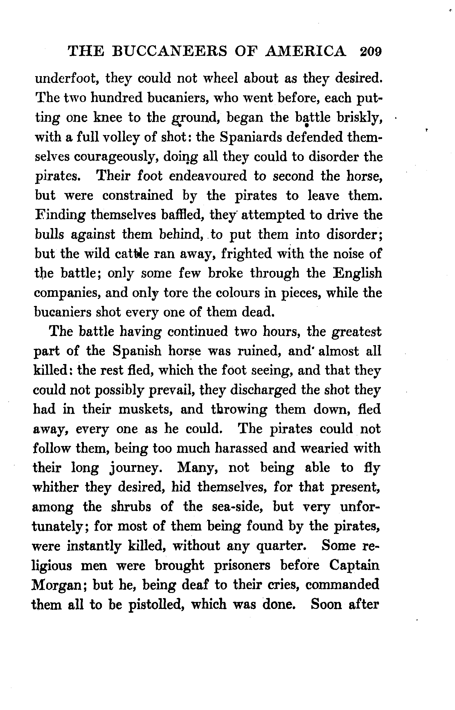 The battle having continued two hours, the greatest part of the Spanish horse was ruined, and almost all killed: the rest fled, which the foot seeing, and that they could not possibly prevail, they discharged the shot they had in their muskets, and throwing them down, fled away, every one as he could. The pirates could not follow them, being too much harassed and wearied with their long journey. Many, not being able to fly whither they desired, hid themselves, for that present, among the shrubs of the sea-side, but very unfortunately; for most of them being found by the pirates, were instantly killed, without any quarter. Some religious men were brought prisoners before Captain Morgan; but he, being deaf to their cries, commanded them all to be pistolled, which was done. Soon after[210] they brought a captain to him, whom he examined very strictly; particularly, wherein consisted the forces of those of Panama? He answered, their whole strength consisted in four hundred horse, twenty-four companies of foot, each of one hundred men complete; sixty Indians, and some negroes, who were to drive two thousand wild bulls upon the English, and thus, by breaking their files, put them into a total disorder: beside, that in the city they had made trenches, and raised batteries in several places, in all which they had placed many guns; and that at the entry of the highway, leading to the city, they had built a fort mounted with eight great brass guns, defended by fifty men.