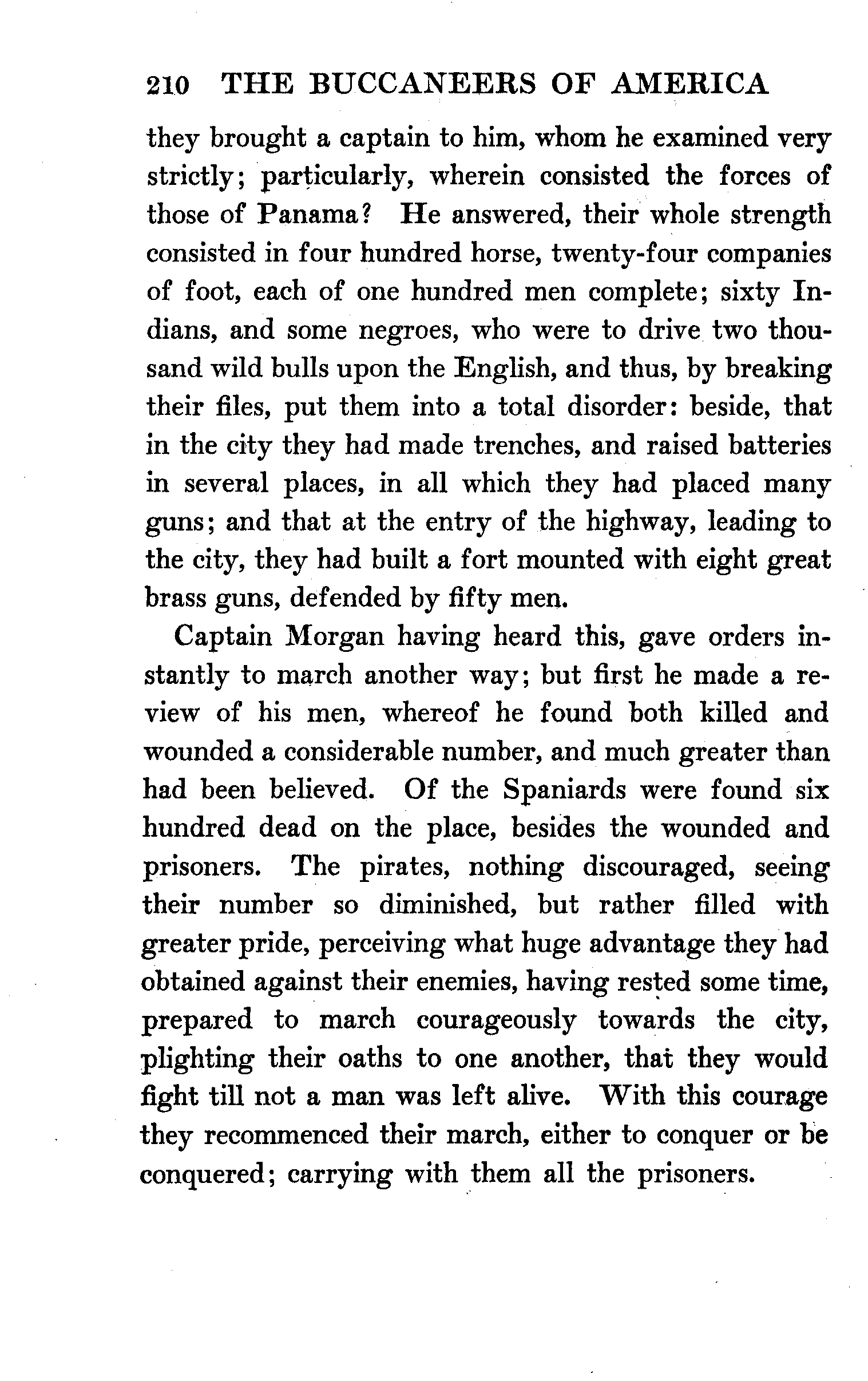 Captain Morgan having heard this, gave orders instantly to march another way; but first he made a review of his men, whereof he found both killed and wounded a considerable number, and much greater than had been believed. Of the Spaniards were found six hundred dead on the place, besides the wounded and prisoners. The pirates, nothing discouraged, seeing their number so diminished, but rather filled with greater pride, perceiving what huge advantage they had obtained against their enemies, having rested some time, prepared to march courageously towards the city, plighting their oaths to one another, that they would fight till not a man was left alive. With this courage they recommenced their march, either to conquer or be conquered; carrying with them all the prisoners.[211]