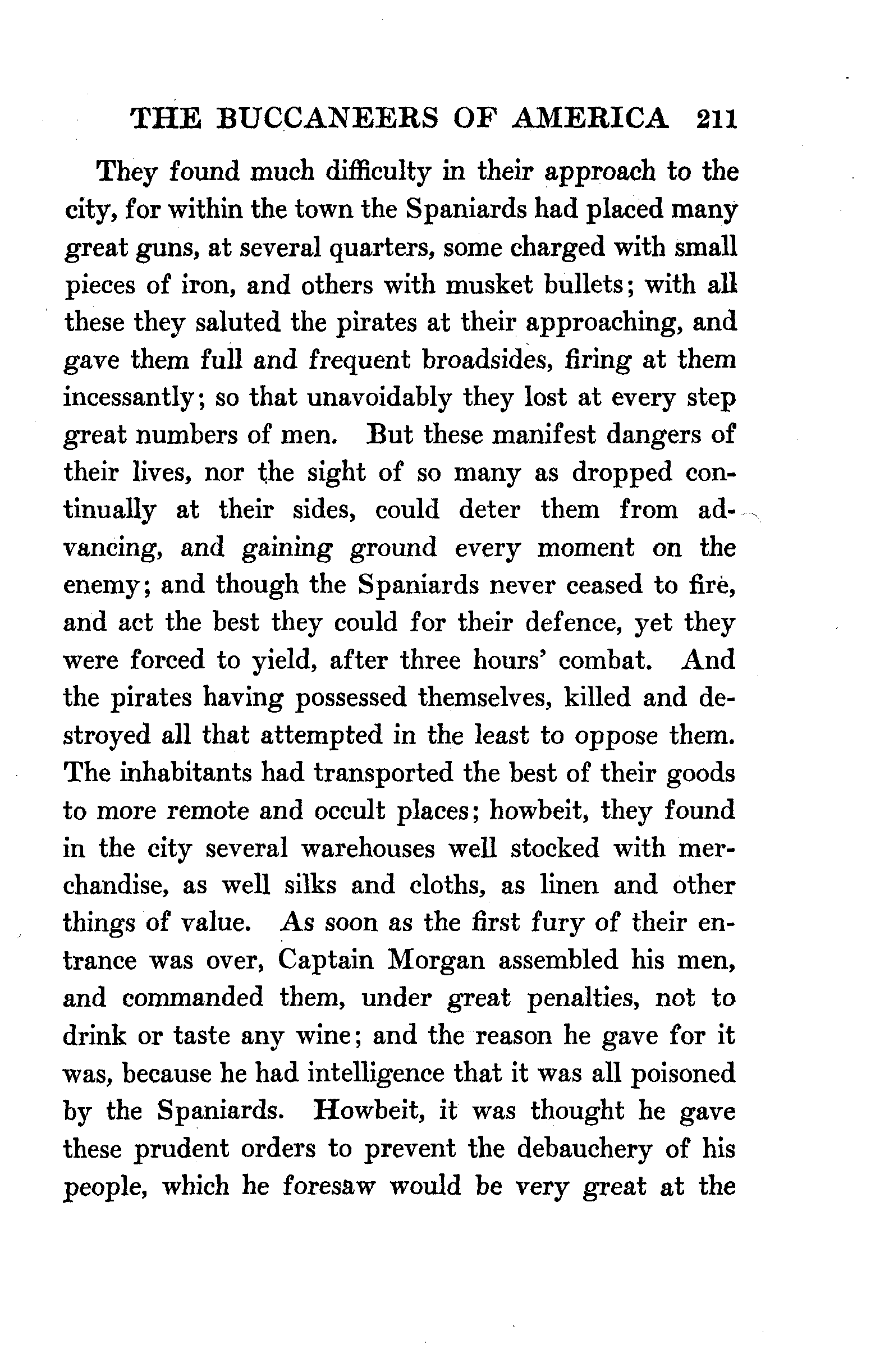 They found much difficulty in their approach to the city, for within the town the Spaniards had placed many great guns, at several quarters, some charged with small pieces of iron, and others with musket bullets; with all these they saluted the pirates at their approaching, and gave them full and frequent broadsides, firing at them incessantly; so that unavoidably they lost at every step great numbers of men. But these manifest dangers of their lives, nor the sight of so many as dropped continually at their sides, could deter them from advancing, and gaining ground every moment on the enemy; and though the Spaniards never ceased to fire, and act the best they could for their defence, yet they were forced to yield, after three hours' combat. And the pirates having possessed themselves, killed and destroyed all that attempted in the least to oppose them. The inhabitants had transported the best of their goods to more remote and occult places; howbeit, they found in the city several warehouses well stocked with merchandise, as well silks and cloths, as linen and other things of value. As soon as the first fury of their entrance was over, Captain Morgan assembled his men, and commanded them, under great penalties, not to drink or taste any wine; and the reason he gave for it was, because he had intelligence that it was all poisoned by the Spaniards. Howbeit, it was thought he gave these prudent orders to prevent the debauchery of his people, which he foresaw would be very great at the[212] first, after so much hunger sustained by the way; fearing, withal, lest the Spaniards, seeing them in wine, should rally, and, falling on the city, use them as inhumanly as they had used the inhabitants before.[213]