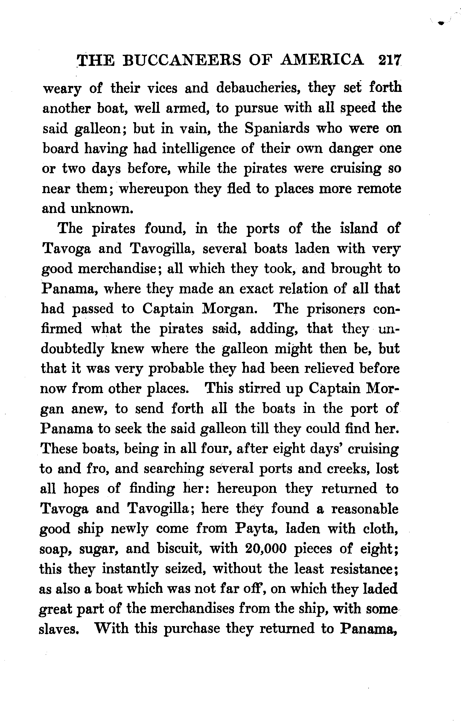 The pirates found, in the ports of the island of Tavoga and Tavogilla, several boats laden with very good merchandise; all which they took, and brought to Panama, where they made an exact relation of all that had passed to Captain Morgan. The prisoners confirmed what the pirates said, adding, that they undoubtedly knew where the galleon might then be, but that it was very probable they had been relieved before now from other places. This stirred up Captain Morgan anew, to send forth all the boats in the port of Panama to seek the said galleon till they could find her. These boats, being in all four, after eight days' cruising to and fro, and searching several ports and creeks, lost all hopes of finding her: hereupon they returned to Tavoga and Tavogilla; here they found a reasonable good ship newly come from Payta, laden with cloth, soap, sugar, and biscuit, with 20,000 pieces of eight; this they instantly seized, without the least resistance; as also a boat which was not far off, on which they laded great part of the merchandises from the ship, with some slaves. With this purchase they returned to Panama,[218] somewhat better satisfied; yet, withal, much discontented that they could not meet with the galleon.
