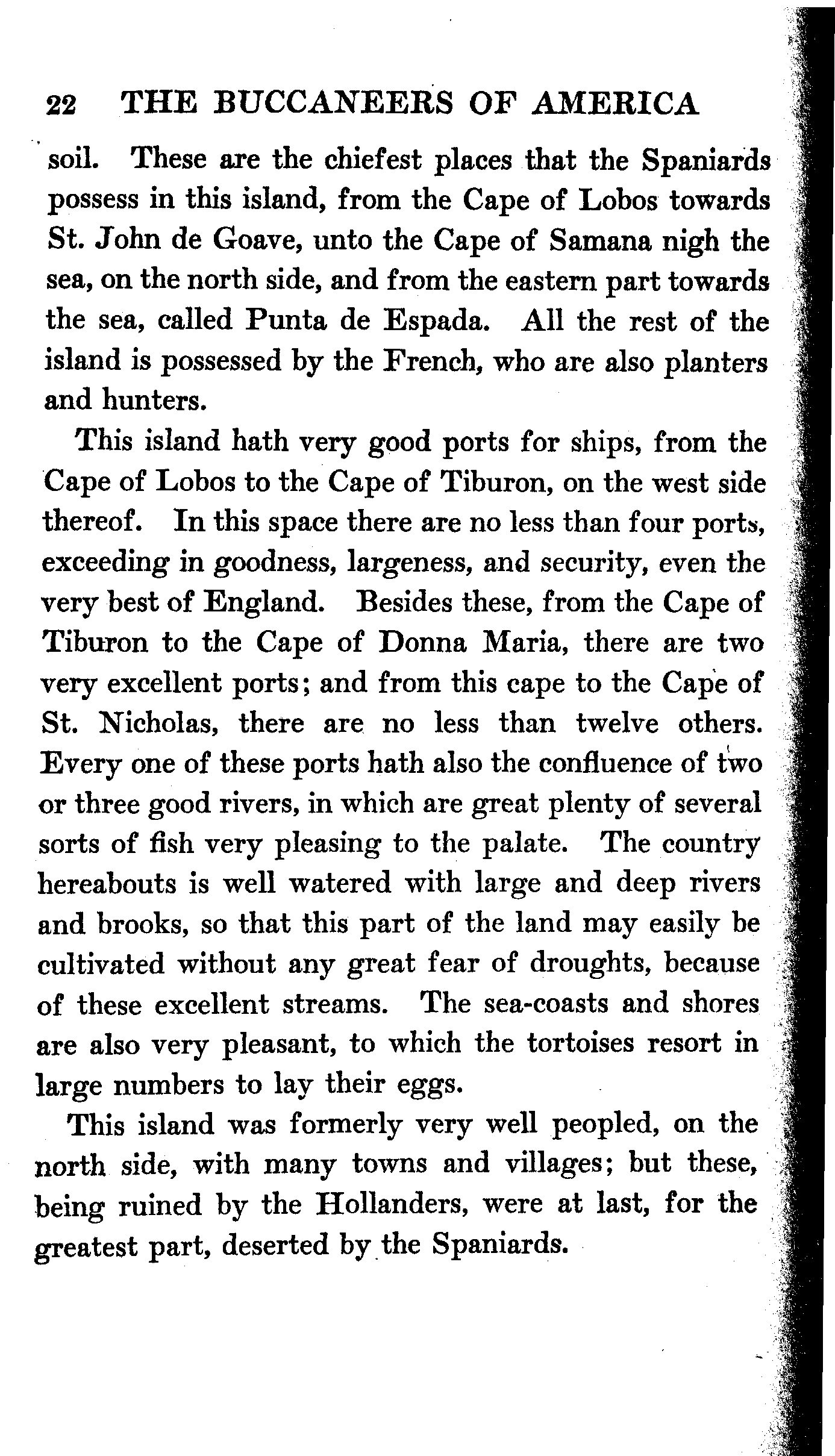 This island hath very good ports for ships, from the Cape of Lobos to the Cape of Tiburon, on the west side thereof. In this space there are no less than four ports, exceeding in goodness, largeness, and security, even the very best of England. Besides these, from the Cape of Tiburon to the Cape of Donna Maria, there are two very excellent ports; and from this cape to the Cape of St. Nicholas, there are no less than twelve others. Every one of these ports hath also the confluence of two or three good rivers, in which are great plenty of several sorts of fish very pleasing to the palate. The country hereabouts is well watered with large and deep rivers and brooks, so that this part of the land may easily be cultivated without any great fear of droughts, because of these excellent streams. The sea-coasts and shores are also very pleasant, to which the tortoises resort in large numbers to lay their eggs.