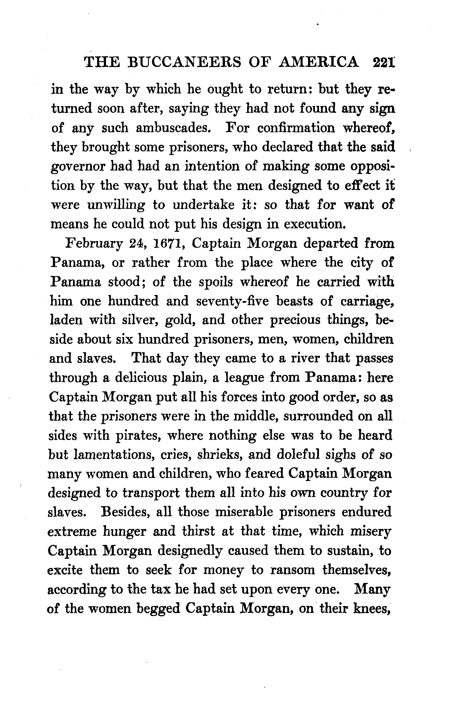 February 24, 1671, Captain Morgan departed from Panama, or rather from the place where the city of Panama stood; of the spoils whereof he carried with him one hundred and seventy-five beasts of carriage, laden with silver, gold, and other precious things, beside about six hundred prisoners, men, women, children and slaves. That day they came to a river that passes through a delicious plain, a league from Panama: here Captain Morgan put all his forces into good order, so as that the prisoners were in the middle, surrounded on all sides with pirates, where nothing else was to be heard but lamentations, cries, shrieks, and doleful sighs of so many women and children, who feared Captain Morgan designed to transport them all into his own country for slaves. Besides, all those miserable prisoners endured extreme hunger and thirst at that time, which misery Captain Morgan designedly caused them to sustain, to excite them to seek for money to ransom themselves, according to the tax he had set upon every one. Many of the women begged Captain Morgan, on their knees,[222] with infinite sighs and tears, to let them return to Panama, there to live with their dear husbands and children in little huts of straw, which they would erect, seeing they had no houses till the rebuilding of the city. But his answer was, "He came not thither to hear lamentations and cries, but to seek money: therefore they ought first to seek out that, wherever it was to be had, and bring it to him; otherwise he would assuredly transport them all to such places whither they cared not to go."