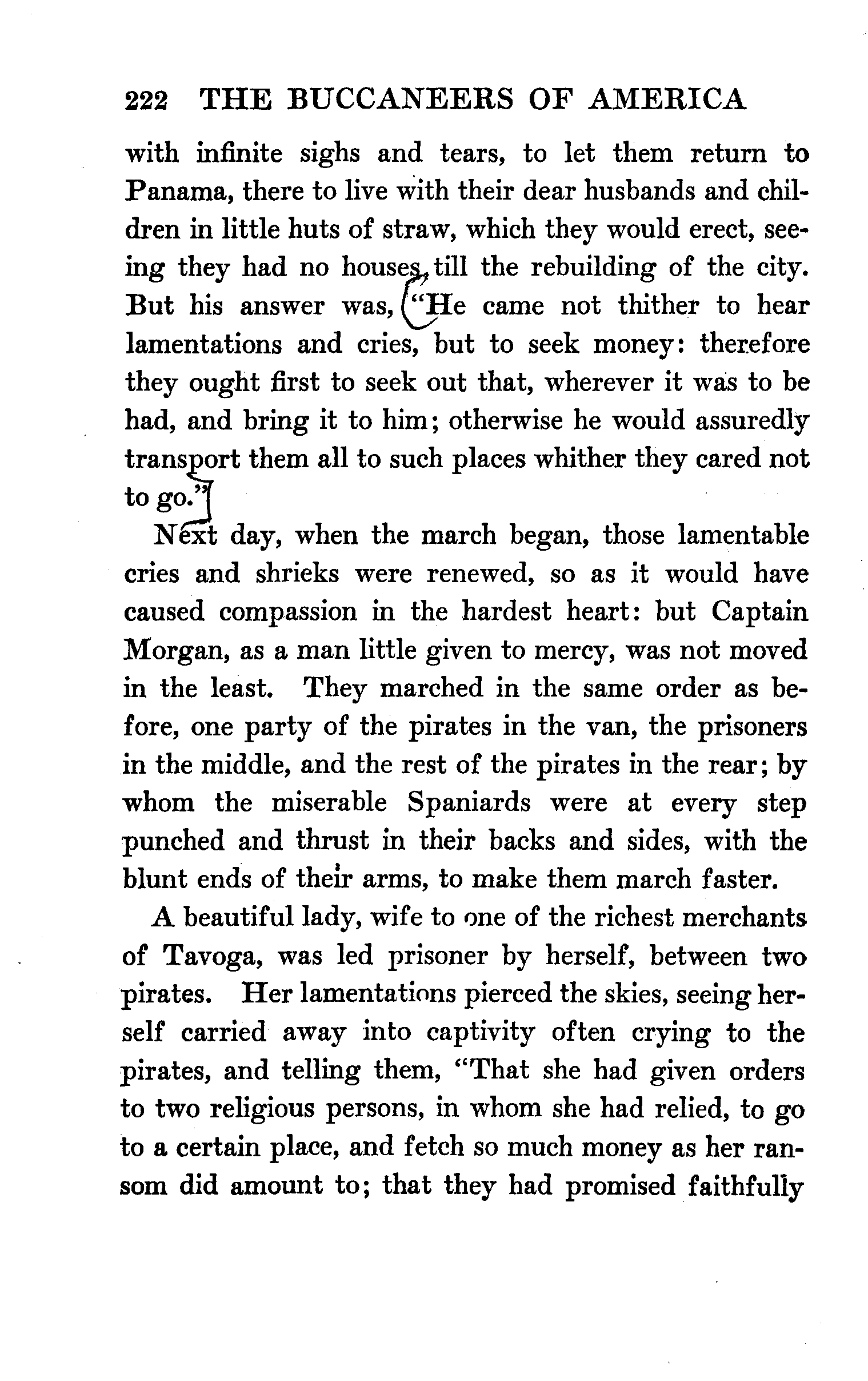 A beautiful lady, wife to one of the richest merchants of Tavoga, was led prisoner by herself, between two pirates. Her lamentations pierced the skies, seeing herself carried away into captivity often crying to the pirates, and telling them, "That she had given orders to two religious persons, in whom she had relied, to go to a certain place, and fetch so much money as her ransom did amount to; that they had promised faithfully[223] to do it, but having obtained the money, instead of bringing it to her, they had employed it another way, to ransom some of their own, and particular friends." This ill action of theirs was discovered by a slave, who brought a letter to the said lady. Her complaints, and the cause thereof, being brought to Captain Morgan, he thought fit to inquire thereinto. Having found it to be true—especially hearing it confirmed by the confession of the said religious men, though under some frivolous exercises of having diverted the money but for a day or two, in which time they expected more sums to repay it—he gave liberty to the said lady, whom otherwise he designed to transport to Jamaica. But he detained the said religious men as prisoners in her place, using them according to their deserts.
