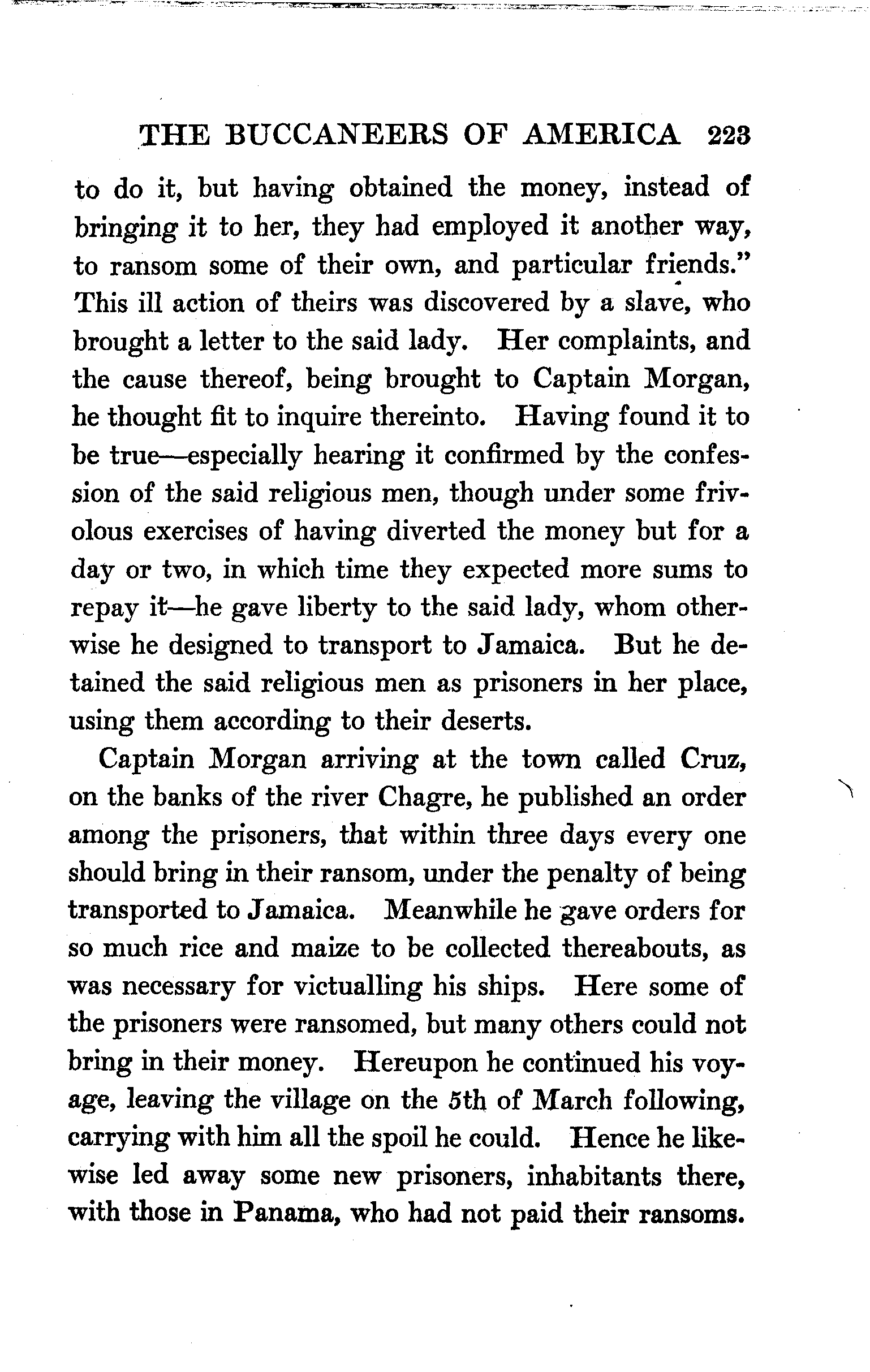 Captain Morgan arriving at the town called Cruz, on the banks of the river Chagre, he published an order among the prisoners, that within three days every one should bring in their ransom, under the penalty of being transported to Jamaica. Meanwhile he gave orders for so much rice and maize to be collected thereabouts, as was necessary for victualling his ships. Here some of the prisoners were ransomed, but many others could not bring in their money. Hereupon he continued his voyage, leaving the village on the 5th of March following, carrying with him all the spoil he could. Hence he likewise led away some new prisoners, inhabitants there, with those in Panama, who had not paid their ransoms.[224] But the two religious men, who had diverted the lady's money, were ransomed three days after by other persons, who had more compassion for them than they had showed for her.