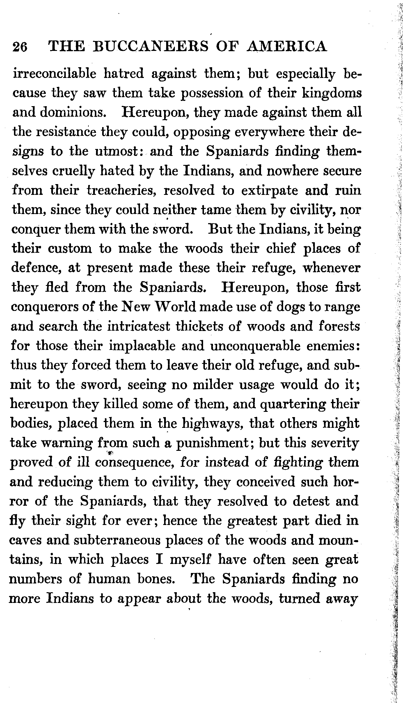 I know some persons have objected against the greatness of these prodigious Adventures, intimating that the resistance our Bucaniers found in America, was everywhere but small. For the Spaniards, say they, in the West Indies, are become of late years nothing less, but rather much more degenerate than in Europe. The continual Peace they have enjoyed in those parts, the defect of Military Discipline, and European souldiers for their Commanders, much contributing hereunto. But more especially, and above all other reasons, the very luxury of the Soil and Riches, the extreme heat of those Countries, and influence of the Stars being such, as totally inclineth their bodies unto an infinite effeminacy and cowardize of minds.