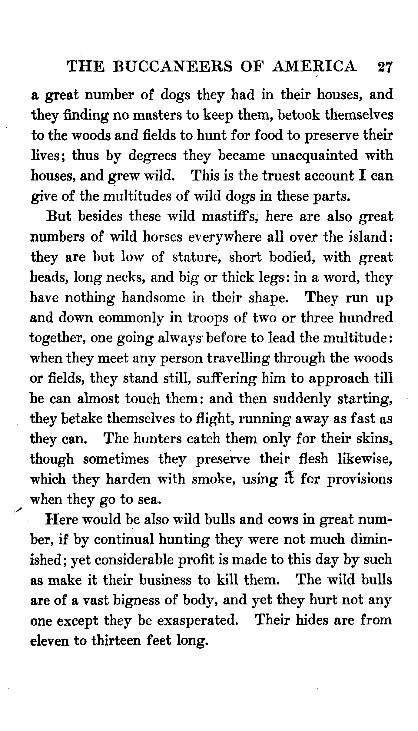 The French having settled in the isle of St. Christopher, planted there a sort of trees, of which, at present, there possibly may be greater quantities; with the timber whereof they made long-boats, and hoys, which they sent thence westward, well manned and victualled, to discover other islands. These setting sail from St. Christopher, came within sight of Hispaniola, where they arrived with abundance of joy. Having landed, they marched into the country, where they found large quantities of cattle; such as cows, bulls, horses, and wild boars: but finding no great profit in these animals, unless they could enclose them, and knowing, likewise, the island to be pretty well peopled by the Spaniards, they thought it convenient to enter upon and seize the island of Tortuga. This they performed without any difficulty, there being upon the island no more than ten or twelve Spaniards to guard it. These few men let the French come in peaceably, and possess the island for six months, without any trouble; meanwhile they passed and repassed, with their canoes, to Hispaniola, from whence they transported many people, and at last began to plant the whole island of Tortuga. The few Spaniards remaining there, perceiving the French to increase their number daily, began, at last, to repine at their prosperity, and grudge them the possession: hence they gave notice to others of their nation, their neighbours, who sent several boats, well armed and manned, to dispossess the French. This expedition succeeded accord[12]ing to their desires; for the new possessors, seeing the great number of Spaniards, fled with all they had to the woods, and hence, by night, they wafted over with canoes to the island of Hispaniola: this they the more easily performed, having no women or children with them, nor any great substance to carry away. Here they also retired into the woods, both to seek for food, and from thence, with secrecy, to give intelligence to others of their own faction; judging for certain, that within a little while they should be in a capacity to hinder the Spaniards from fortifying in Tortuga.
