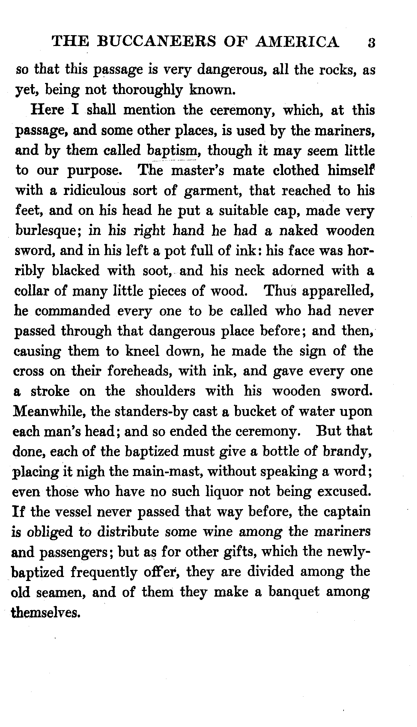Here I shall mention the ceremony, which, at this passage, and some other places, is used by the mariners, and by them called baptism, though it may seem little to our purpose. The master's mate clothed himself with a ridiculous sort of garment, that reached to his feet, and on his head he put a suitable cap, made very burlesque; in his right hand he had a naked wooden sword, and in his left a pot full of ink: his face was horribly blacked with soot, and his neck adorned with a collar of many little pieces of wood. Thus apparelled, he commanded every one to be called who had never passed through that dangerous place before; and then, causing them to kneel down, he made the sign of the cross on their foreheads, with ink, and gave every one a stroke on the shoulders with his wooden sword. Meanwhile, the standers-by cast a bucket of water upon each man's head; and so ended the ceremony. But that done, each of the baptized must give a bottle of brandy, placing it nigh the main-mast, without speaking a word; even those who have no such liquor not being excused. If the vessel never passed that way before, the captain is obliged to distribute some wine among the mariners and passengers; but as for other gifts, which the newly-baptized frequently offer, they are divided among the old seamen, and of them they make a banquet among themselves.[4]
