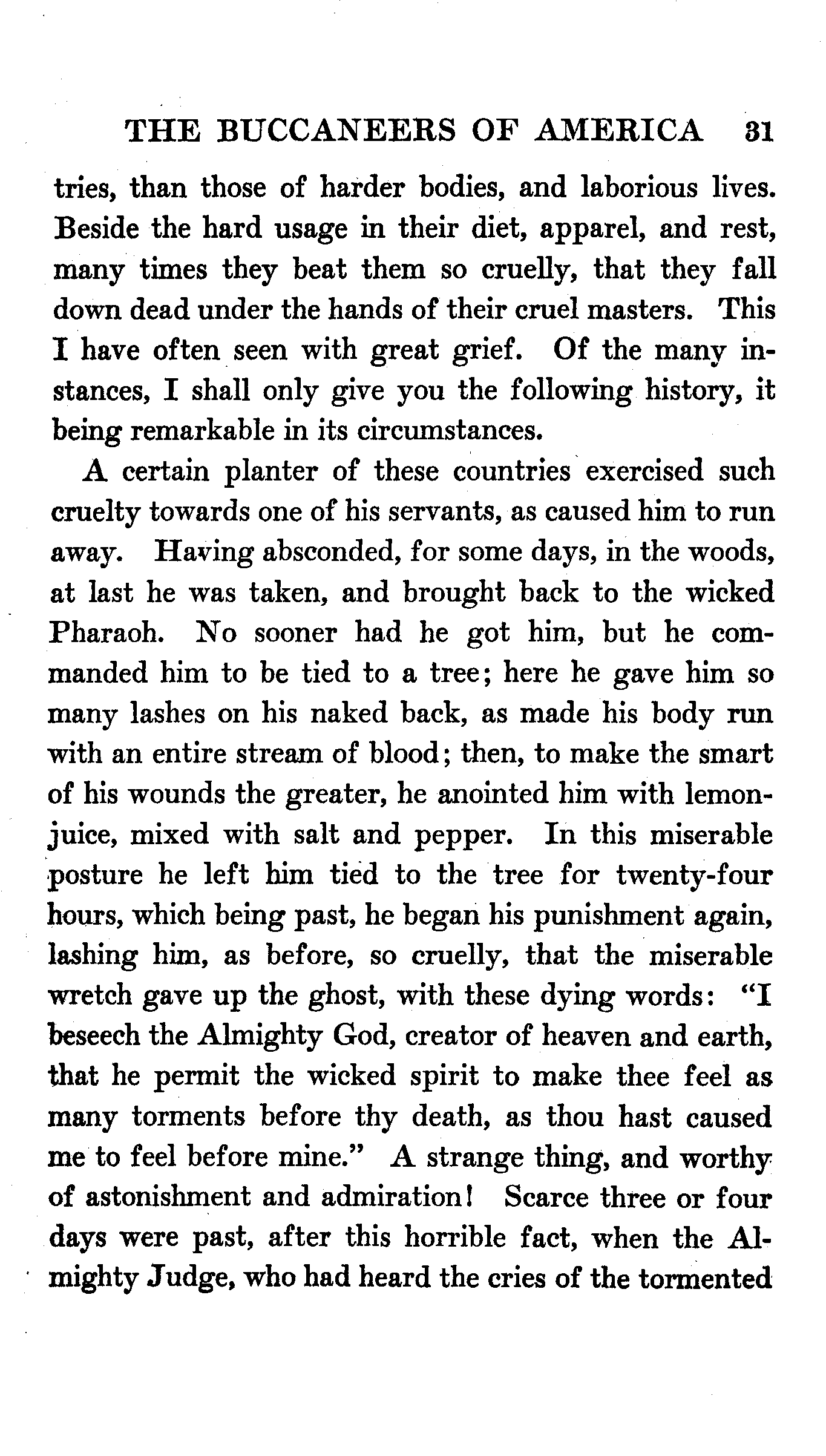 On this occasion I was also sold, being a servant under the said company in whose service I left France: but my fortune was very bad, for I fell into the hands of the most cruel and perfidious man that ever was born, who was then governor, or rather lieutenant-general, of that island. This man treated me with all the hard usage imaginable, yea, with that of hunger, with which I thought I should have perished inevitably. Withal, he was willing to let me buy my freedom and liberty, but not under the rate of three hundred pieces of eight, I not being master of one at a time in the world. At last, through the manifold miseries I endured, as also affliction of mind, I was thrown into a dangerous sickness. This misfortune, added to the rest, was the cause of my happiness: for my wicked master, seeing my condition, began to fear lest he should lose his monies with my life. Hereupon he sold me a second time to a surgeon, for seventy pieces of eight. Being with this second master, I began soon to recover my health through the good usage I received, he being much more humane and civil than my first patron. He gave me both clothes and very good food; and after I had served him but one year,[18] he offered me my liberty, with only this condition, that I should pay him one hundred pieces of eight when I was in a capacity so to do; which kind proposal of his I could not but accept with infinite joy and gratitude.