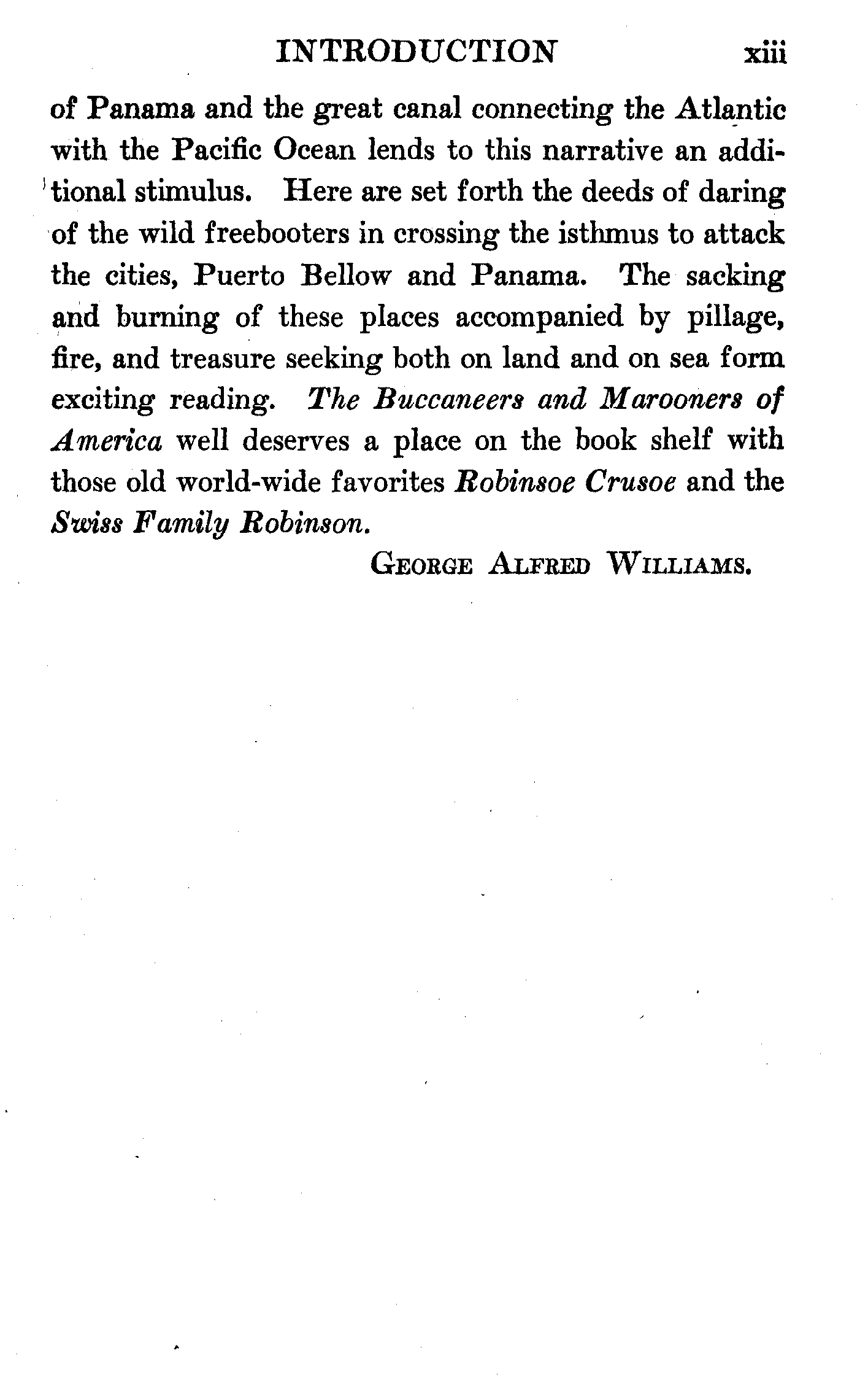 The world wide attention at this time in the Isthmus[xiii] of Panama and the great canal connecting the Atlantic with the Pacific Ocean lends to this narrative an additional stimulus. Here are set forth the deeds of daring of the wild freebooters in crossing the isthmus to attack the cities, Puerto Bellow and Panama. The sacking and burning of these places accompanied by pillage, fire, and treasure seeking both on land and on sea form exciting reading. The Buccaneers and Marooners of America well deserves a place on the book shelf with those old world-wide favorites Robinson Crusoe and the Swiss Family Robinson.