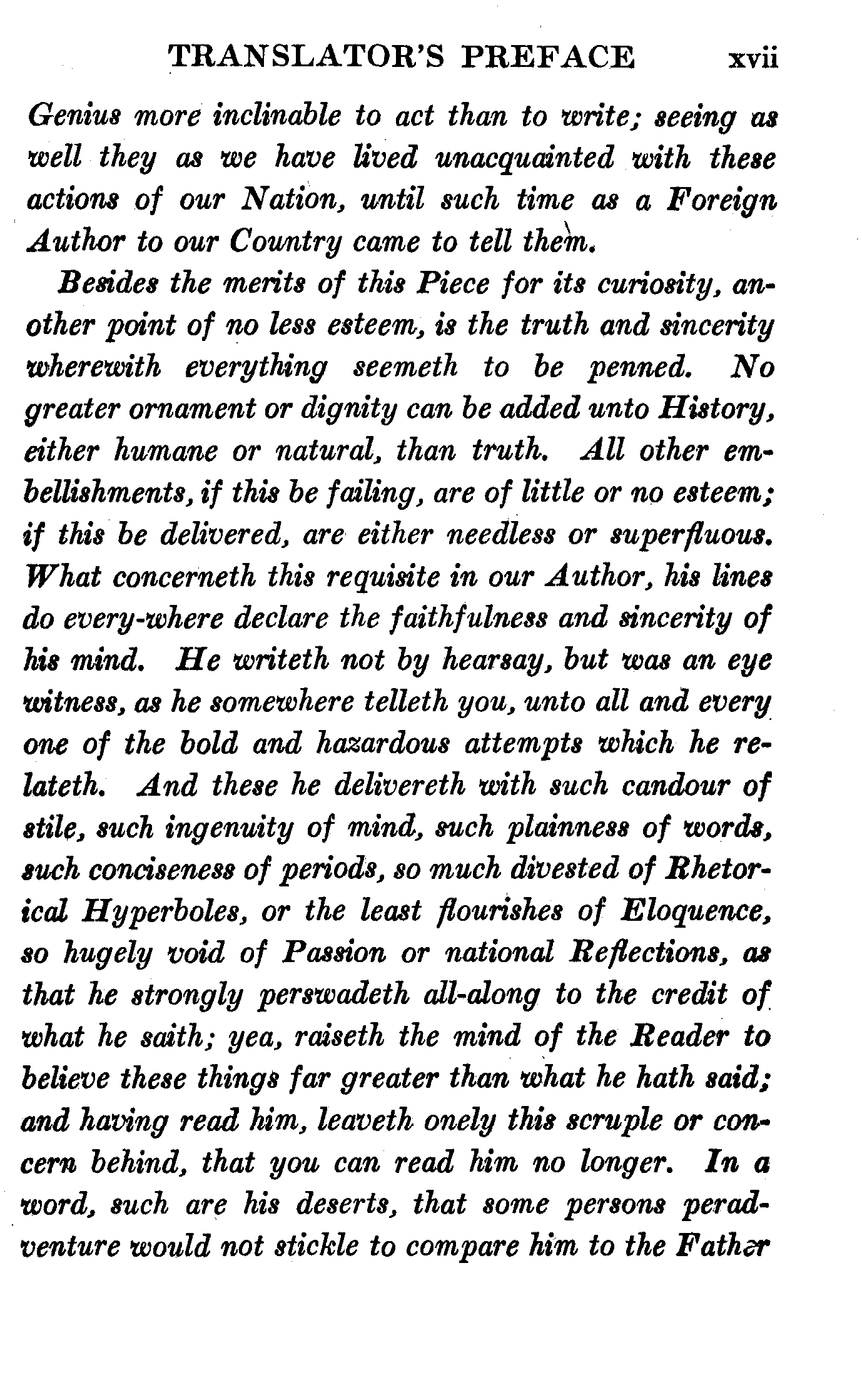 Besides the merits of this Piece for its curiosity, another point of no less esteem, is the truth and sincerity wherewith everything seemeth to be penned. No greater ornament or dignity can be added unto History, either humane or natural, than truth. All other embellishments, if this be failing, are of little or no esteem; if this be delivered, are either needless or superfluous. What concerneth this requisite in our Author, his lines do everywhere declare the faithfulness and sincerity of his mind. He writeth not by hearsay, but was an eye witness, as he somewhere telleth you, unto all and every one of the bold and hazardous attempts which he relateth. And these he delivereth with such candour of stile, such ingenuity of mind, such plainness of words, such conciseness of periods, so much divested of Rhetorical Hyperboles, or the least flourishes of Eloquence, so hugely void of Passion or national Reflections, as that he strongly perswadeth all-along to the credit of what he saith; yea, raiseth the mind of the Reader to believe these things far greater than what he hath said; and having read him, leaveth onely this scruple or concern behind, that you can read him no longer. In a word, such are his deserts, that some persons peradventure would not stickle to compare him to the Father[xviii] of Historians, Philip de Comines; at least thus much may be said, with all truth imaginable, that he resembleth that great Author in many of his excellent qualities.