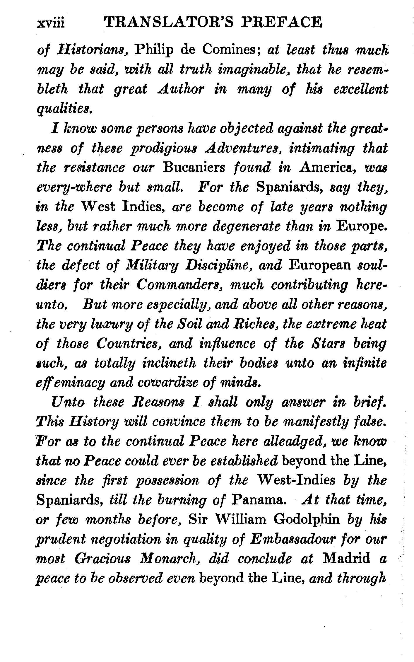 Unto these Reasons I shall only answer in brief. This History will convince them to be manifestly false. For as to the continual Peace here alleadged, we know that no Peace could ever be established beyond the Line, since the first possession of the West-Indies by the Spaniards, till the burning of Panama. At that time, or few months before, Sir William Godolphin by his prudent negotiation in quality of Embassadour for our most Gracious Monarch, did conclude at Madrid a peace to be observed even beyond the Line, and through[xix] the whole extent of the Spanish Dominions in the West-Indies. This transaction gave the Spaniards new causes of complaints against our proceedings, that no sooner a Peace had been established for those parts of America, but our forces had taken and burnt both Chagre, St. Catherine, and Panama. But our reply was convincing, That whereas eight or ten months of time had been allowed by Articles for the publishing of the said Peace through all the Dominions of both Monarchies in America, those Hostilities had been committed, not onely without orders from his Majesty of England, but also within the space of the said eight or ten months of time. Until that time the Spanish Inhabitants of America being, as it were, in a perpetual War with Europe, certain it is that no Coasts nor Kingdoms in the World have been more frequently infested nor alarm'd with the invasions of several Nations than theirs. Thus from the very beginning of their Conquests in America, both English, French, Dutch Portuguese, Swedes, Danes, Curlanders, and all other nations that navigate the Ocean, have frequented the West-Indies, and filled them with their robberies and Assaults. From these occasions have they been in continual watch and ward, and kept their Militia in constant exercise, as also their Garrisons pretty well provided and paid; as fearing every sail they discovered at Sea, to be Pirats of one Nation or another. But much more especially, since that Curasao, Tortuga, and Jamaica have been[xx] inhabited by English, French, and Dutch, and bred up that race of Hunts-men, than which, no other ever was more desperate, nor more mortal enemies to the Spaniards, called Bucaniers. Now shall we say, that these People, through too long continuation of Peace, have utterly abolished the exercises of War, having been all-along incessantly vexed with the Tumults and Alarms thereof?