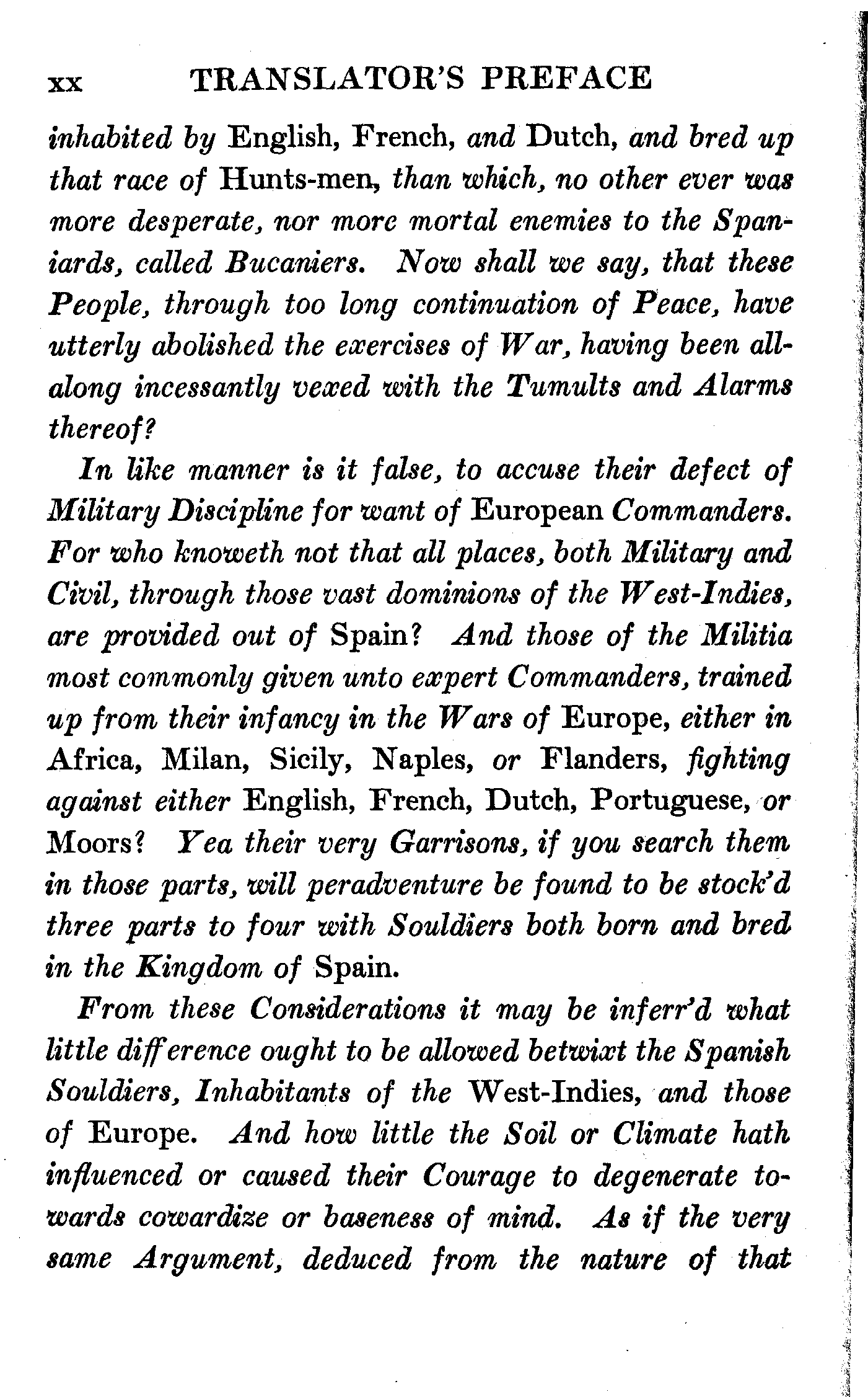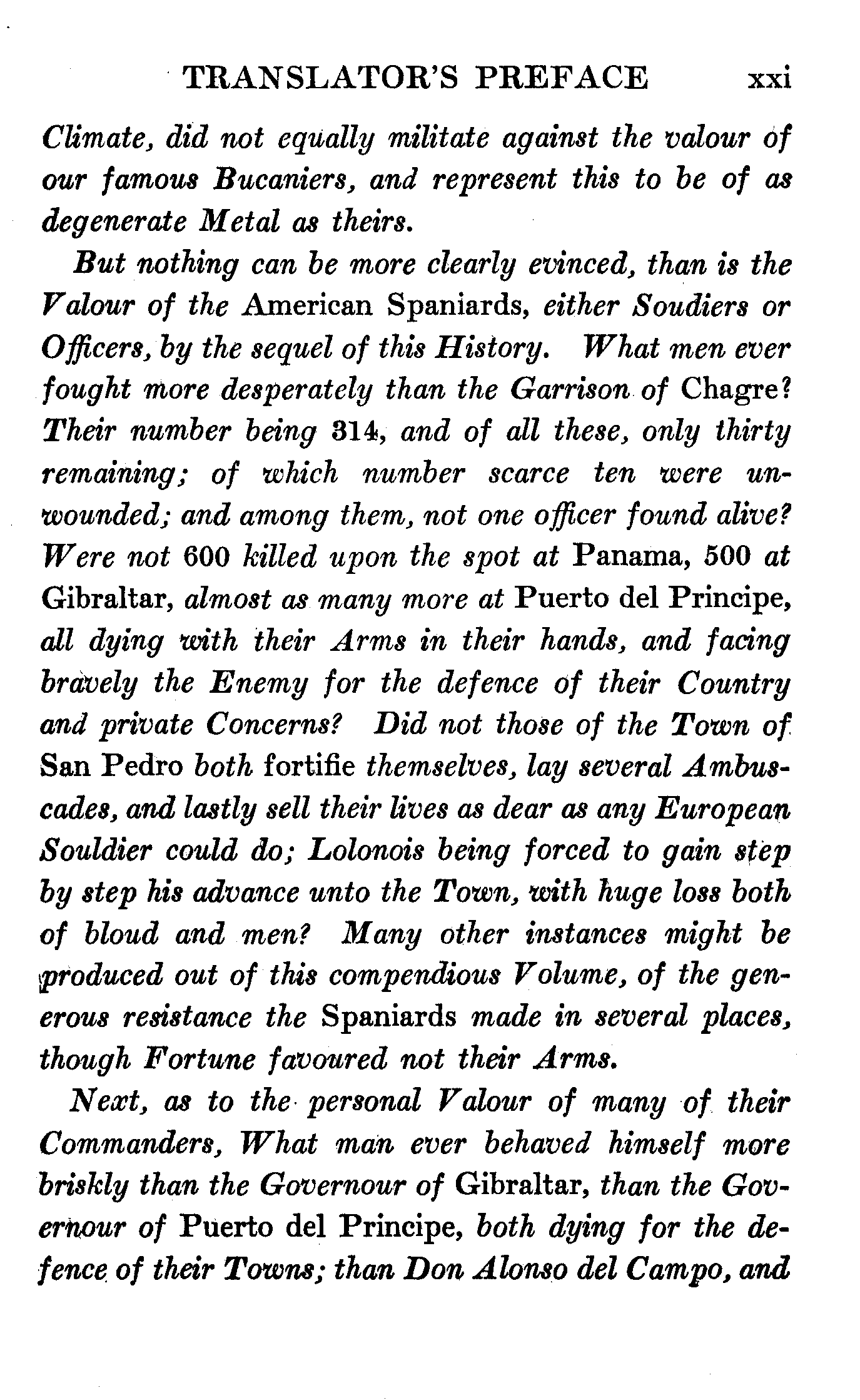 From these Considerations it may be inferr'd what little difference ought to be allowed betwixt the Spanish Souldiers, Inhabitants of the West-Indies, and those of Europe. And how little the Soil or Climate hath influenced or caused their Courage to degenerate towards cowardize or baseness of mind. As if the very same Argument, deduced from the nature of that[xxi] Climate, did not equally militate against the valour of our famous Bucaniers, and represent this to be of as degenerate Metal as theirs.