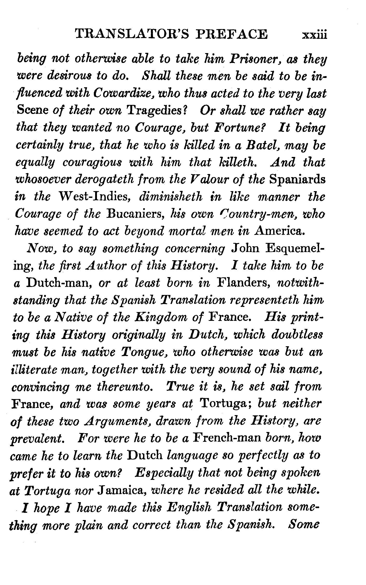 Now, to say something concerning John Esquemeling, the first Author of this History. I take him to be a Dutch-man, or at least born in Flanders, notwithstanding that the Spanish Translation representeth him to be a Native of the Kingdom of France. His printing this History originally in Dutch, which doubtless must be his native Tongue, who otherwise was but an illiterate man, together with the very sound of his name, convincing me thereunto. True it is, he set sail from France, and was some years at Tortuga; but neither of these two Arguments, drawn from the History, are prevalent. For were he to be a French-man born, how came he to learn the Dutch language so perfectly as to prefer it to his own? Especially that not being spoken at Tortuga nor Jamaica, where he resided all the while.