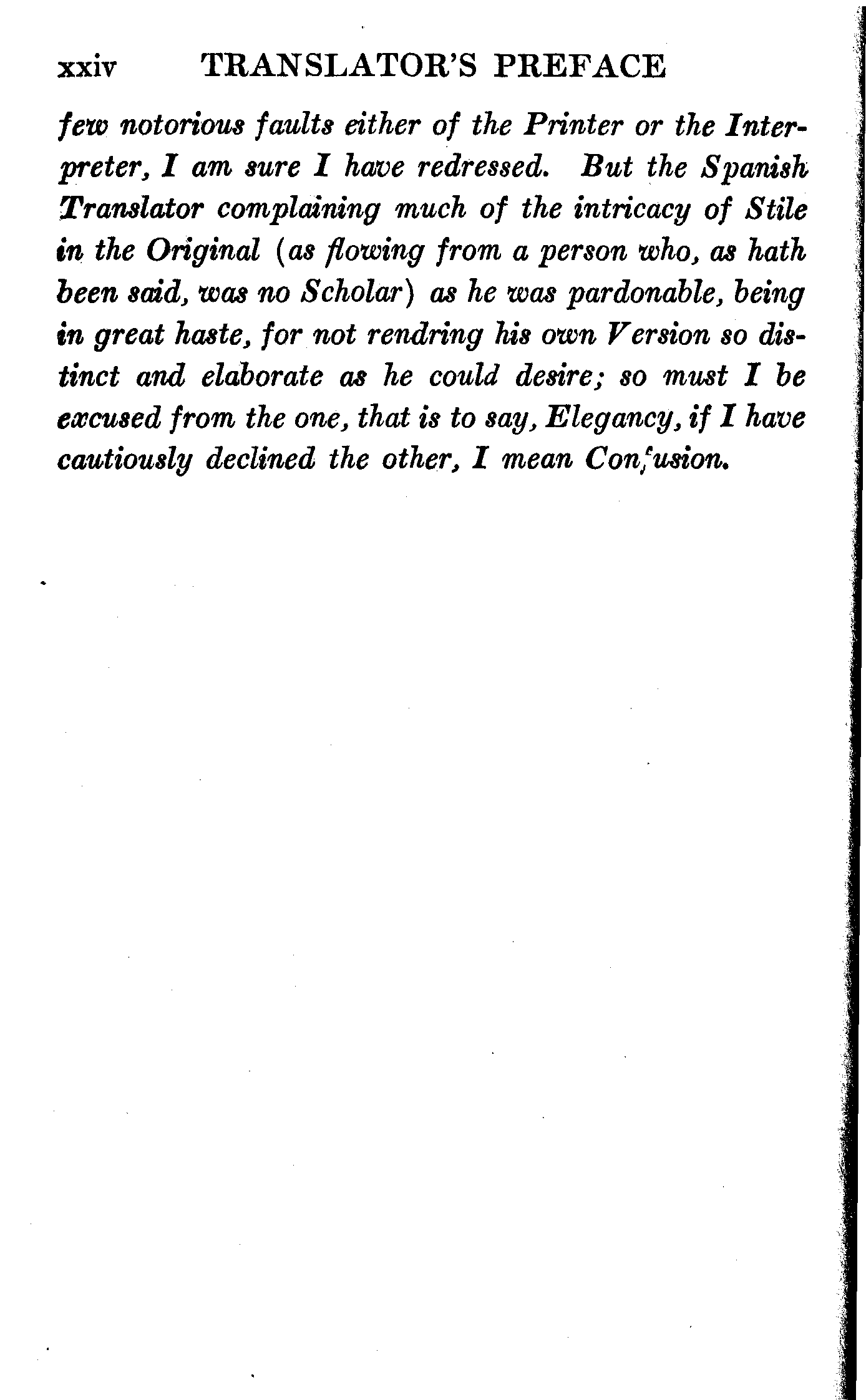 I hope I have made this English Translation something more plain and correct than the Spanish. Some[xxiv] few notorious faults either of the Printer or the Interpreter, I am sure I have redressed. But the Spanish Translator complaining much of the intricacy of Stile in the Original (as flowing from a person who, as hath been said, was no Scholar) as he was pardonable, being in great haste, for not rendring his own Version so distinct and elaborate as he could desire; so must I be excused from the one, that is to say, Elegancy, if I have cautiously declined the other, I mean Confusion.