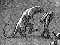 They took away our rifles and brought us right to Kroger and Pat, without our even asking. Jones is mad at the way they got the rifles so easily. When we came upon them (a group of maybe ten, huddling behind a boulder in ambush), he fired, but the shots either bounced off their scales or stuck in their thick hides. Anyway, they took the rifles away and threw them into the stream, and picked us all up and took us into a hole in the cliff wall. The hole went on practically forever, but it didn't get dark. Kroger tells me that there are phosphorescent bacteria living in the mold on the walls. The air has a fresh-dug-grave smell, but it's richer in oxygen than even at the stream.