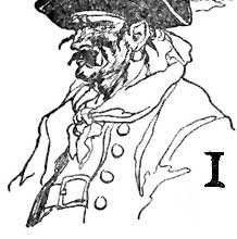 As our hero gazed at the aperture there presently became disclosed to his view the strong and robust figure of one who was evidently of a seafaring habit. From the gold braid upon his hat, the seals dangling from the ribbon at his fob, and a certain particularity of custom, he was evidently one of no small consideration in his profession. He was of a strong and powerful build, with a[235] head set close to his shoulders, and upon a round, short bull neck. He wore a black cravat, loosely tied into a knot, and a red waistcoat elaborately trimmed with gold braid; a leather belt with a brass buckle and hanger, and huge sea boots completed a costume singularly suggestive of his occupation in life. His face was round and broad, like that of a cat, and a complexion stained, by constant exposure to the sun and wind, to a color of newly polished mahogany. But a countenance which otherwise might have been humorous, in this case was rendered singularly repulsive by the fact that his nose had been broken so flat to his face that all that remained to distinguish that feature were two circular orifices where the nostrils should have been. His eyes were by no means so sinister as the rest of his visage, being of a light-gray color and exceedingly vivacious—even good-natured in the merry restlessness of their glance—albeit they were well-nigh hidden beneath a black bush of overhanging eyebrows. When he spoke, his voice was so deep and resonant that it was as though it issued from a barrel rather than from the breast of a human being.