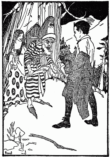 "Begone!" commanded the Gnome to[31] the small bakers, who still stood around curiously watching their cake disappearing down the mouth of a mortal as rapidly as its owner could cram it in; "begone and leave us to enjoy the cake alone!"