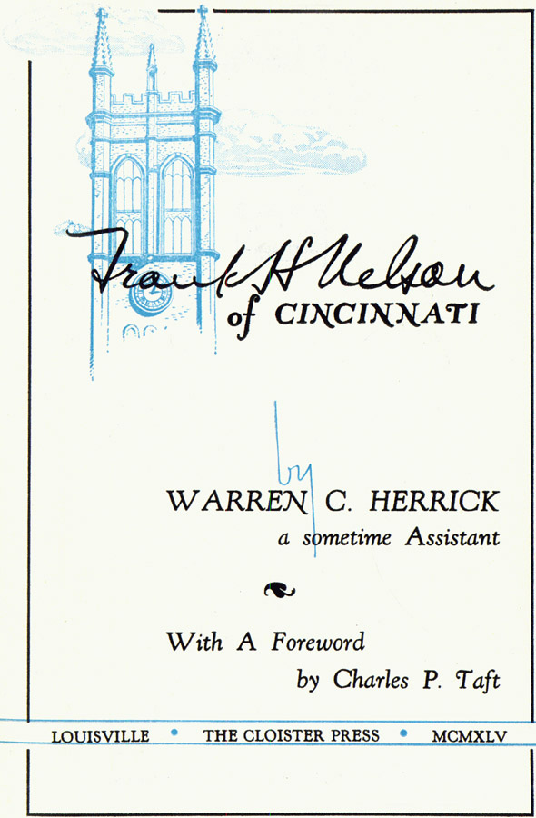 This book is made possible only through the interest and contributions of the many friends of Frank H. Nelson. Space does not permit my mentioning by name all who have furnished me with material, but I do wish to record my gratitude to them. In addition to the years 1925-1928 as Mr. Nelson's assistant I spent two weeks in the autumn of 1943 interviewing a cross-section of Cincinnati and Christ Church. Many business men gladly gave of their time because they enjoyed recounting memories of one whom they loved, and often detained me when I felt I had imposed myself long enough. I noticed also that Mr. Nelson's photograph occupied a place of honor in more than one office as well as in many homes.