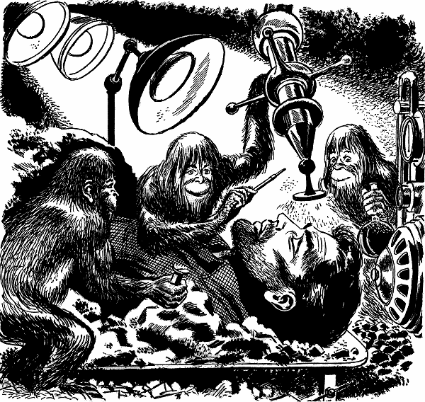 The words themselves, and the way they were assembled, were old, familiar friends. But the tone was wrong. It was high, shrill, parrot-like, and mechanical. Ned's gaze searched for the source of the voice—located the black box just outside of his crystal vat. From that box the voice seemed to have originated. Before it crouched a small, brownish animal with a bulging head. The animal's tiny-fingered paws—hands they were, really—were touching rows of keys.